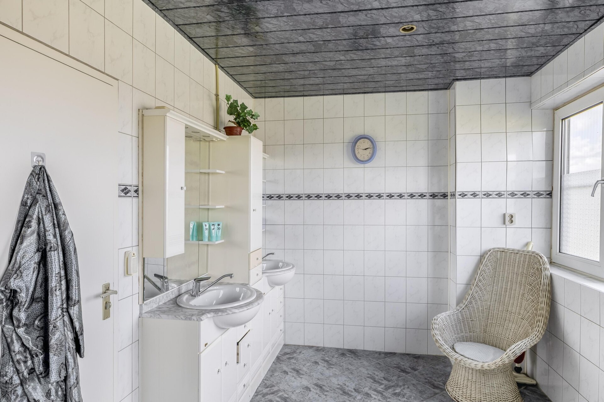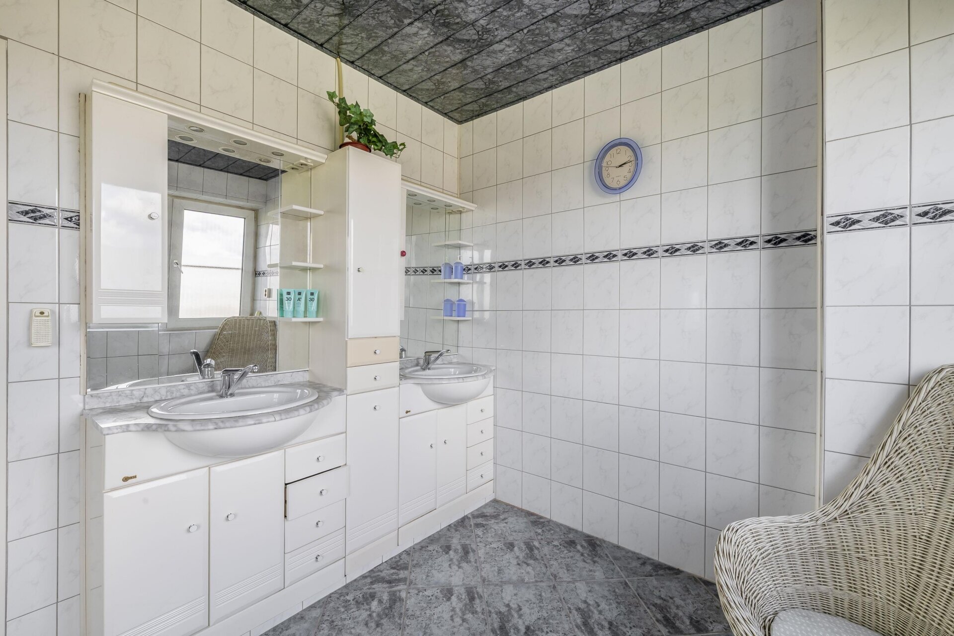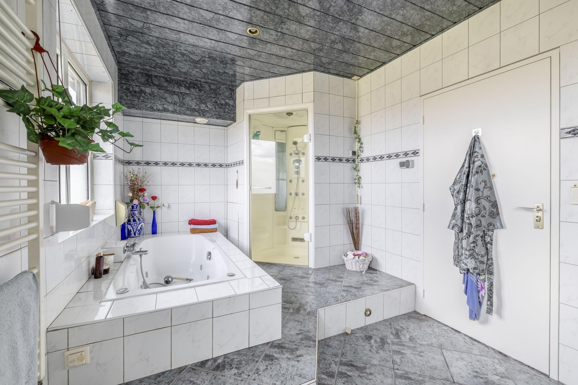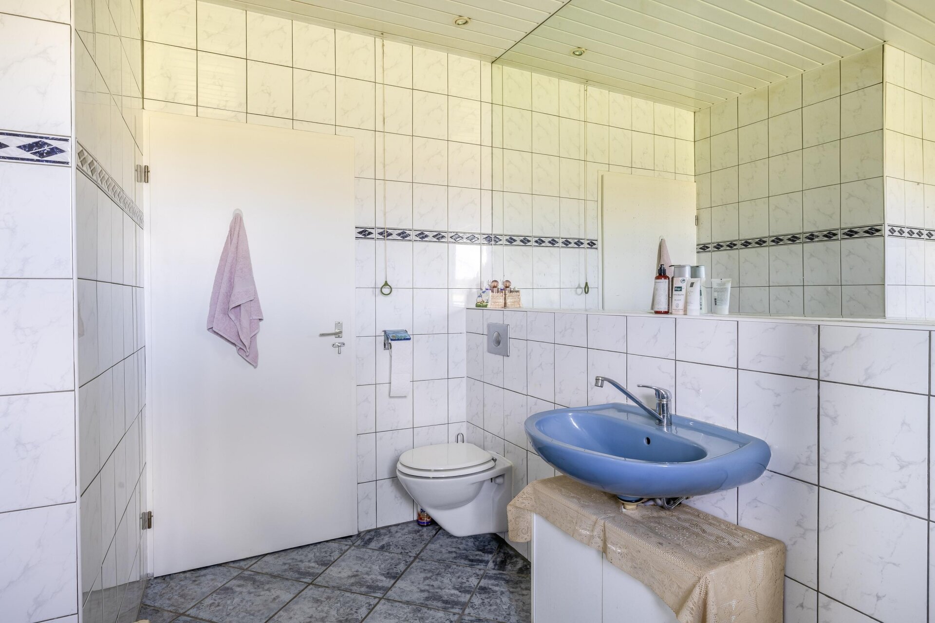 Achterin de woning vind je op de begane grond een badkamer, voorzien van douche, wastafel en toilet, met daarnaast een separaat toilet in de garage. Dat maakt het huis ook geschikt voor wie graag gelijkvloers woont of mantelzorg overweegt.