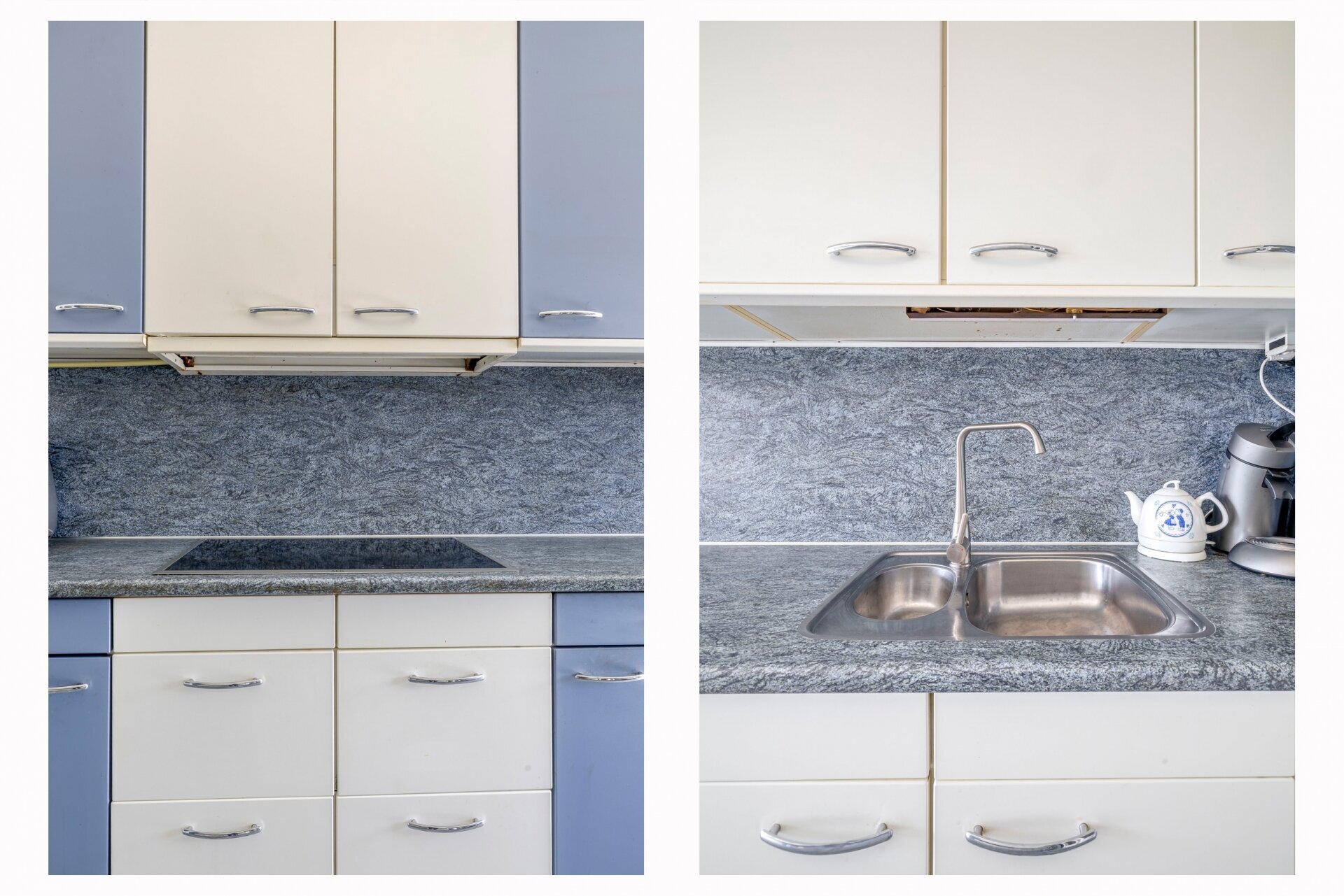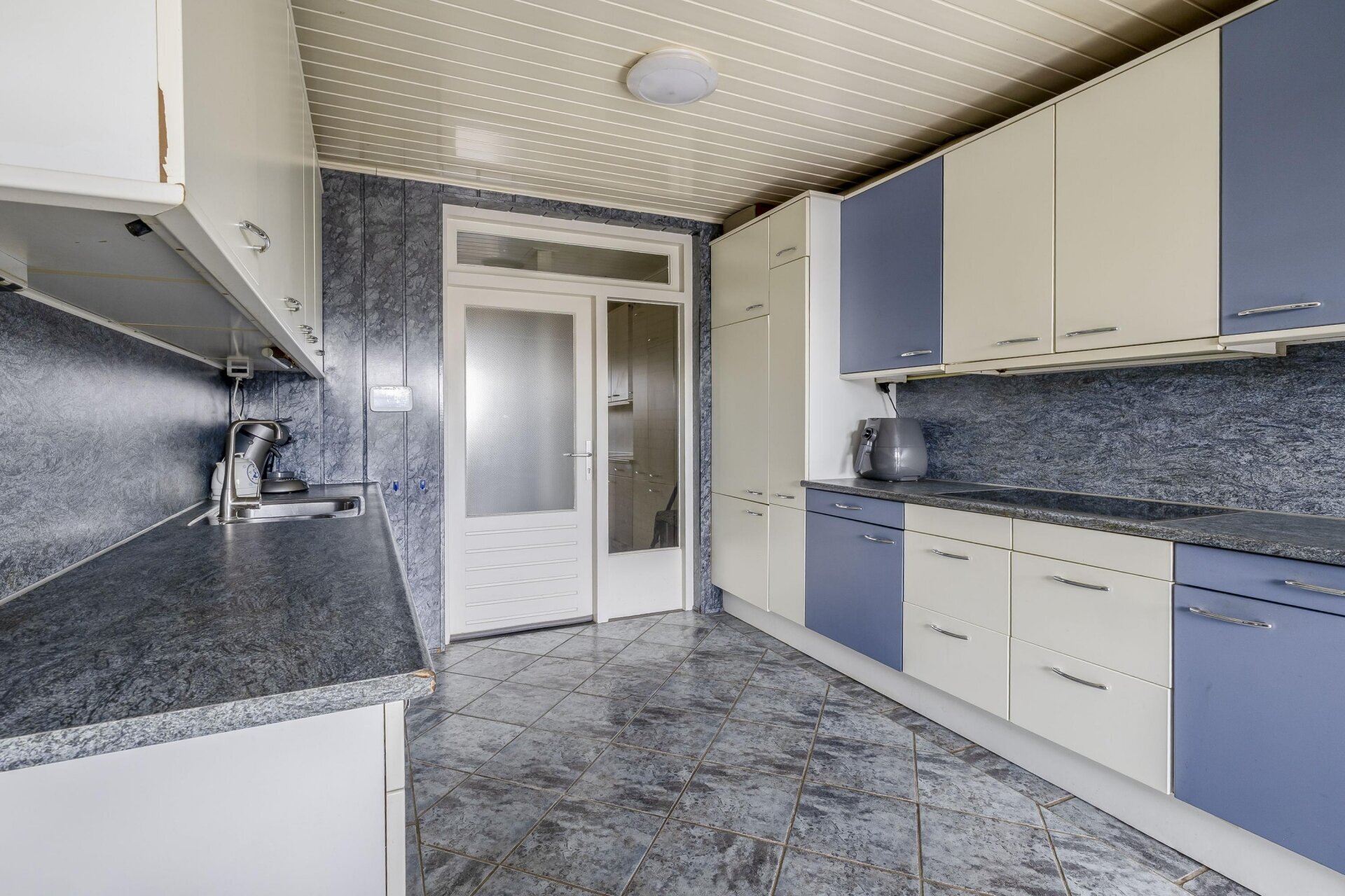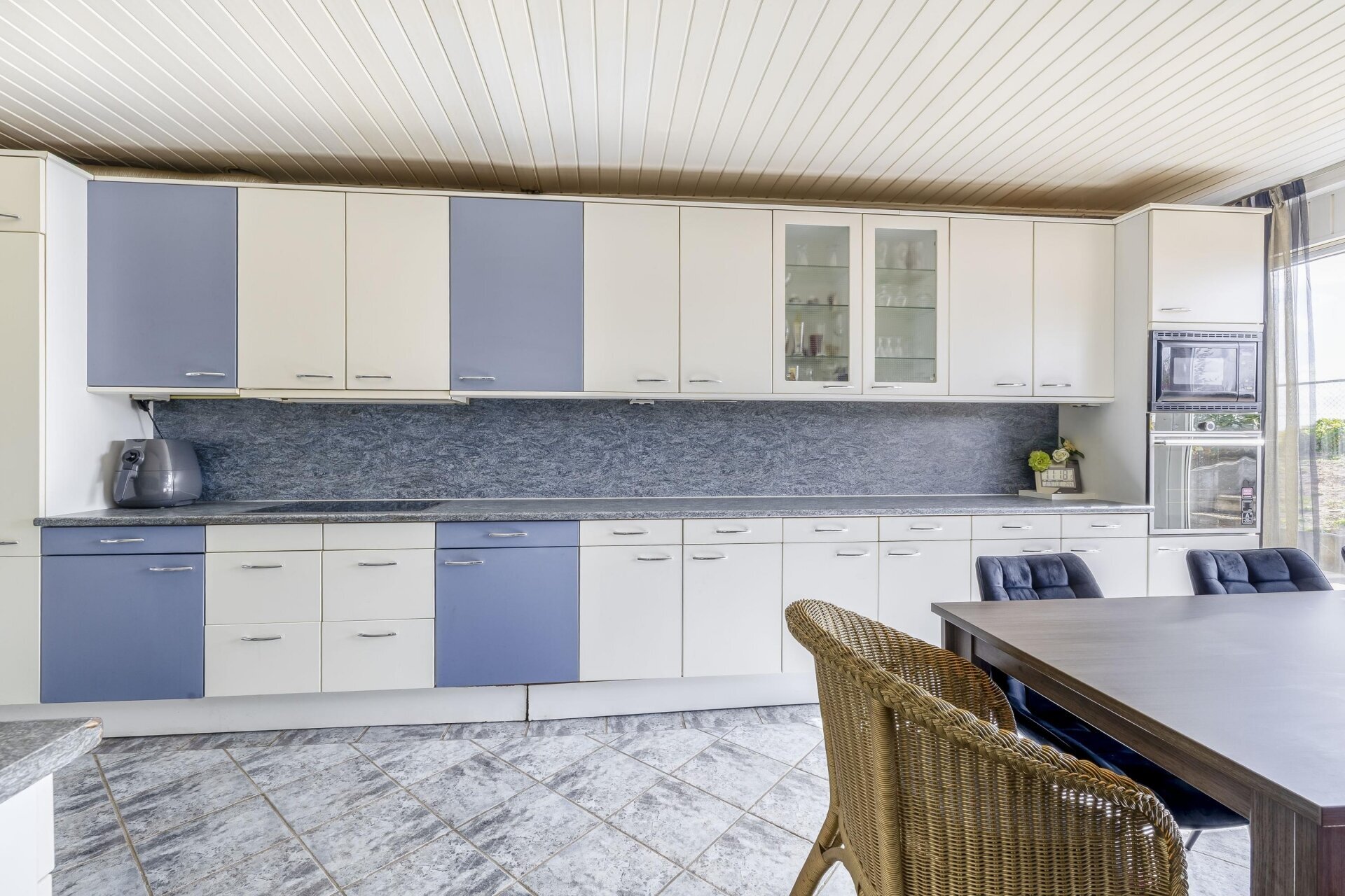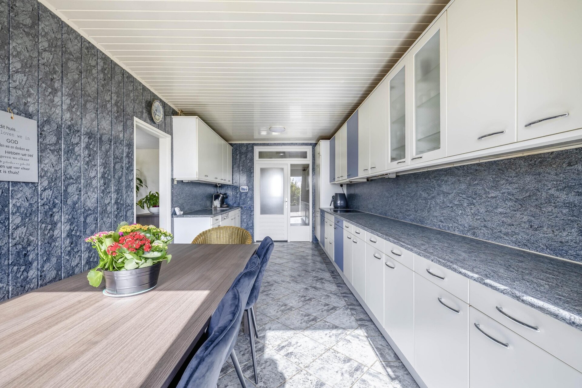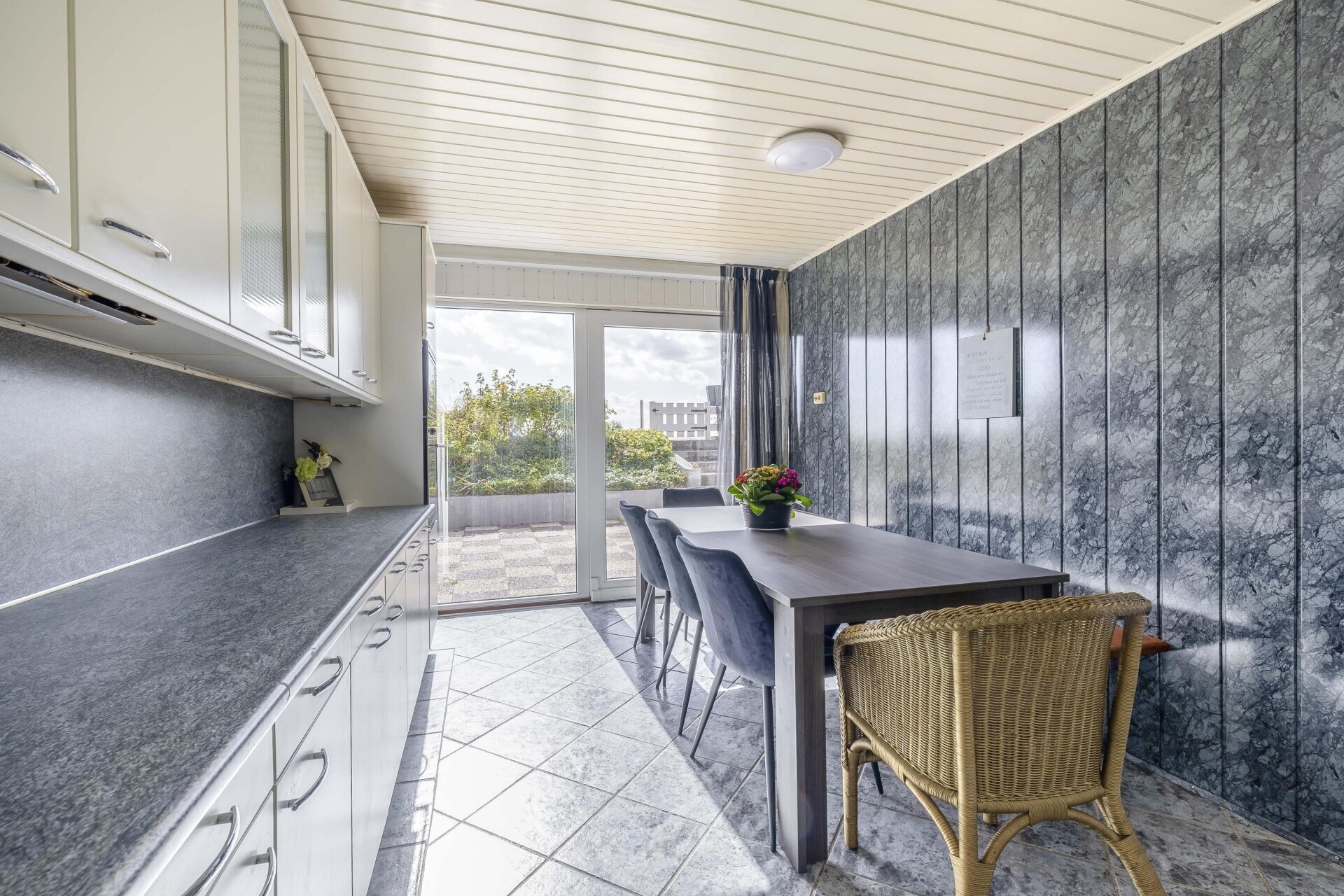 De keuken is dicht en verrassend groot, met aan weerszijden veel kastruimte en werkblad. Door de rechte opstelling is de keuken praktisch in gebruik. Grote raampartijen en de deur naar het terras zorgen voor veel lichtinval en maken van dit deel van het huis een fijne plek om te koken, eten en samen te zijn.