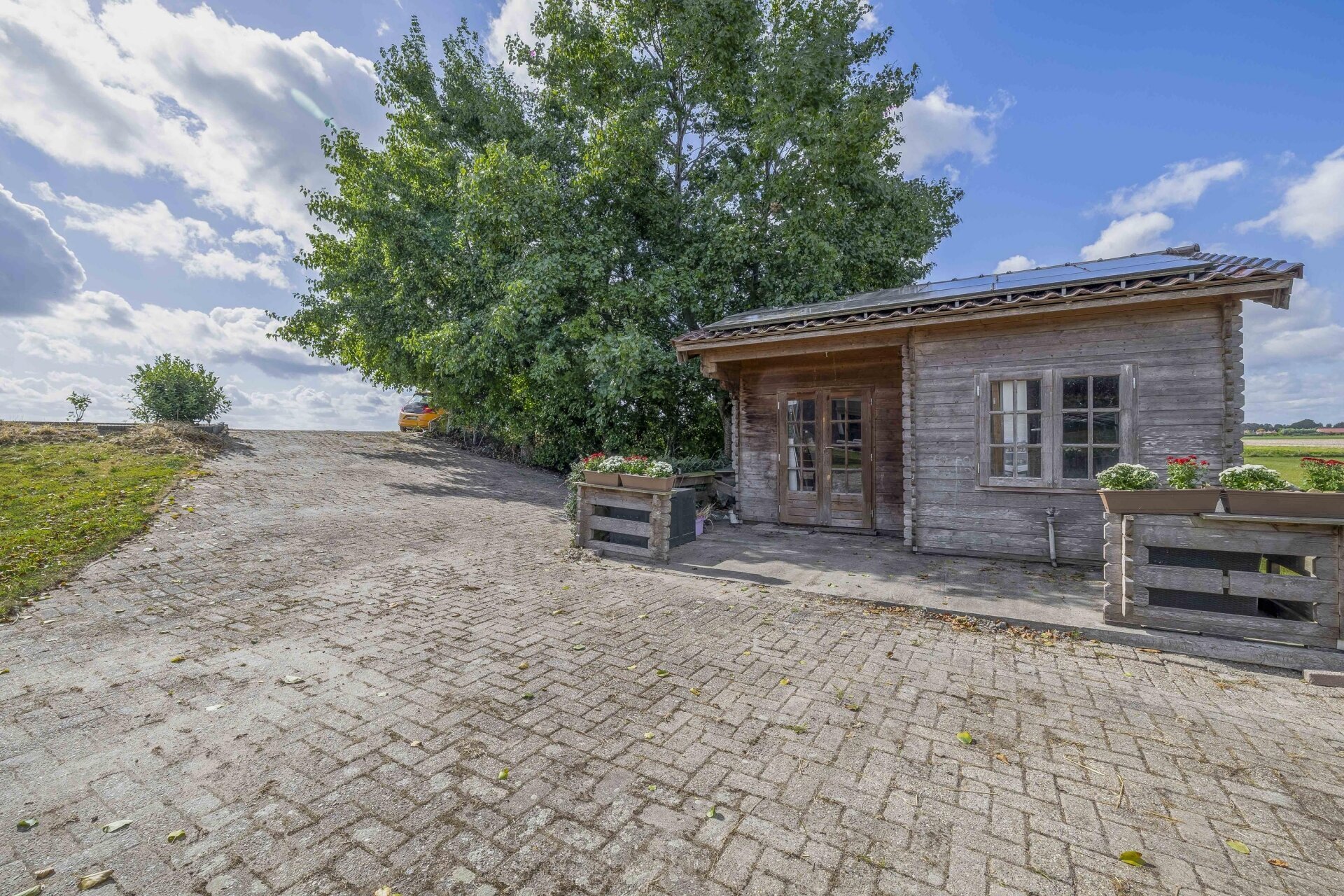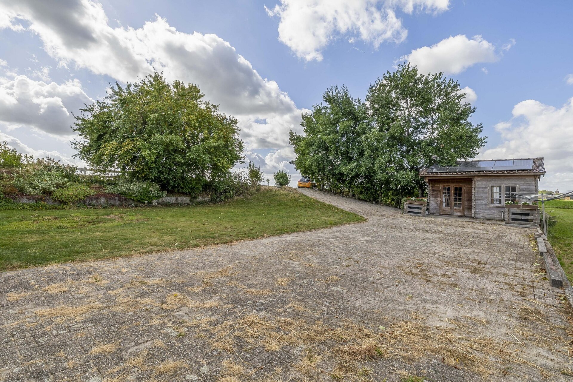 Achterin de tuin vind je nog een houten bijgebouw met veranda, voorzien van zonnepanelen. Dit is nu in gebruik als berging maar zou ook als tuinkamer of gastenverblijf ingericht kunnen worden.