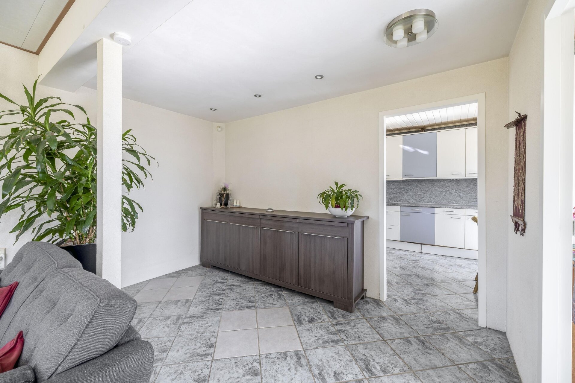 De begane grond is ruim opgezet en biedt directe toegang tot zowel de keuken als de woonkamer. Vanuit de woonkamer kijk je uit over de achtertuin én over de uitgestrekte landerijen die achter het perceel liggen. Dat vrije uitzicht geeft elke dag weer een gevoel van ruimte en rust. De woonkamer zelf is neutraal afgewerkt en biedt genoeg ruimte voor een royale zithoek en een eettafel. Bovendien beschikken de woonkamer, keuken en gang over comfortabele vloerverwarming.