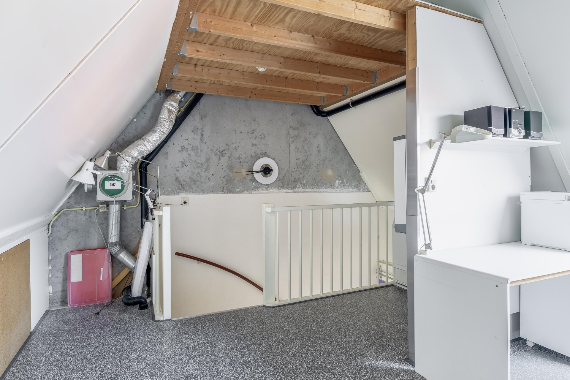 Ruime zolderkamer met dakvenster, bergvliering, bergruimte en opstelplaats wasmachine, droger en CV combiketel.