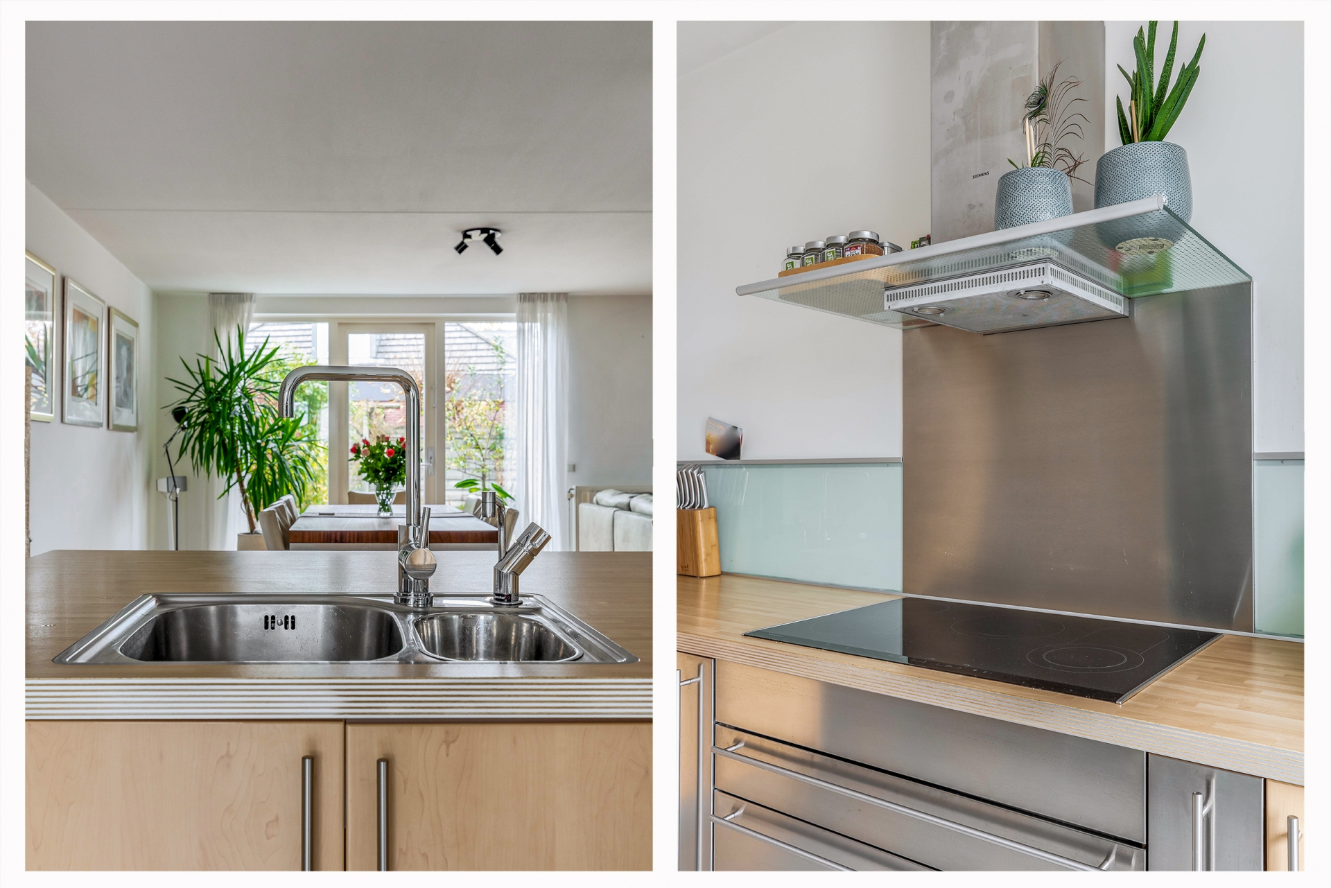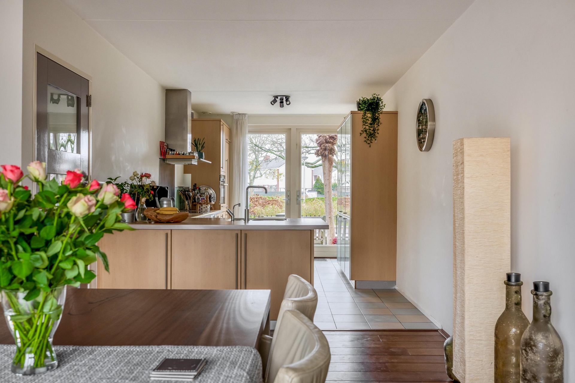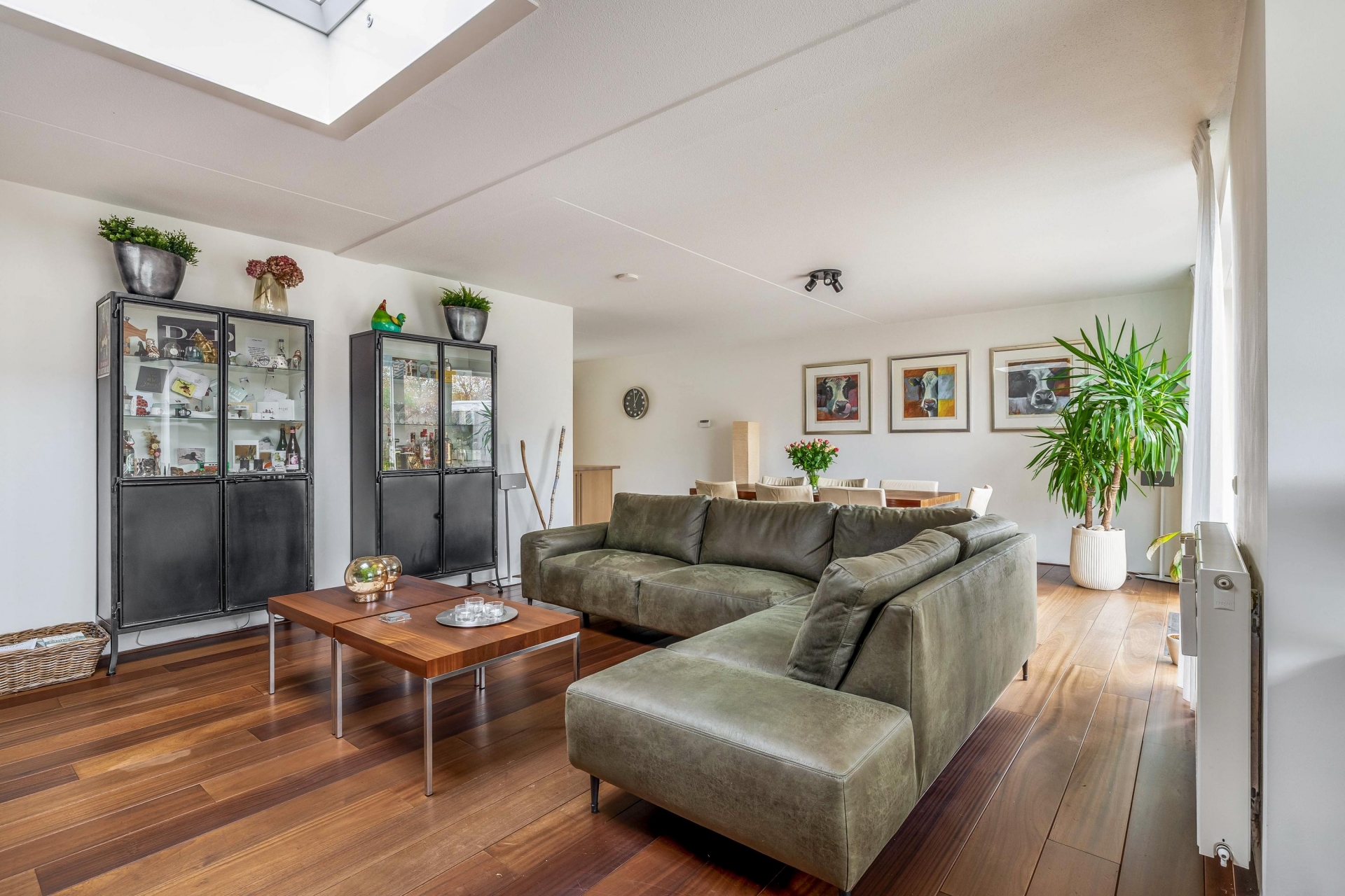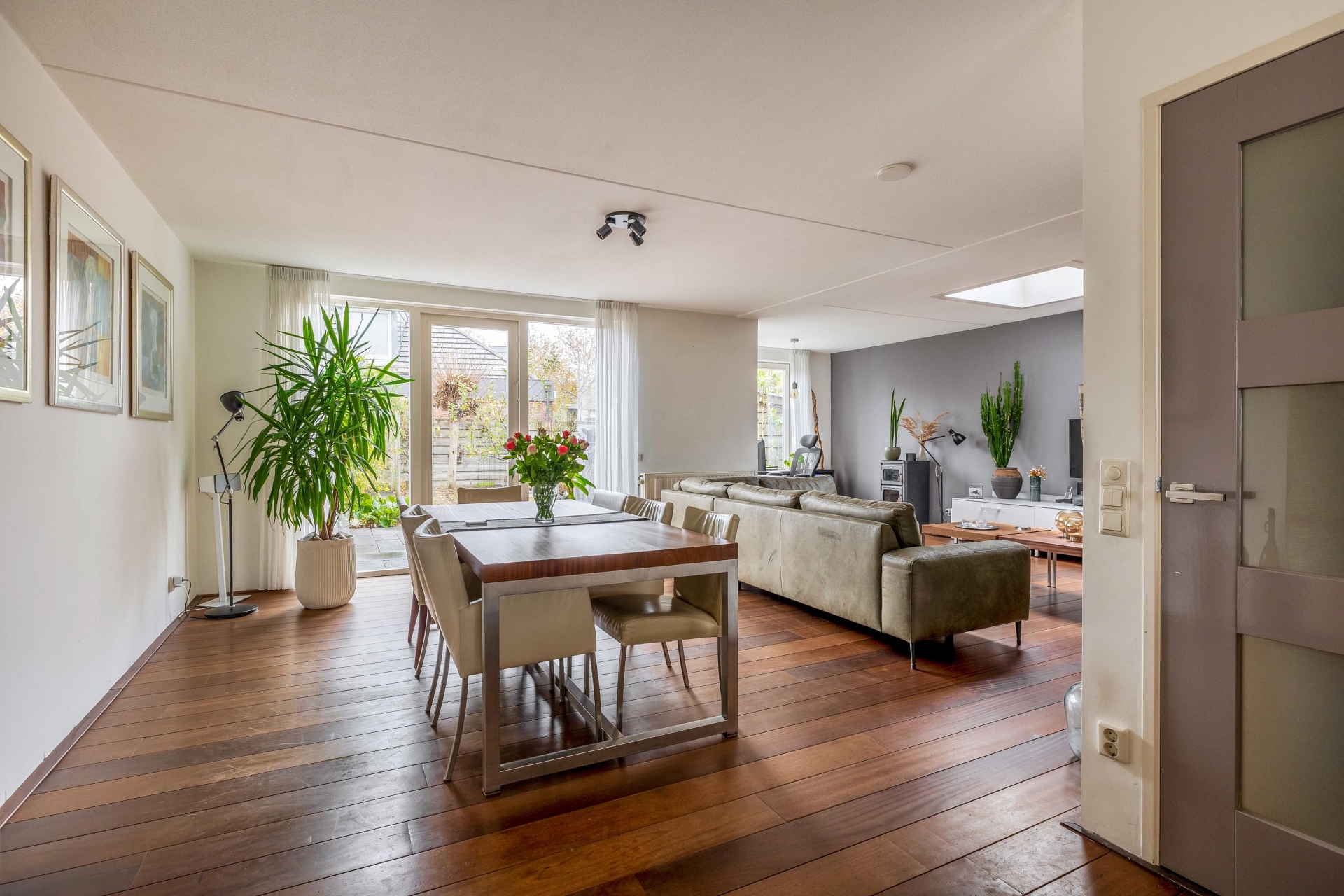 De woonkamer van circa 35 m² is tuingericht en heerlijk licht dankzij de grote raampartijen. Vanuit hier kijk je zo de groene achtertuin in. De begane grond is praktisch ingedeeld met een ruime hal, toilet, toegang tot de inpandige garage én natuurlijk de open keuken aan de voorzijde. De keuken is voorzien van inbouwapparatuur en een fijne plek voor een grote eettafel, waar je met het hele gezin of met vrienden lekker kunt tafelen. De woonkamer en keuken lopen naadloos in elkaar over en maken dit een fijne leefruimte met volop mogelijkheden.
