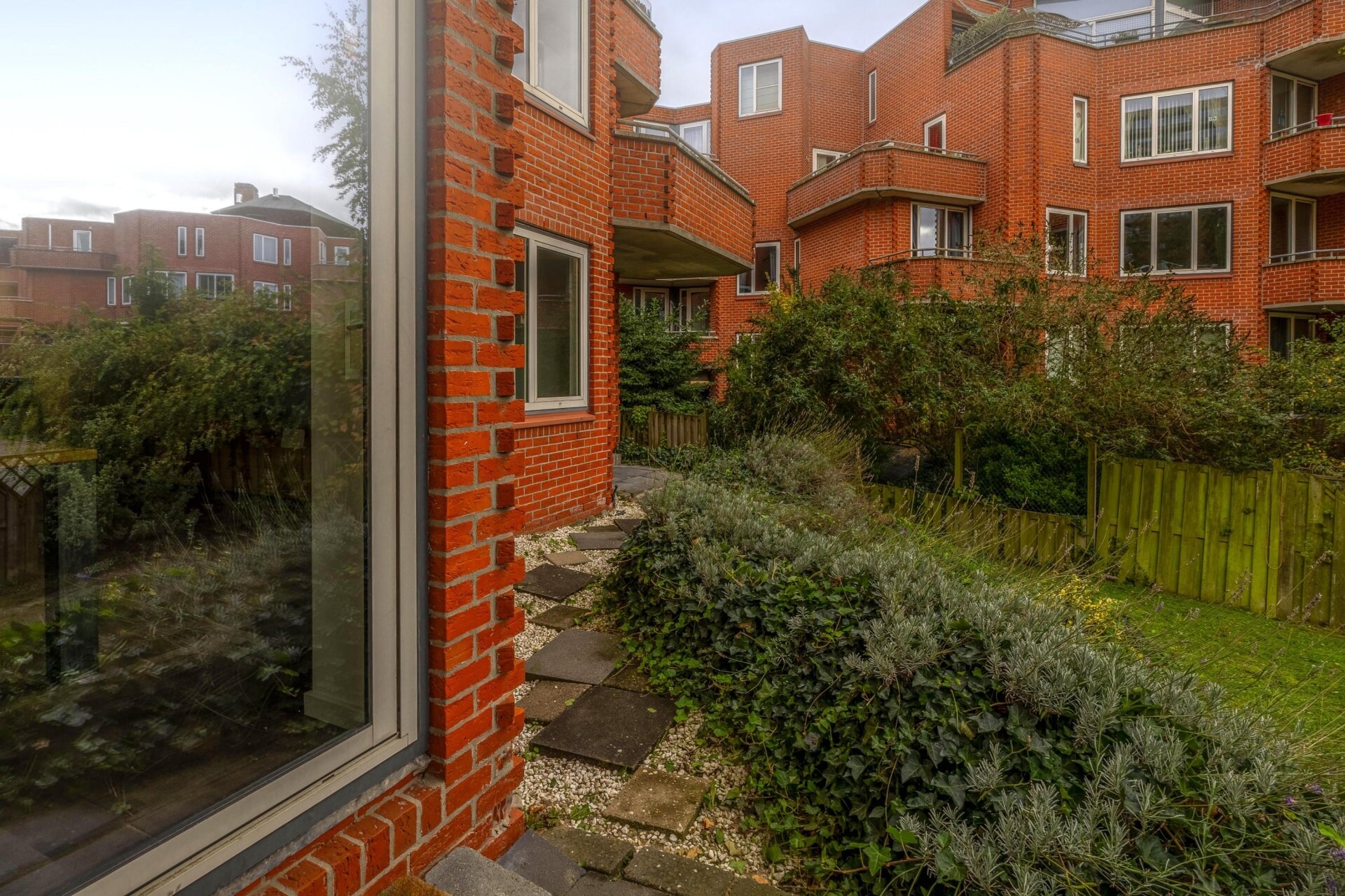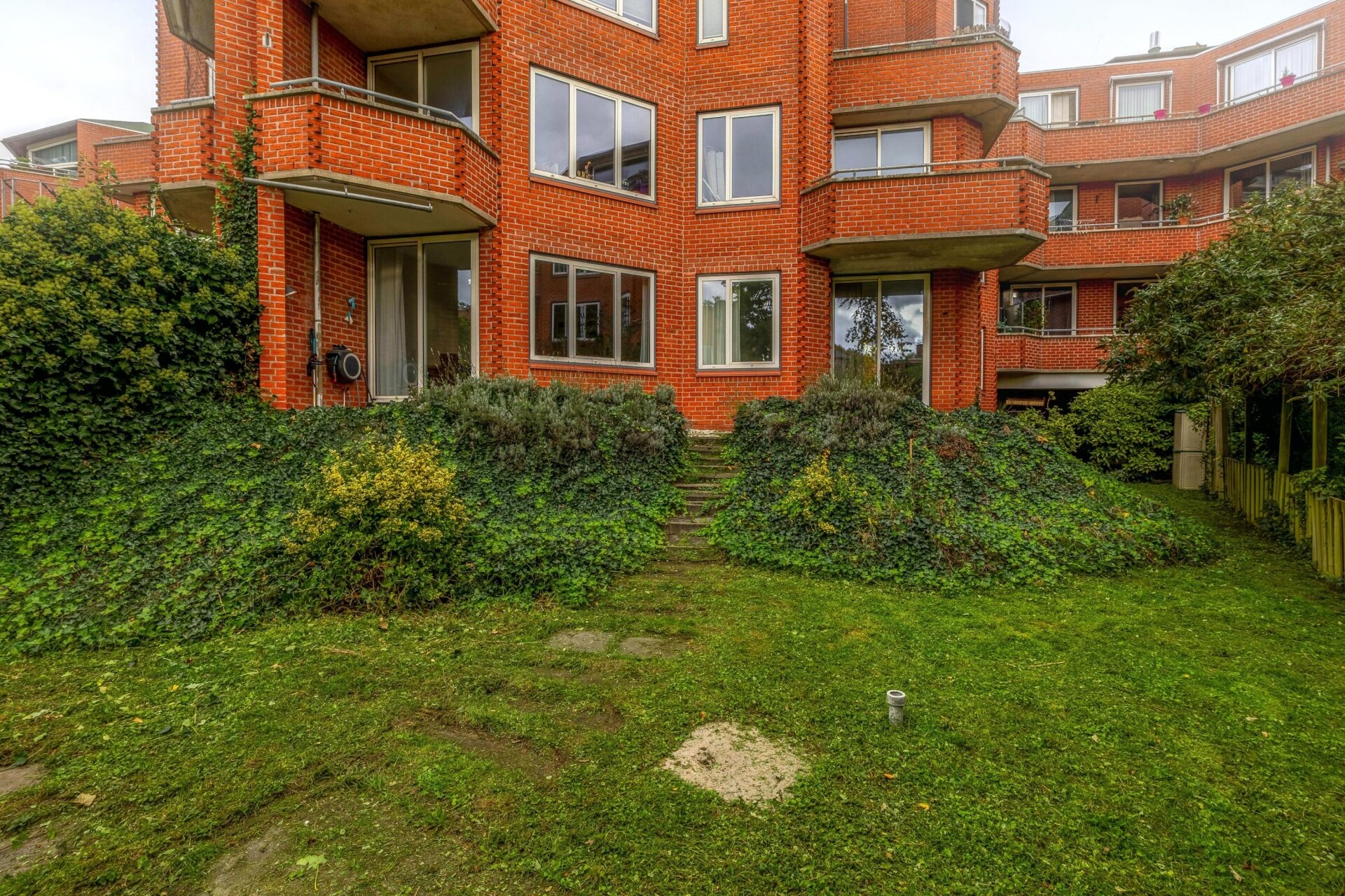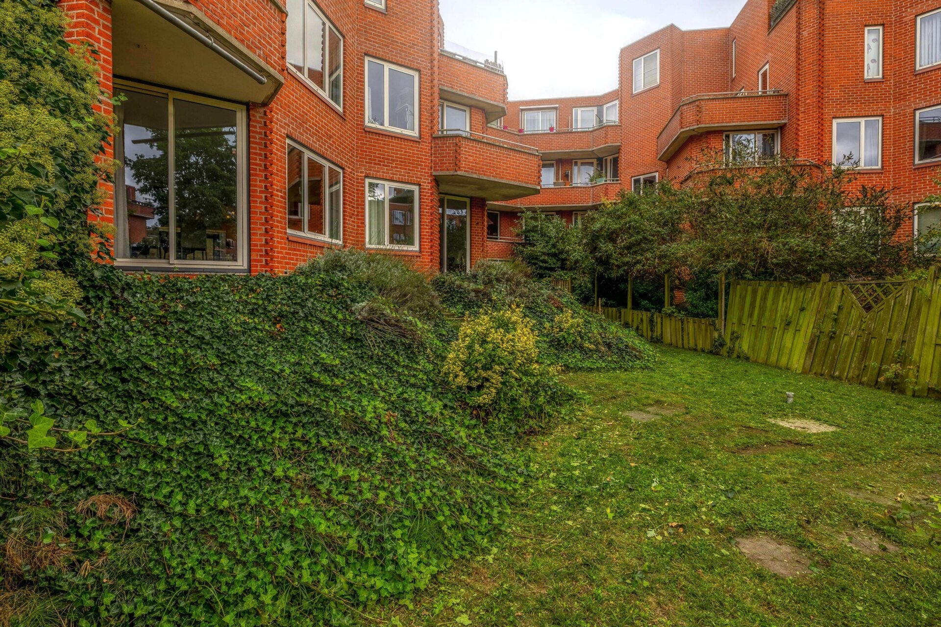 Zowel vanuit de woonkamer als een slaapkamer is middels een schuifpui de achtertuin toegankelijk. De riante tuin van circa 90 m2 is gelegen op het zuidwesten en een groot pluspunt van dit appartement. Hierdoor is het mogelijk om de hele middag en avond van de zon te kunnen genieten. Door het aanwezige hoogteverschil heeft de tuin een speelse indeling en biedt deze diverse mogelijkheden voor zitjes in de zon en de schaduw. Verder beschikt de tuin over een buitenkraan en een deur in de schutting met toegang tot de Hellingweg. Officieel mag hier geen deur zijn, maar dit is al minimaal tien jaar gedoogd.