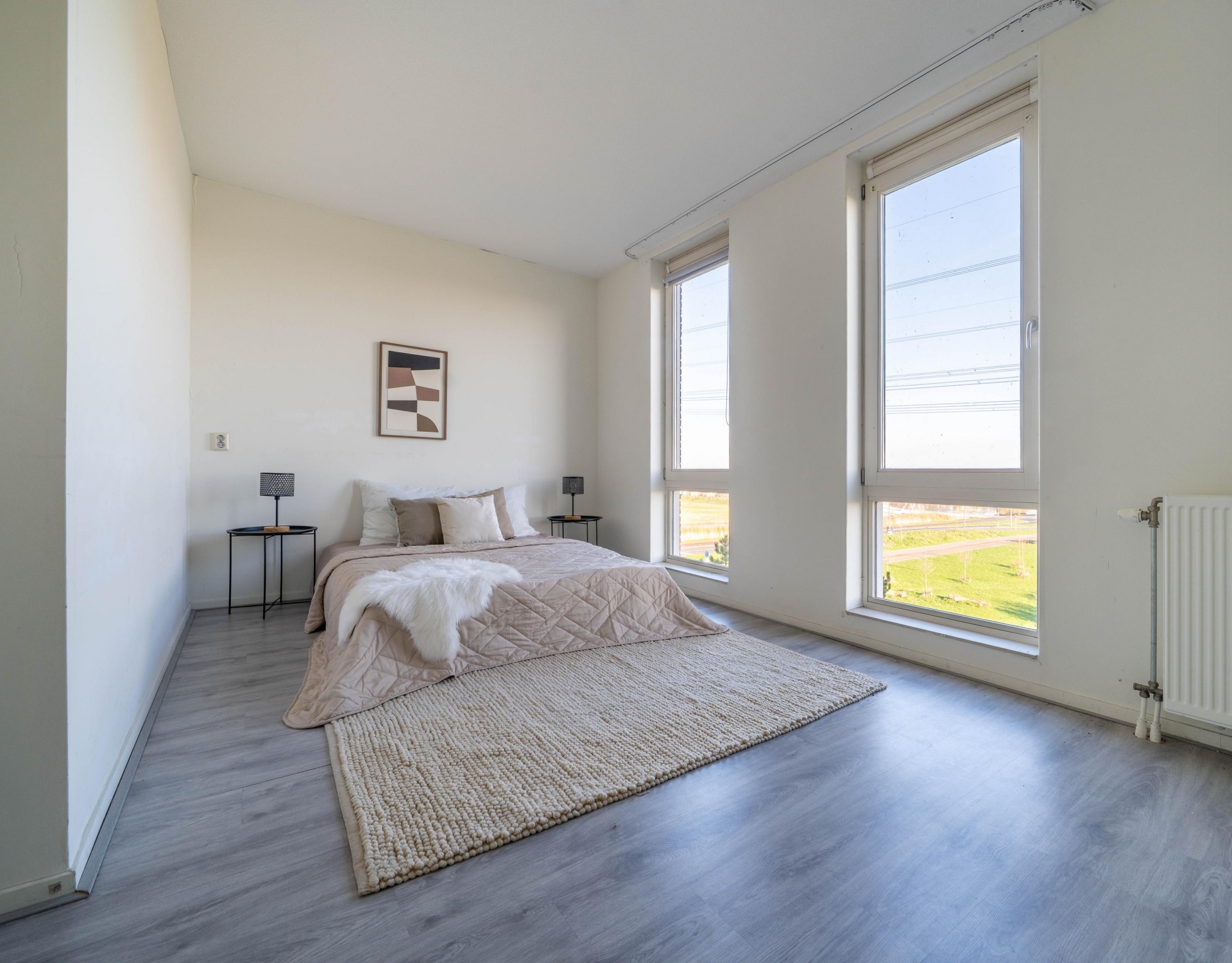 De slaapkamers hebben een oppervlakte van 9 en 17 m² en beschikken over een laminaatvloer. Door het hele appartement, met uitzondering van de natte ruimtes, is de laminaatvloer doorgelegd. De inpandige badkamer is volledig betegeld en voorzien van een ligbad, douche en wastafel. De inpandige berging biedt ruimte voor een wasmachine en droger.