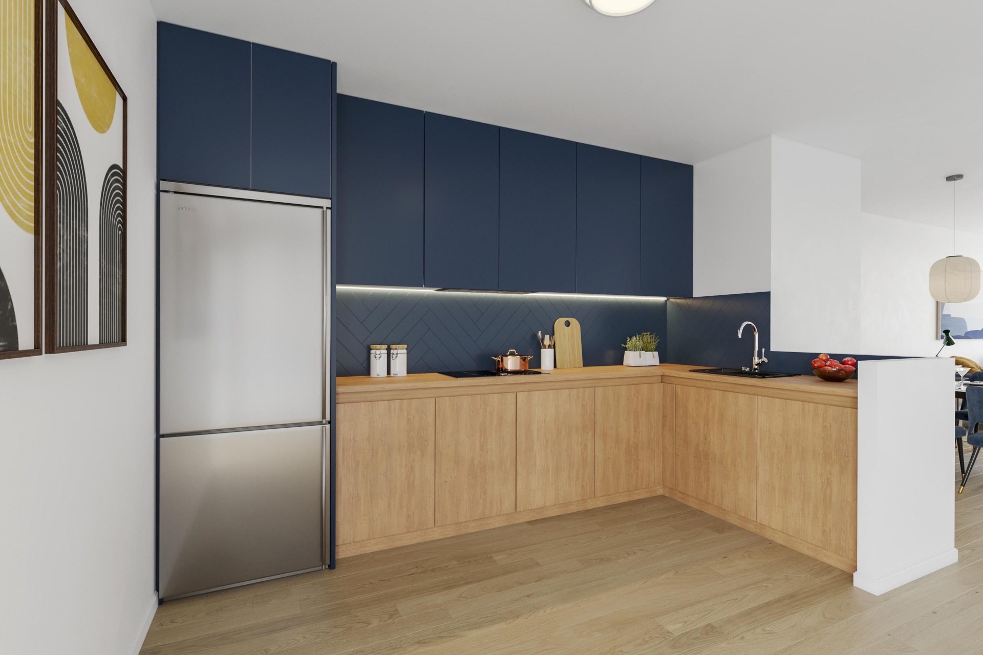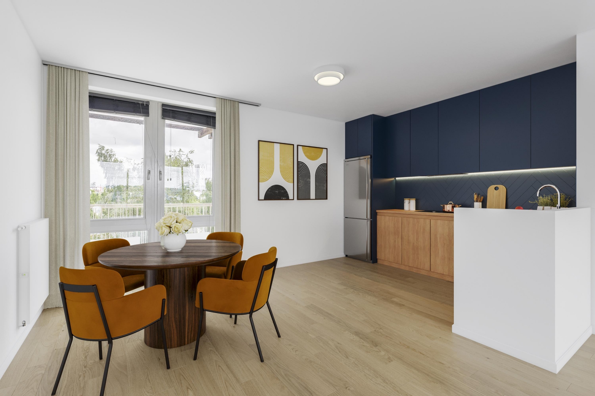 De riante woonkamer is het hart van dit huis. Dankzij de grote raampartijen over de volle breedte van de ruimte, geniet je hier van een fantastisch vrij uitzicht én van een zee aan daglicht. Vanuit je luie stoel kijk je uit op het groen en de waterrijke omgeving van het park, zonder directe inkijk – dat voelt meteen ontspannen. De woonkamer staat in open verbinding met de keuken, wat zorgt voor een fijne en open leefruimte.