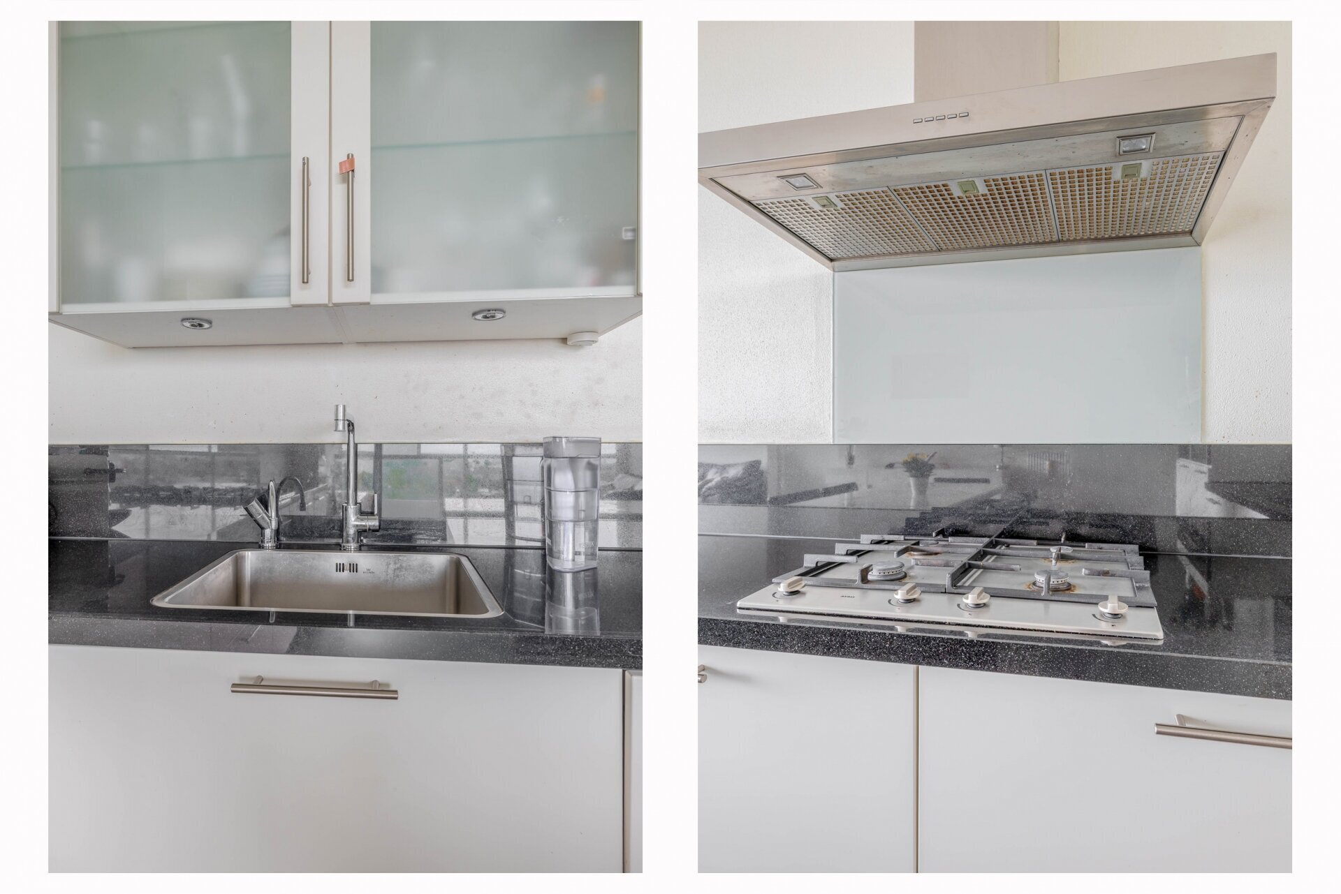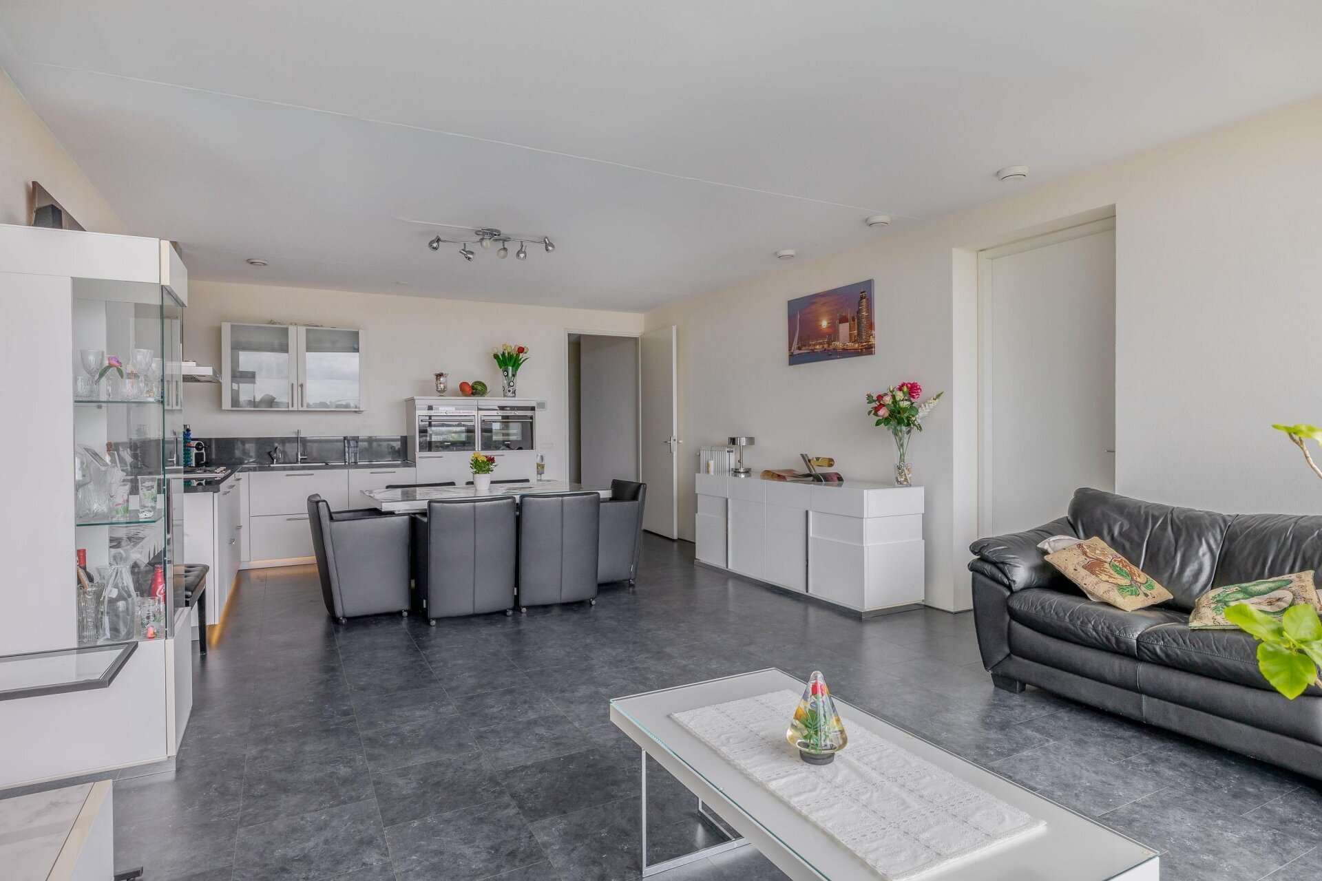 De open keuken is compleet ingericht met inbouwapparatuur zoals een koelkast, aparte vriezer, oven, magnetron, vaatwasser, 4-pits gaskookplaat, afzuigkap en Quooker. Zowel de woonkamer als beide slaapkamers grenzen aan de zonnige loggia met schuifpui, grote raampartijen en uitzicht waar je niet op uitgekeken raakt.