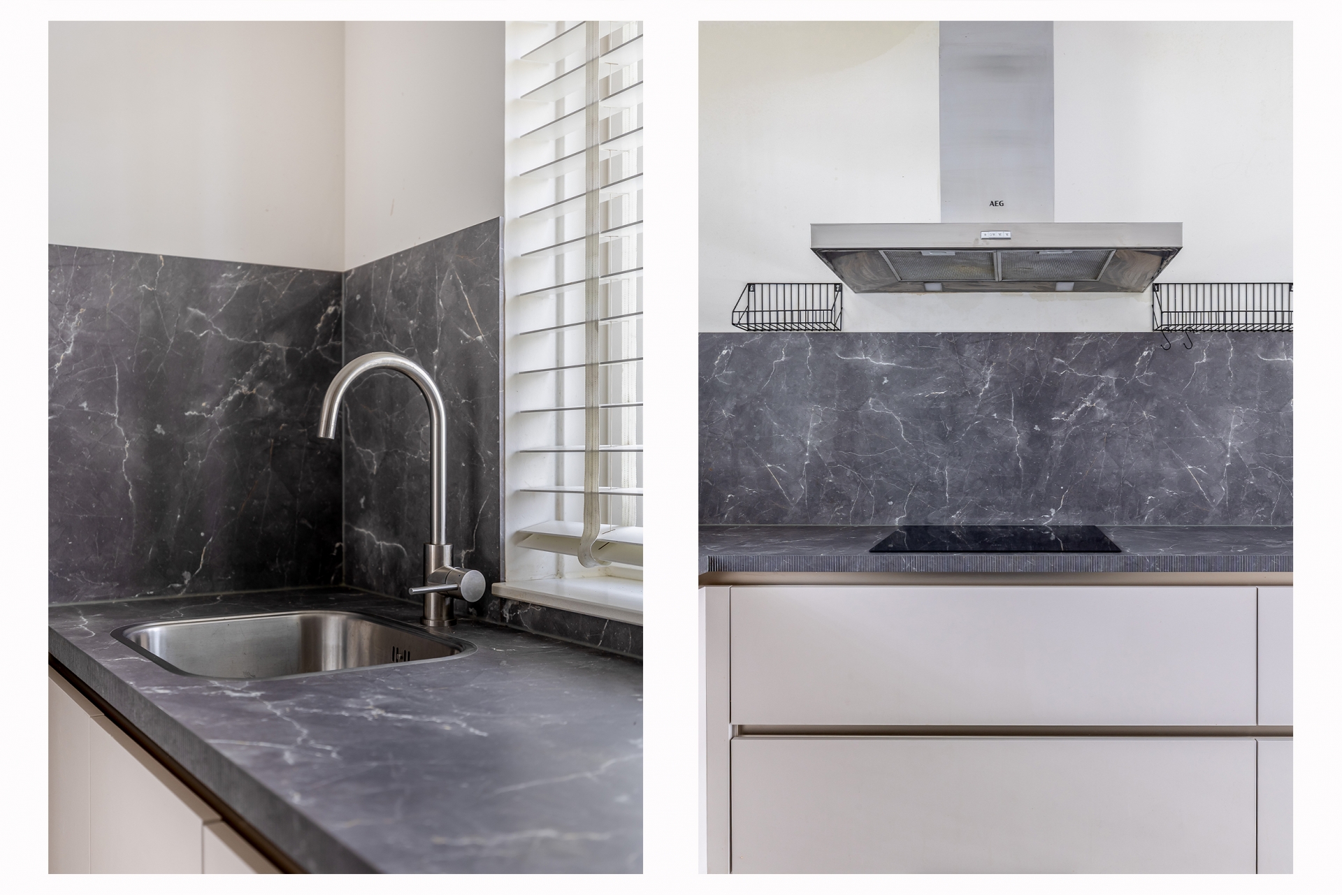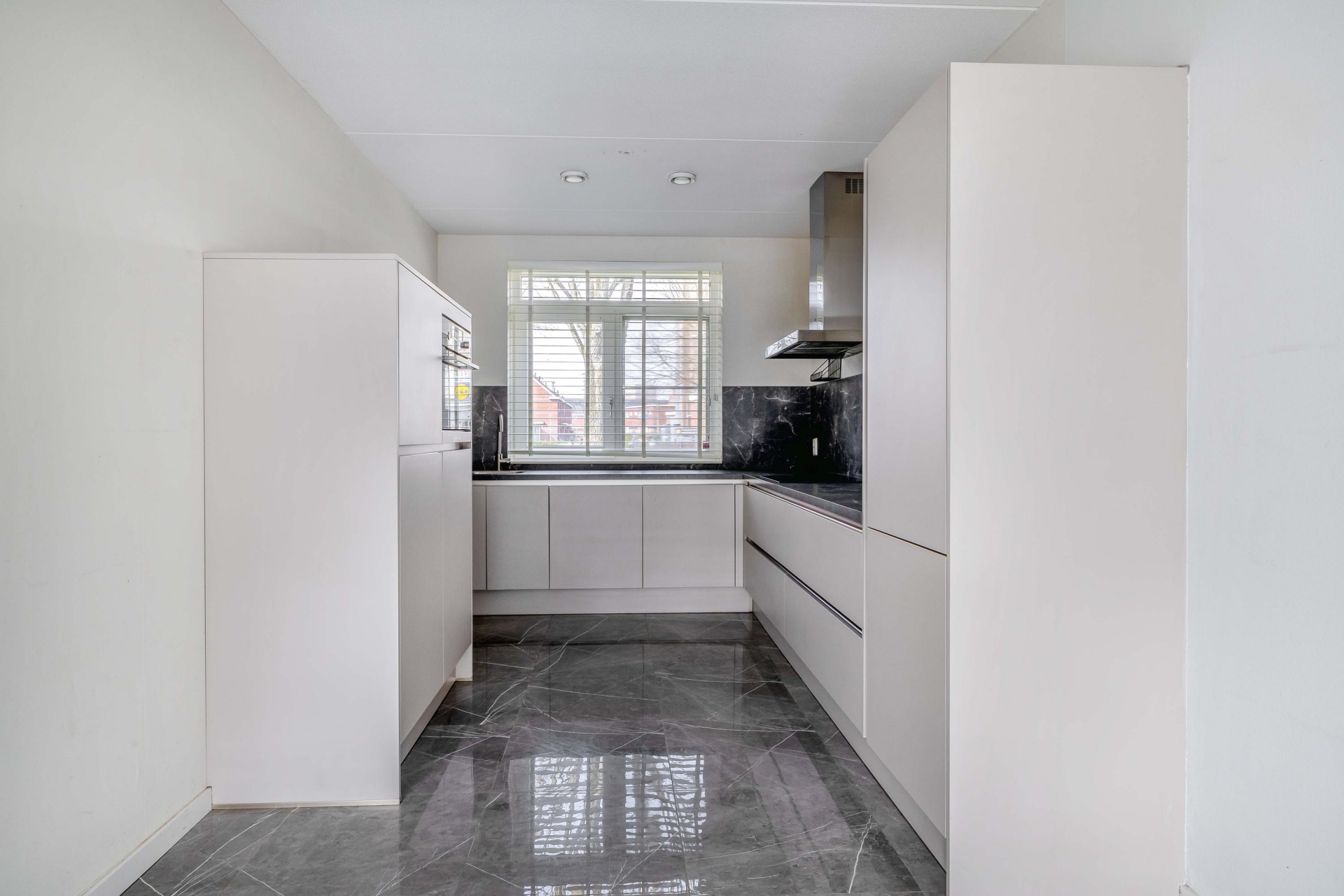 De woonkamer biedt voldoende ruimte voor een comfortabele zithoek en een grote eettafel waar je met familie en vrienden samenkomt. Aan de voorzijde ligt de moderne open keuken, voorzien van diverse inbouwapparatuur. Een fijne plek om te koken terwijl je in contact blijft met de rest van het gezelschap.