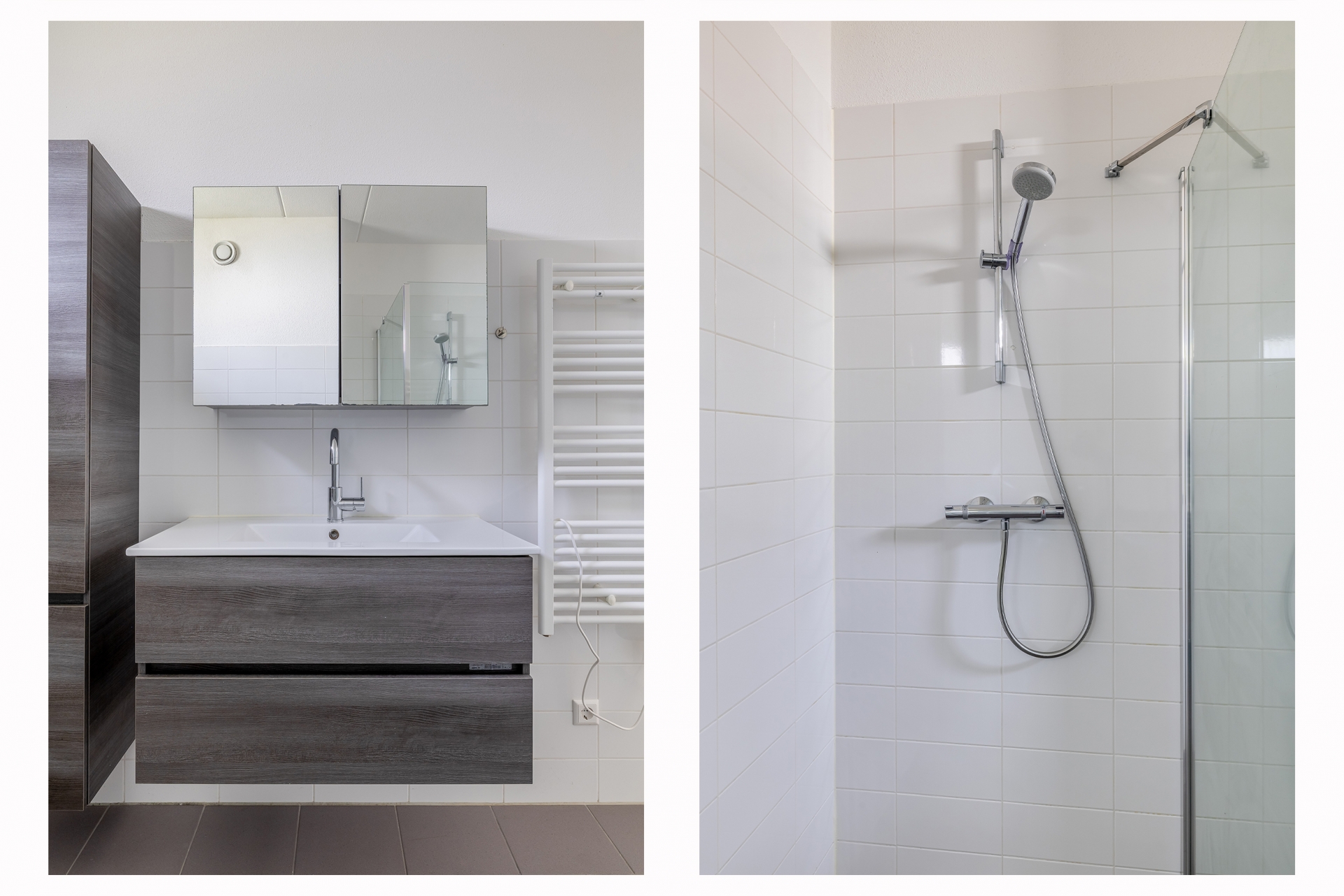 De badkamer is modern uitgevoerd en praktisch ingericht met een inloopdouche, toilet en een wastafel.