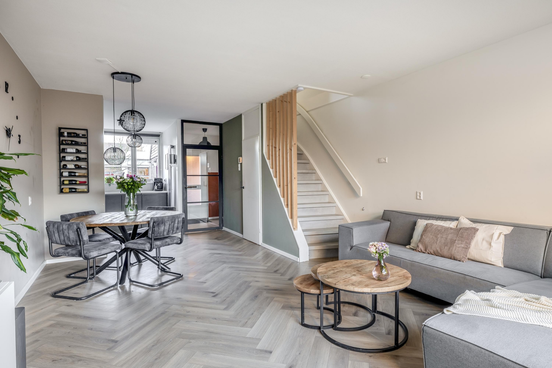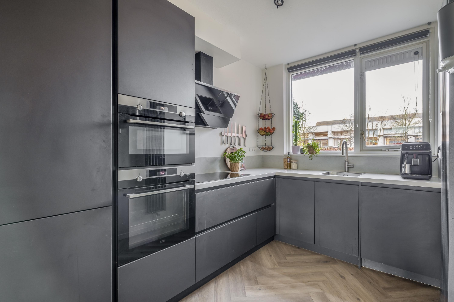 De woonkamer is een fijne, lichte ruimte met een strakke laminaat-visgraatvloer en een mooie overgang naar de halfopen keuken. De moderne keuken uit 2021 is uitgerust met inbouwapparatuur, een Quooker en veel werkruimte, een heerlijke plek voor kookliefhebbers. Het geheel heeft een eigentijdse uitstraling, met rustige kleuren en een praktische indeling.