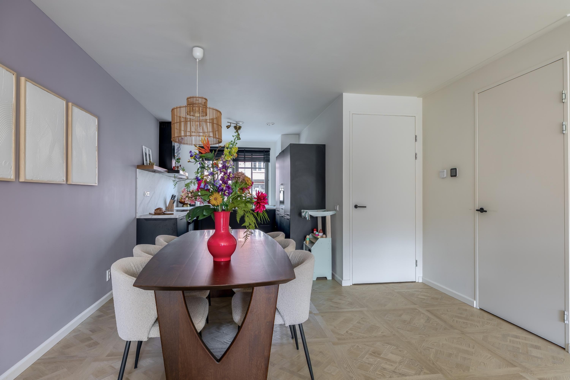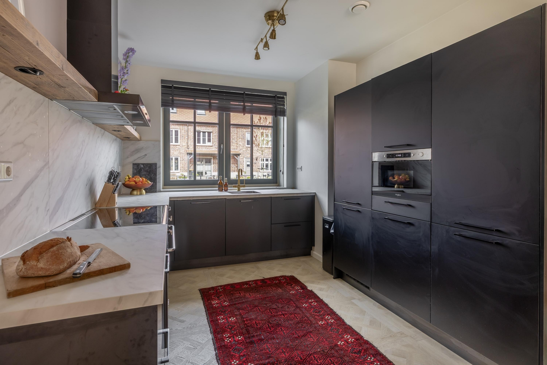 De woonkamer is ruim door de uitbouw, tuingericht en heerlijk licht dankzij de brede glazen pui met dubbele openslaande deuren aan de achterzijde. De strakke wandafwerking en de mooie vloerafwerking vallen direct op. Er is genoeg ruimte voor een royale zithoek en een grote eettafel. De openslaande deuren verbinden binnen direct met buiten, waardoor de tuin echt een verlengstuk van de leefruimte wordt. Aan de voorzijde is de luxe keuken gesitueerd. Deze ruime keuken met grijze fronten en een marmerlook werkblad geeft direct een stijlvolle uitstraling, een echte eyecatcher! Uiteraard is de keuken voorzien van alle benodigde luxe inbouwapparatuur. Hier kook je met gemak voor een groot gezelschap!