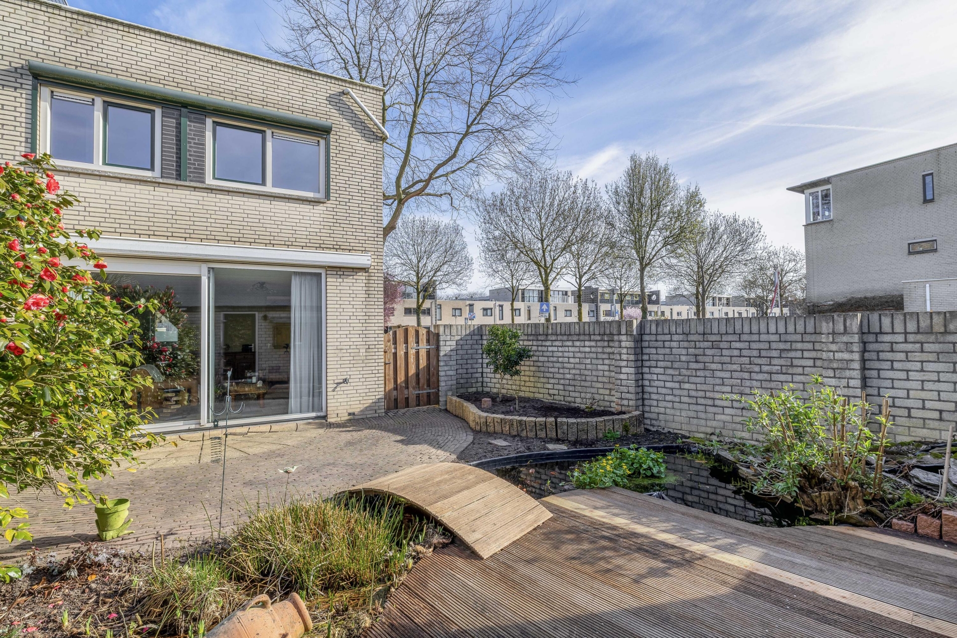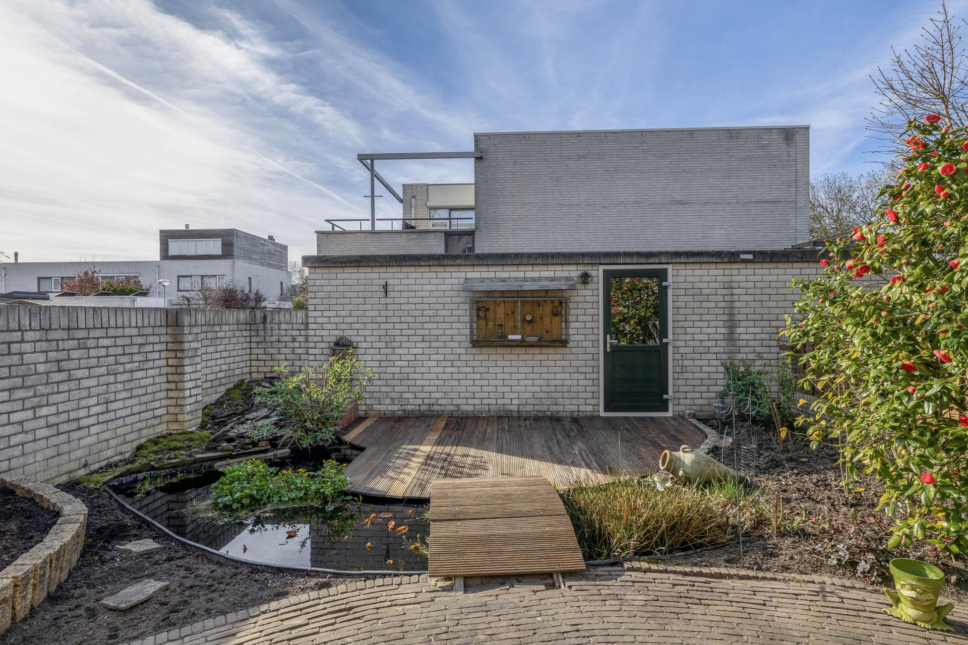 Als we de tuin inlopen vinden we hier achterin de vrijstaande stenen garage. Aan de achterzijde van de woning hangt een elektrisch zonnescherm en heeft de tuin een wateraansluiting.
