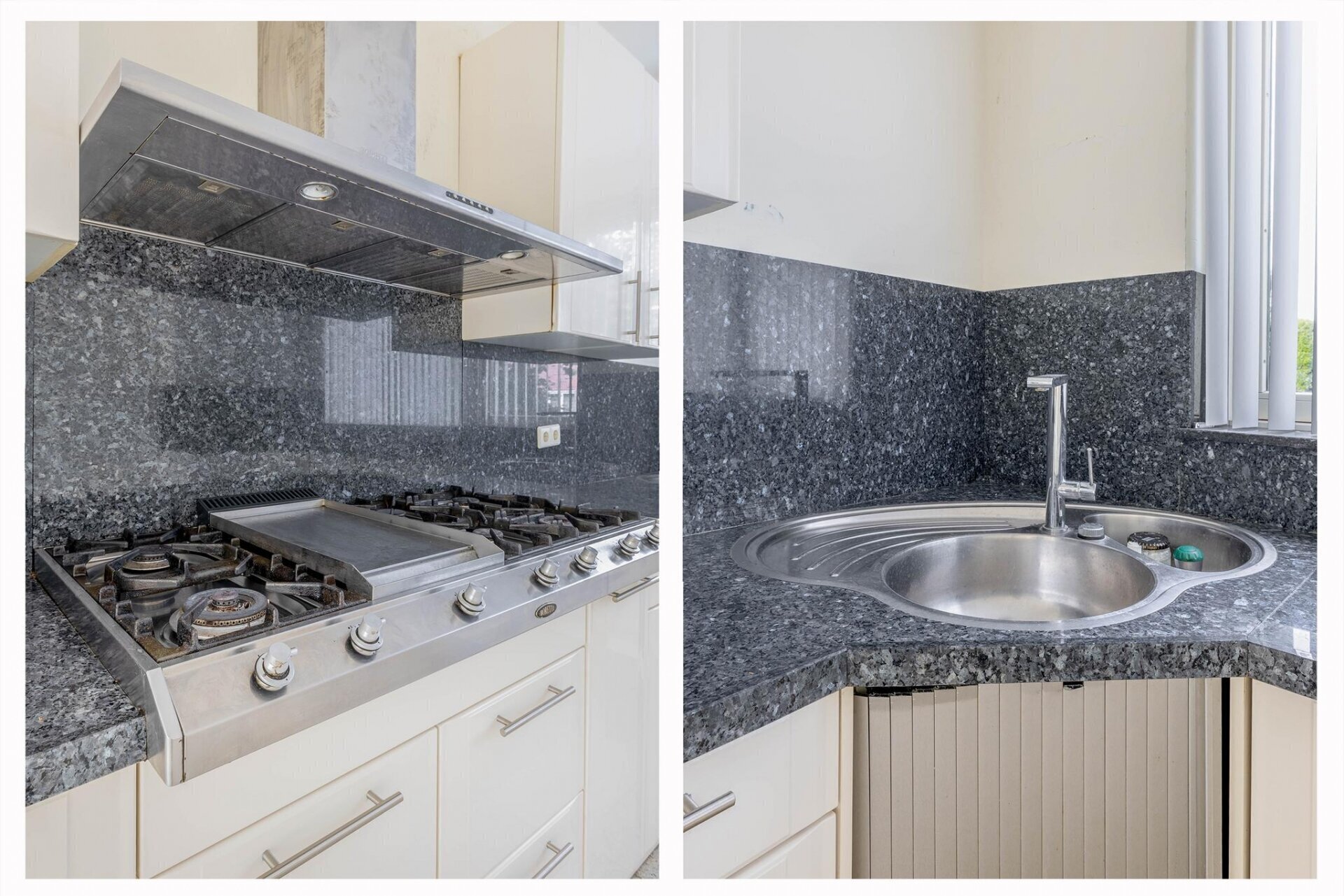 Via de ruime hal kom je in de royale doorzonwoonkamer. Dankzij het grote raamoppervlak en de schuifpui naar de tuin valt het licht hier volop naar binnen. De plavuizen vloer geeft de ruimte een nette, neutrale uitstraling en is bovendien praktisch in onderhoud. De open keuken aan de voorzijde is verrassend ruim en voorzien van diverse inbouwapparatuur. Er is veel werk- en kastruimte, en ook aan de wasmachineaansluiting is gedacht. De keuken grenst direct aan de tuin – handig voor een kop koffie in de ochtendzon of een barbecue op warme dagen.