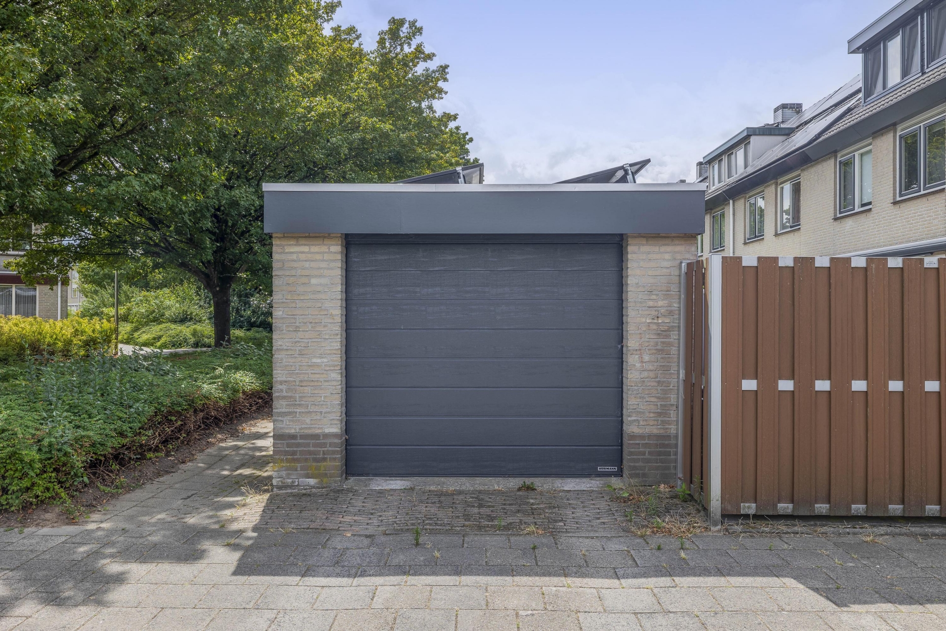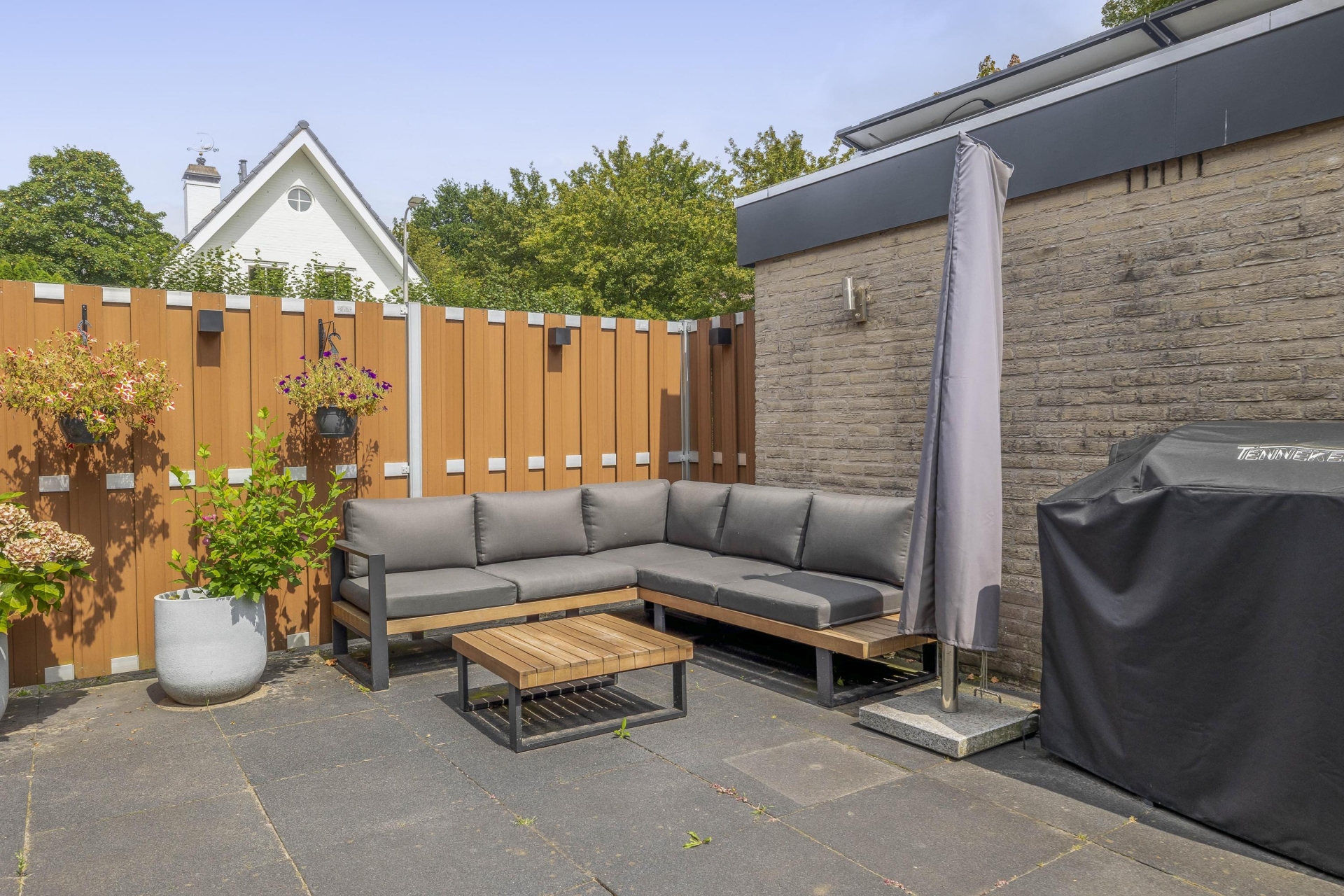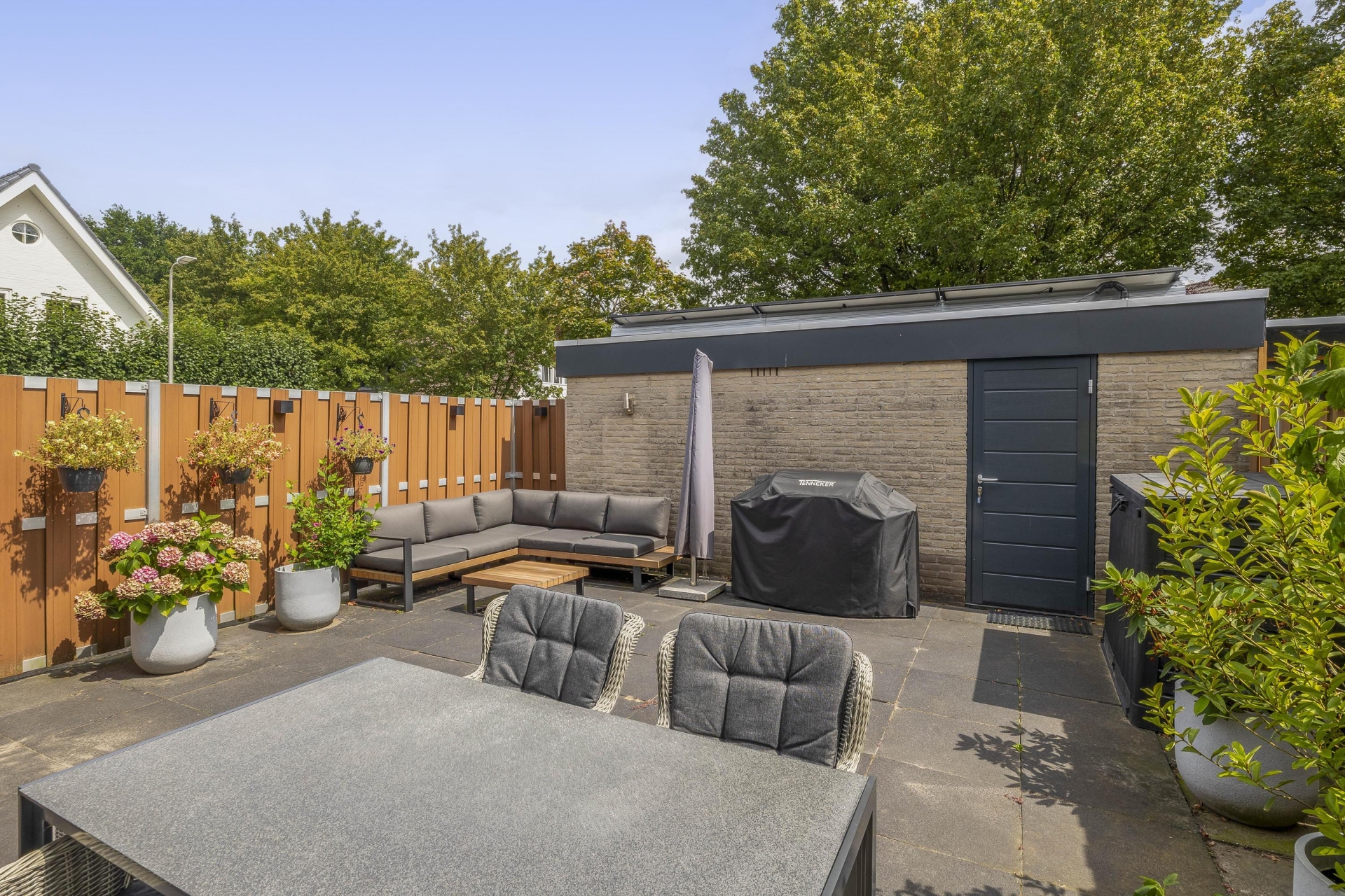 Zonnige achtertuin met achterom, elektrisch zonnescherm én ruime garage