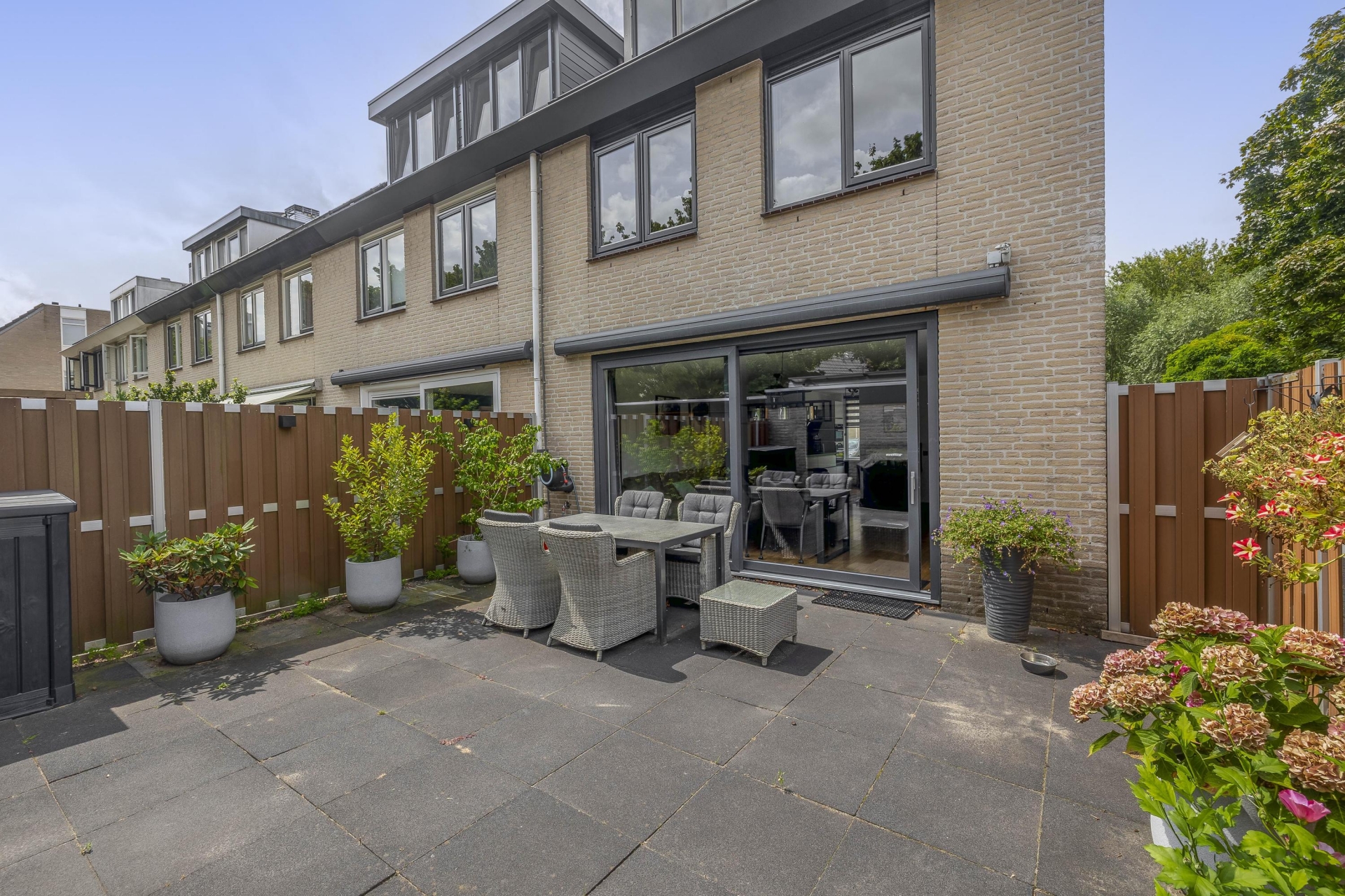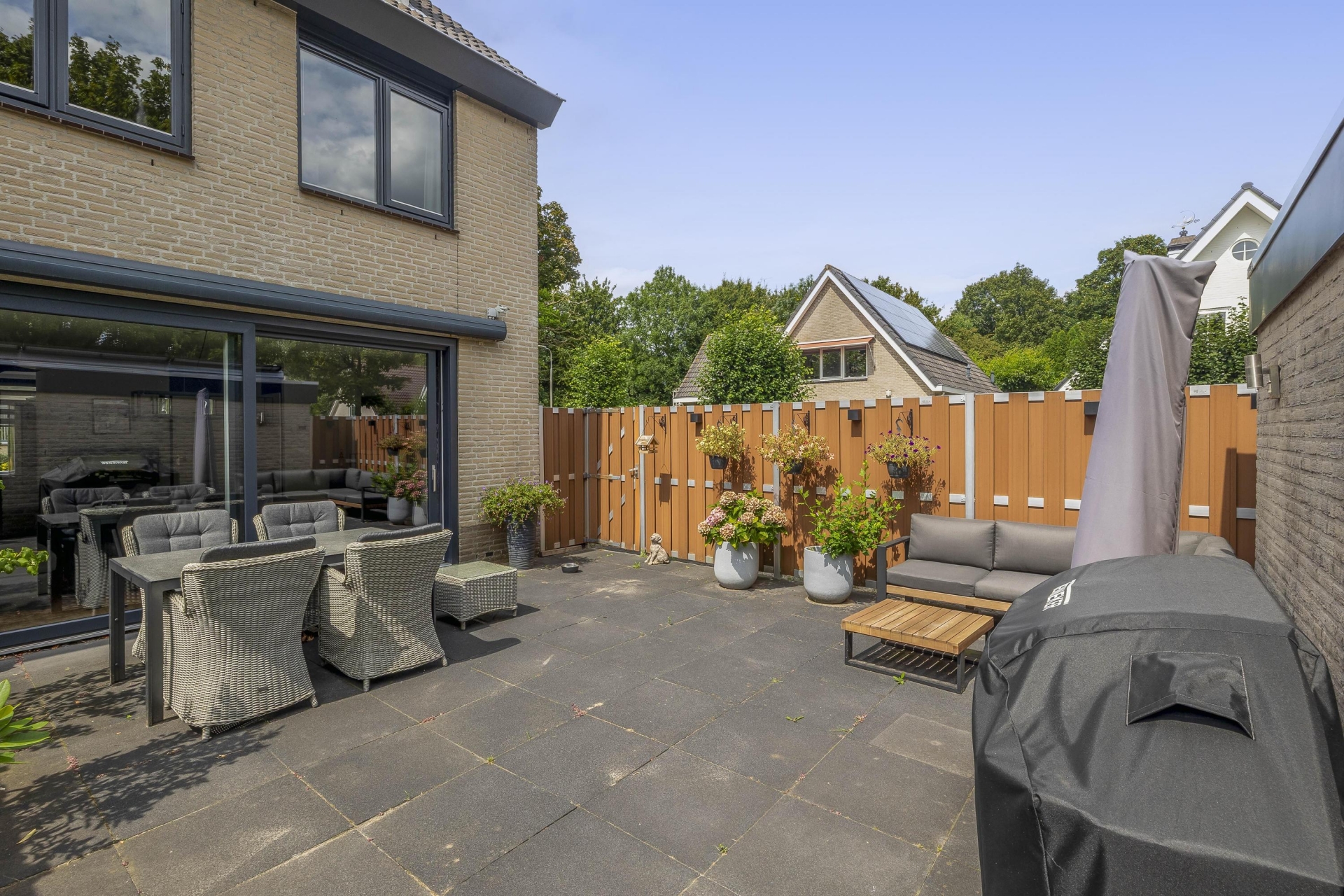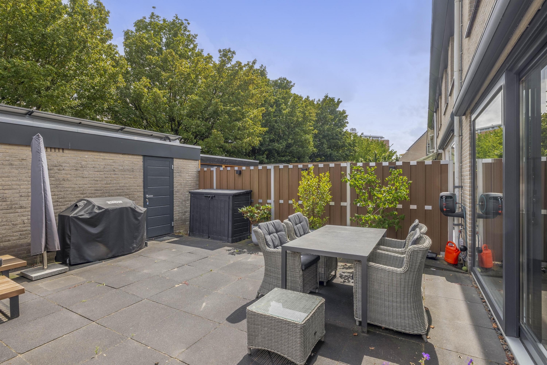 Zonnige achtertuin met achterom, elektrisch zonnescherm én ruime garage