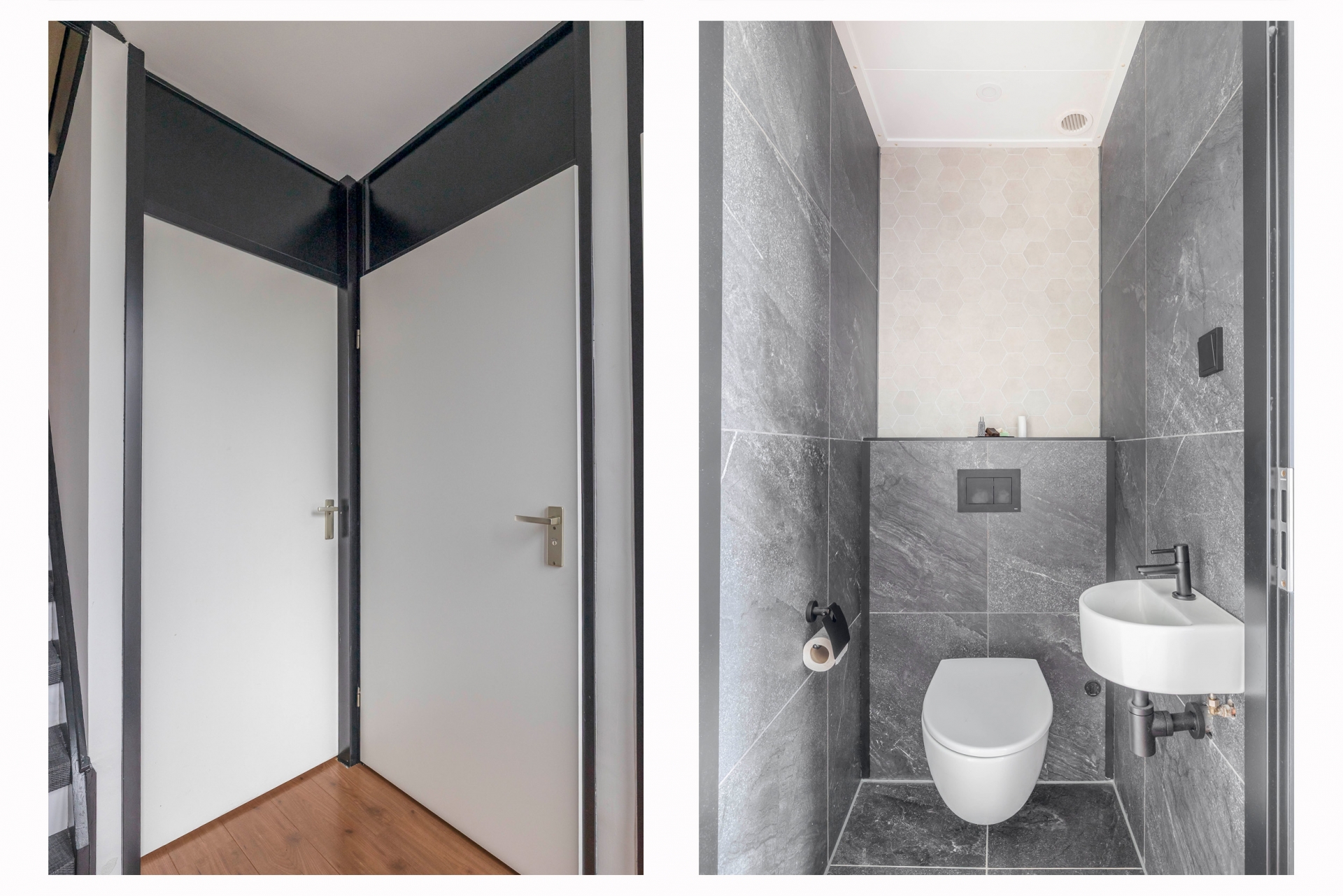 Net toilet op de begane grond met zwevend closet en fonteintje