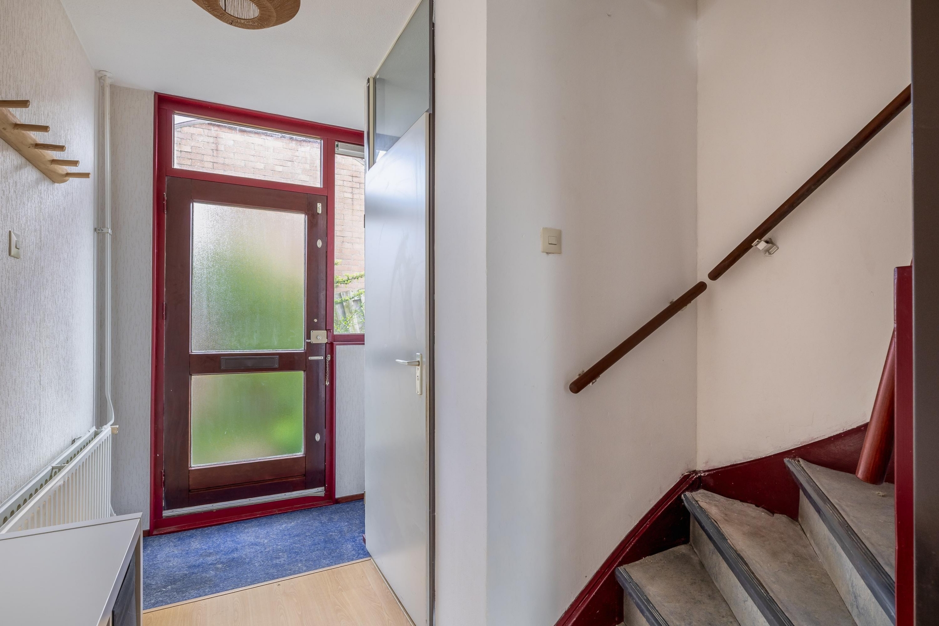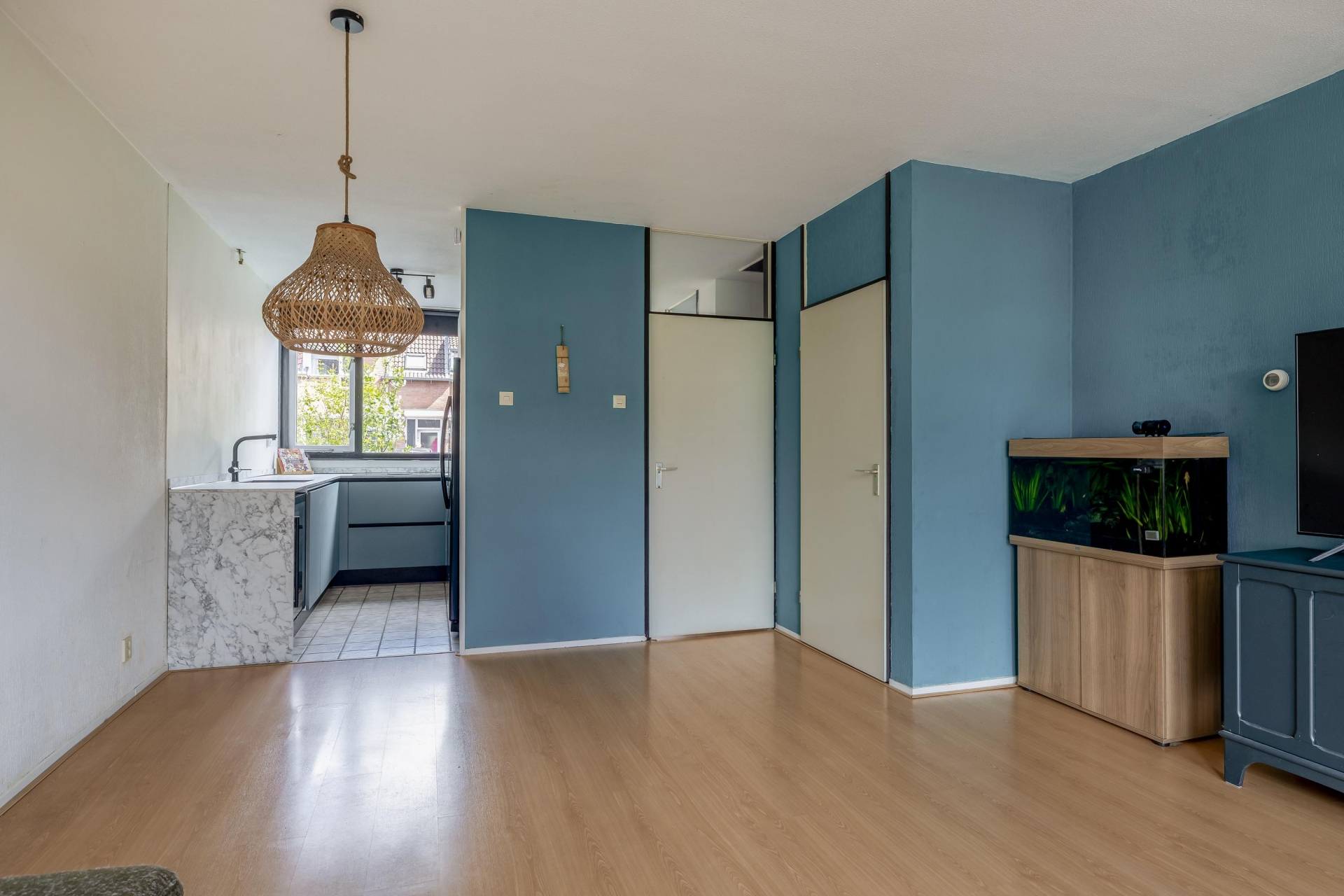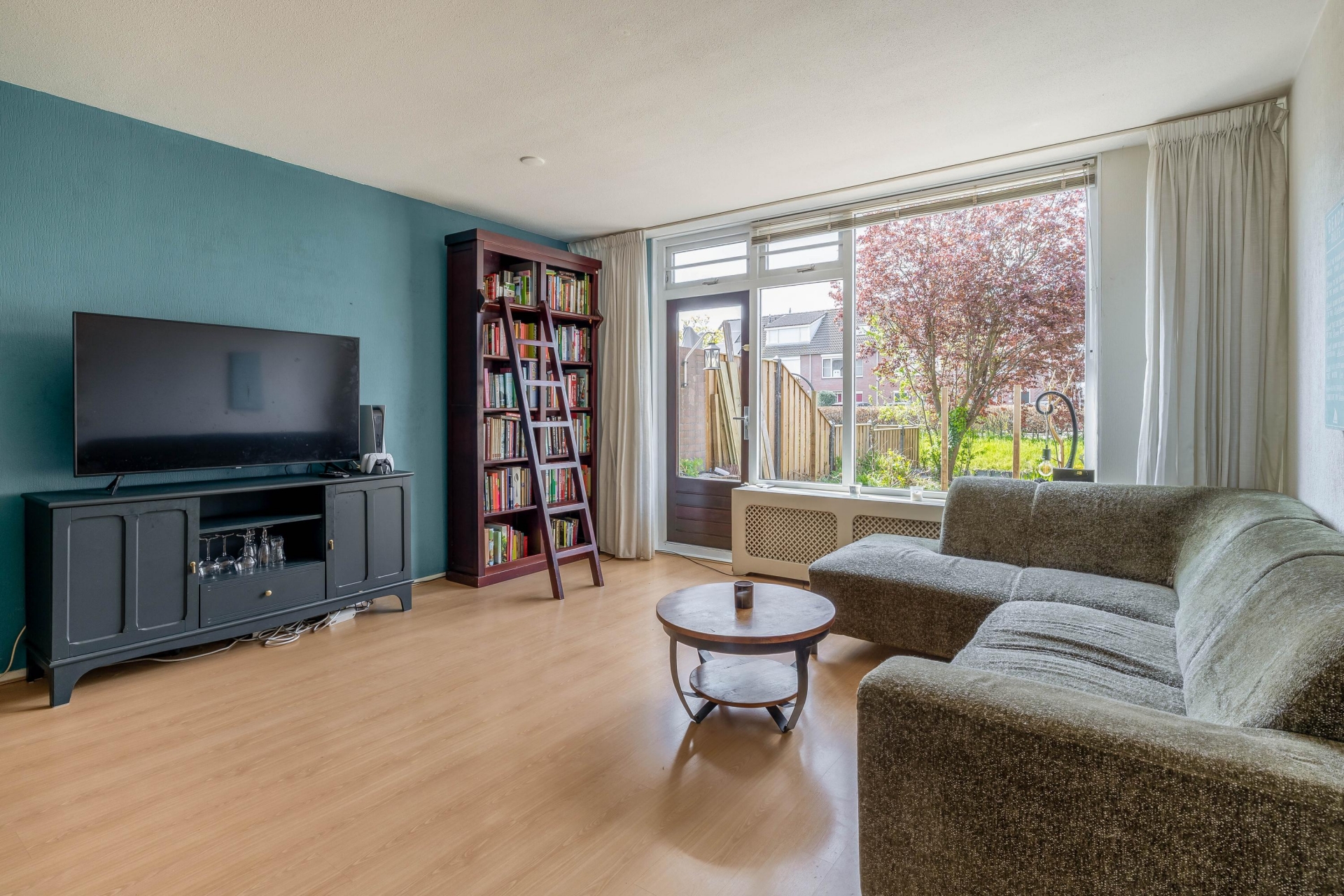De woonkamer is heerlijk licht dankzij de brede raampartij en de glazen achterdeur. Hierdoor valt er veel natuurlijk daglicht naar binnen en heb je een mooi zicht op de tuin en het groen daarachter. De ruimte heeft een rechte, praktische indeling waardoor je eenvoudig een comfortabele zithoek en een gezellige eethoek kunt creëren.