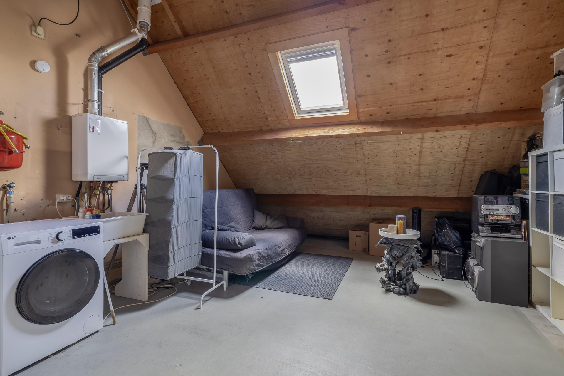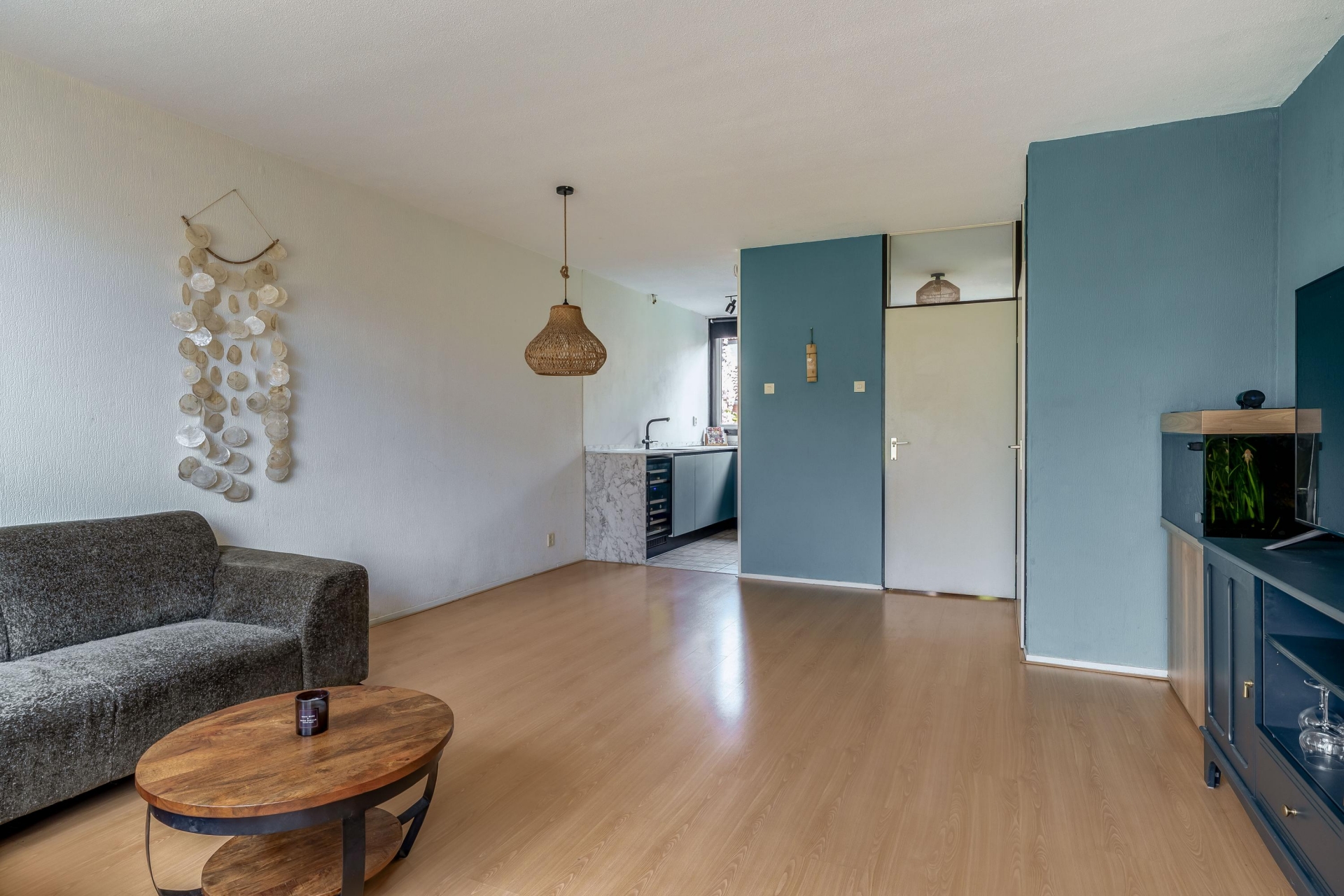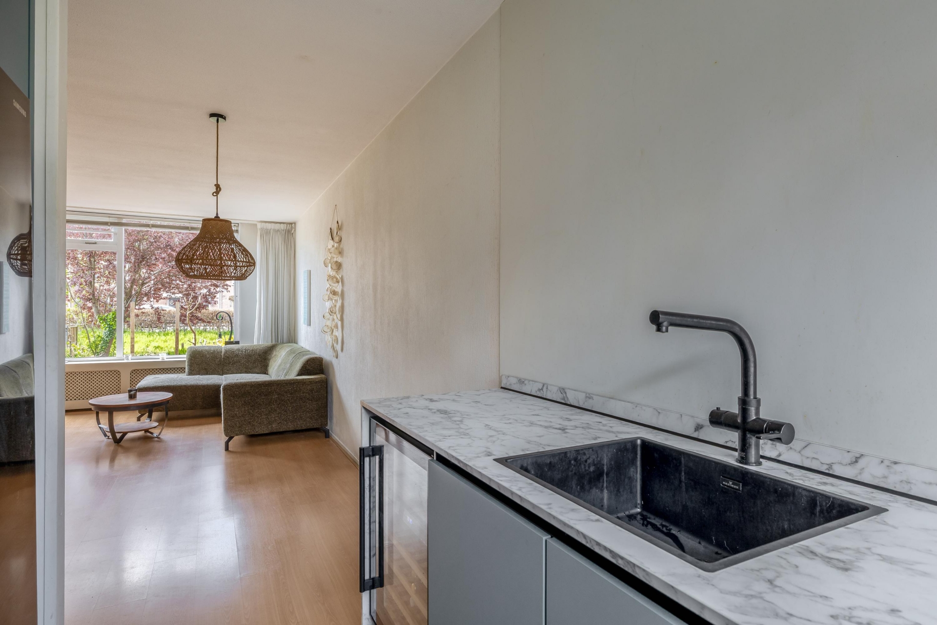 De huidige afwerking is netjes en vormt een goede basis, maar biedt ook ruimte om het geheel naar eigen smaak te vernieuwen. De directe verbinding met de tuin maakt het woongedeelte extra aantrekkelijk; op zonnige dagen zet je de deur open en loopt binnen moeiteloos over in buiten.