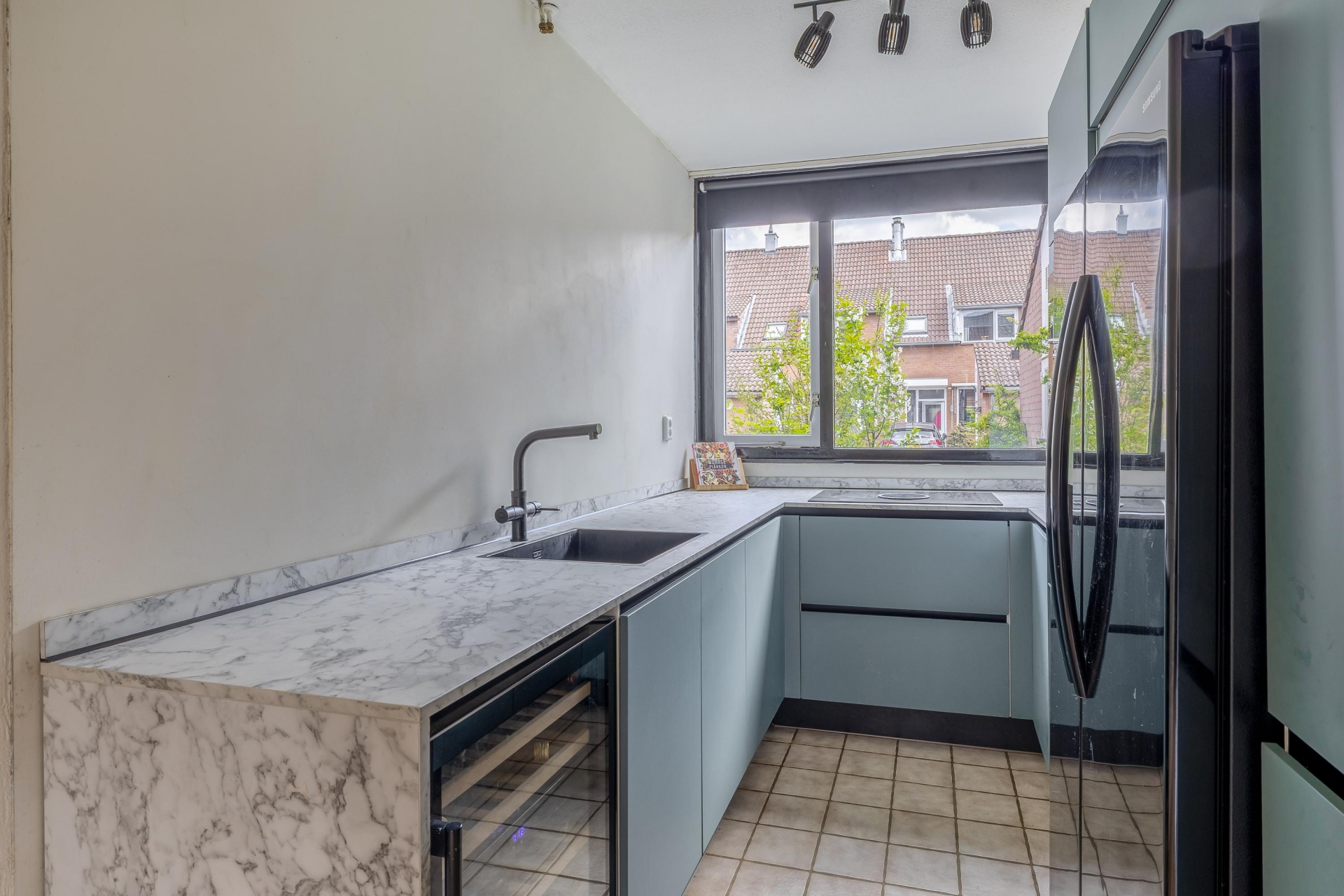 De praktische L-opstelling biedt voldoende werk- en opbergruimte. Tijdens het koken kijk je prettig naar buiten, wat zorgt voor een open en ruimtelijk gevoel. De keuken sluit mooi aan op de rest van de woning en vormt een fijne, functionele plek in huis.