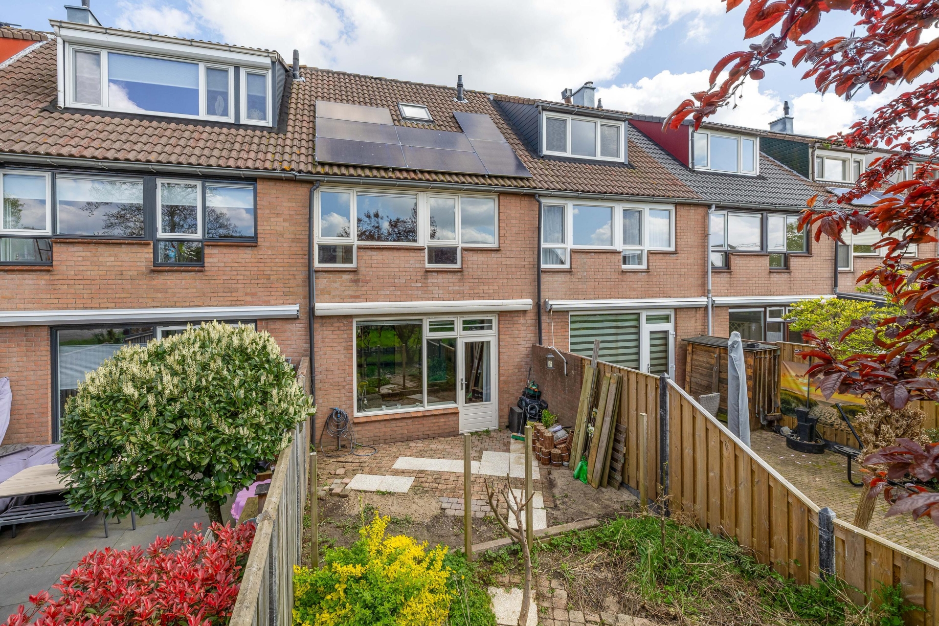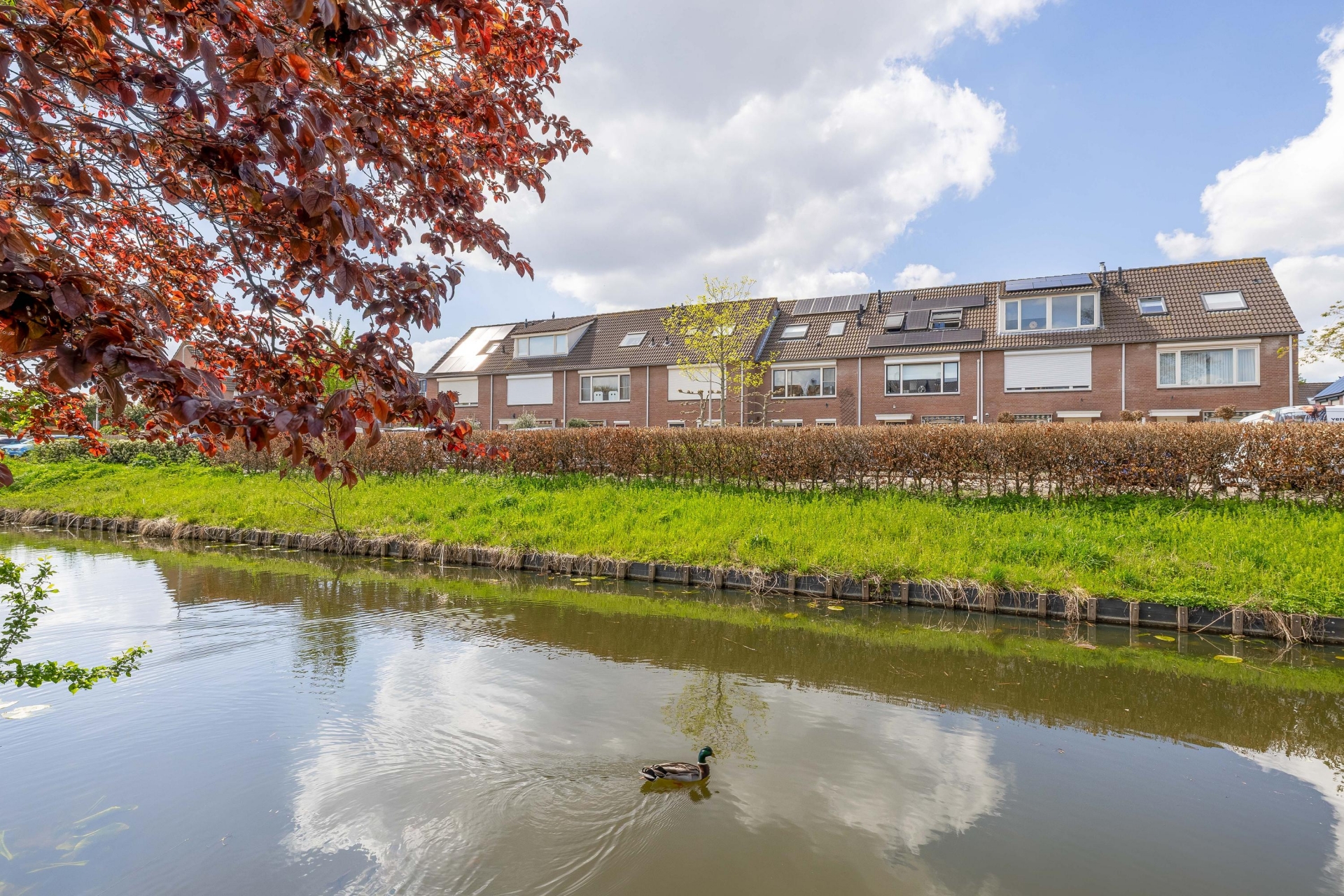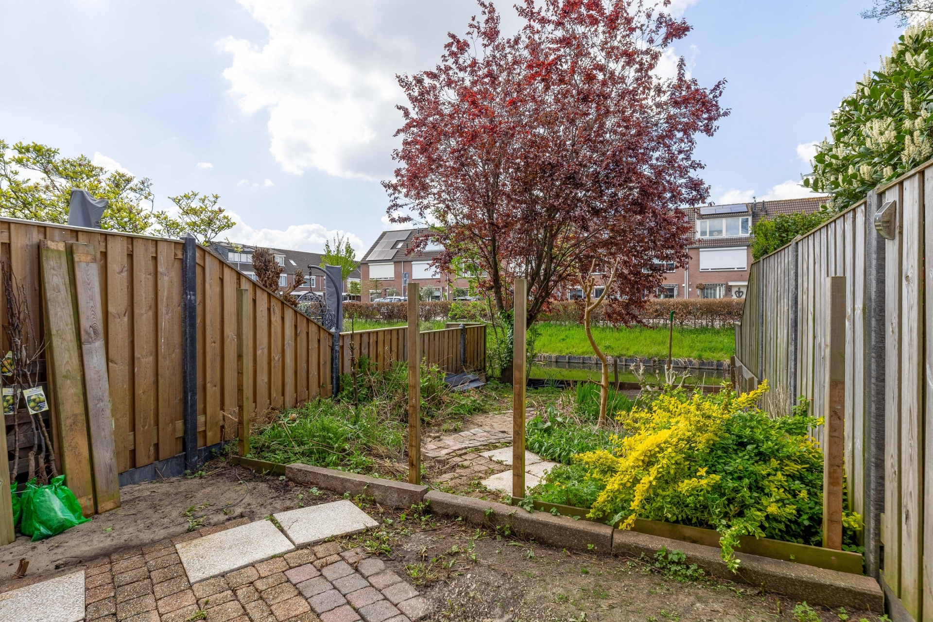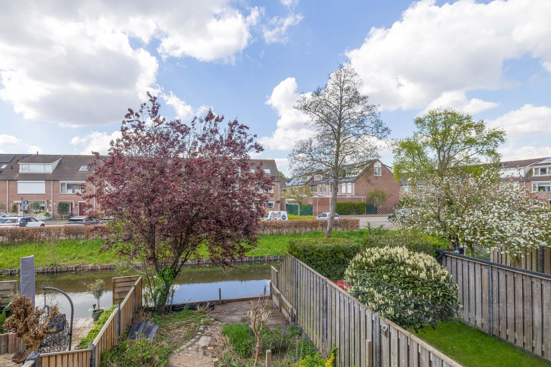 Achterin de tuin grenst het perceel aan het water, wat zorgt voor een vrij uitzicht en een extra gevoel van rust en ruimte. Hier hoor je de vogels en ervaar je echt het buitenleven. Met meerdere zitplekken, een terras en ruimte voor groen is dit een ideale plek om te ontspannen, te tuinieren of gezellig met vrienden en familie buiten te zijn.