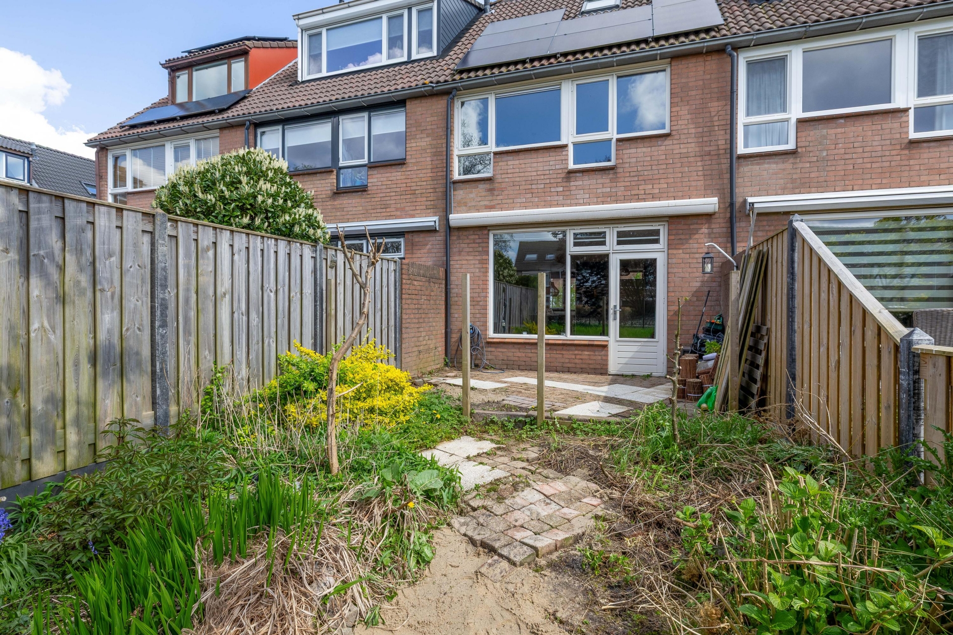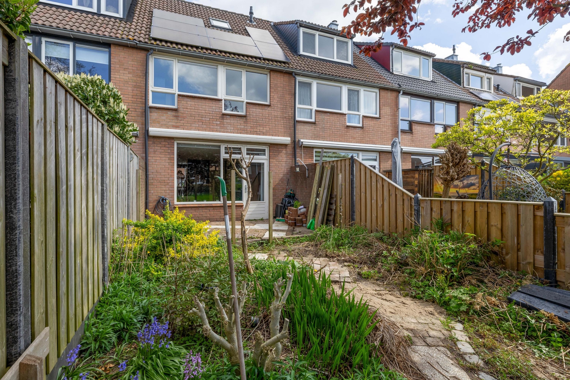 De achtertuin is een echte blikvanger en biedt volop mogelijkheden. Gelegen op het westen kun je hier in de middag en avond heerlijk van de zon genieten. De tuin is speels aangelegd met verschillende niveaus en beplanting, maar kan naar wens verder worden ingericht of gemoderniseerd.