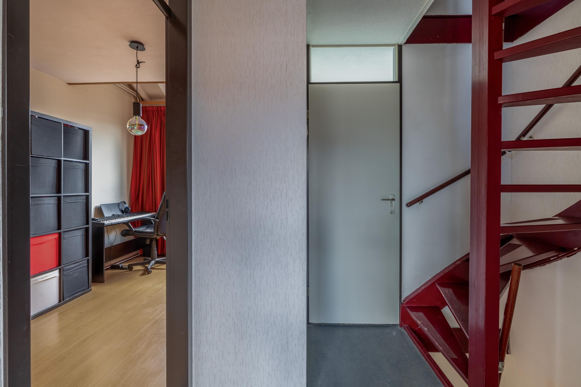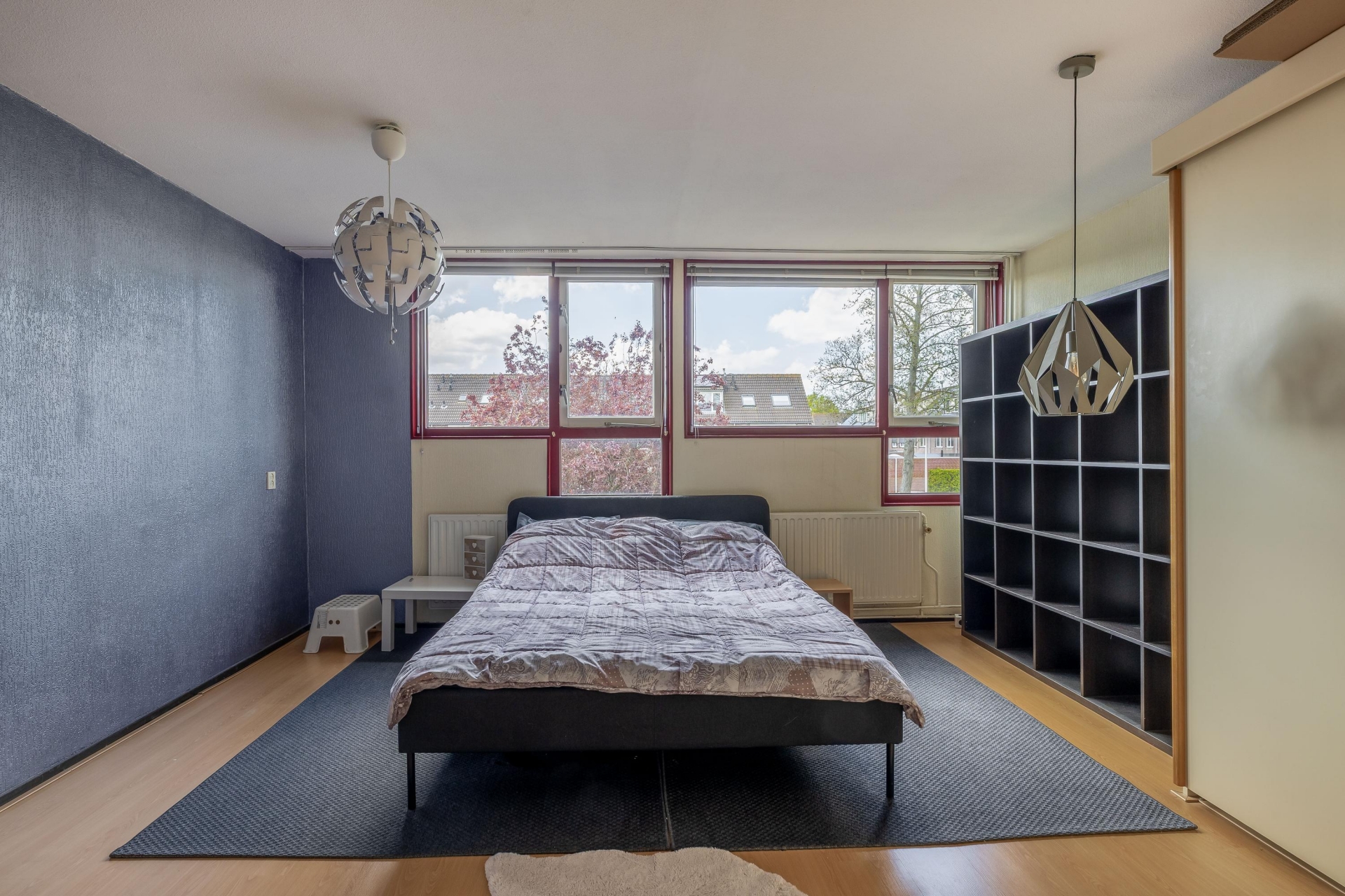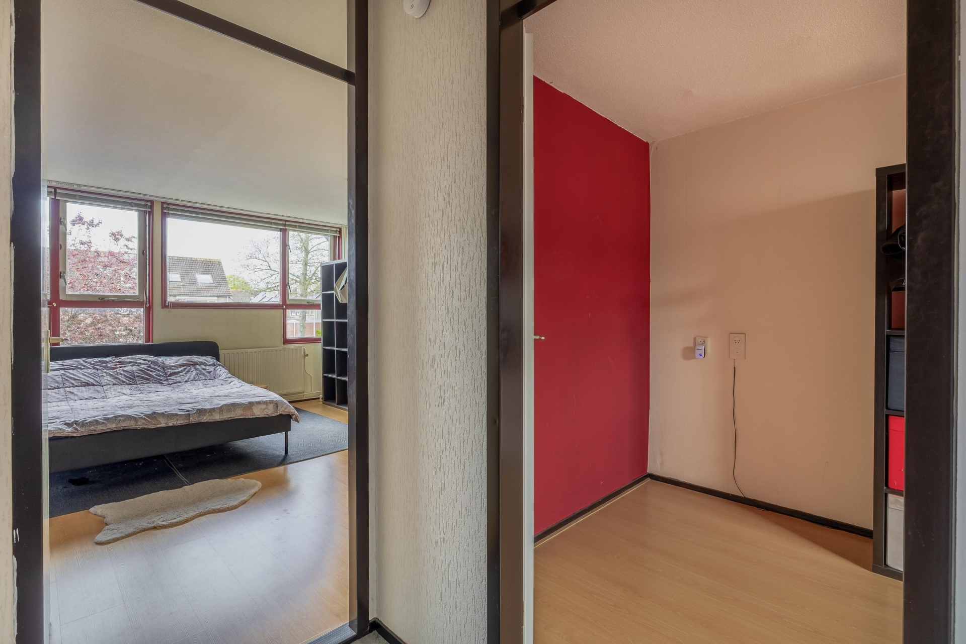 Op de verdiepingen bevinden zich drie slaapkamers van verschillende formaten. De hoofdslaapkamer is ruim opgezet en biedt voldoende plek voor een tweepersoonsbed en een grote kastenwand. Dankzij de grote ramen is ook hier veel lichtinval aanwezig.