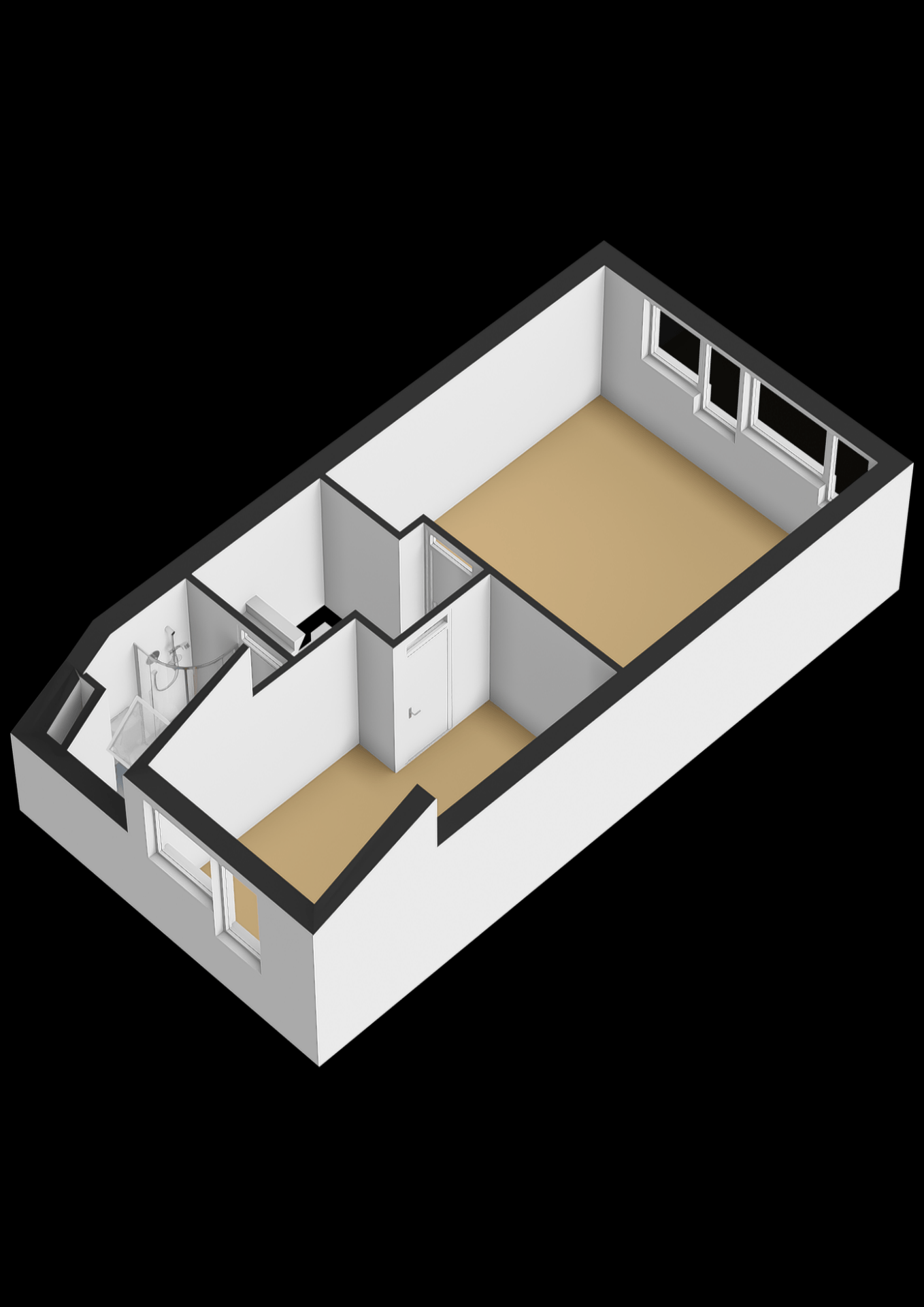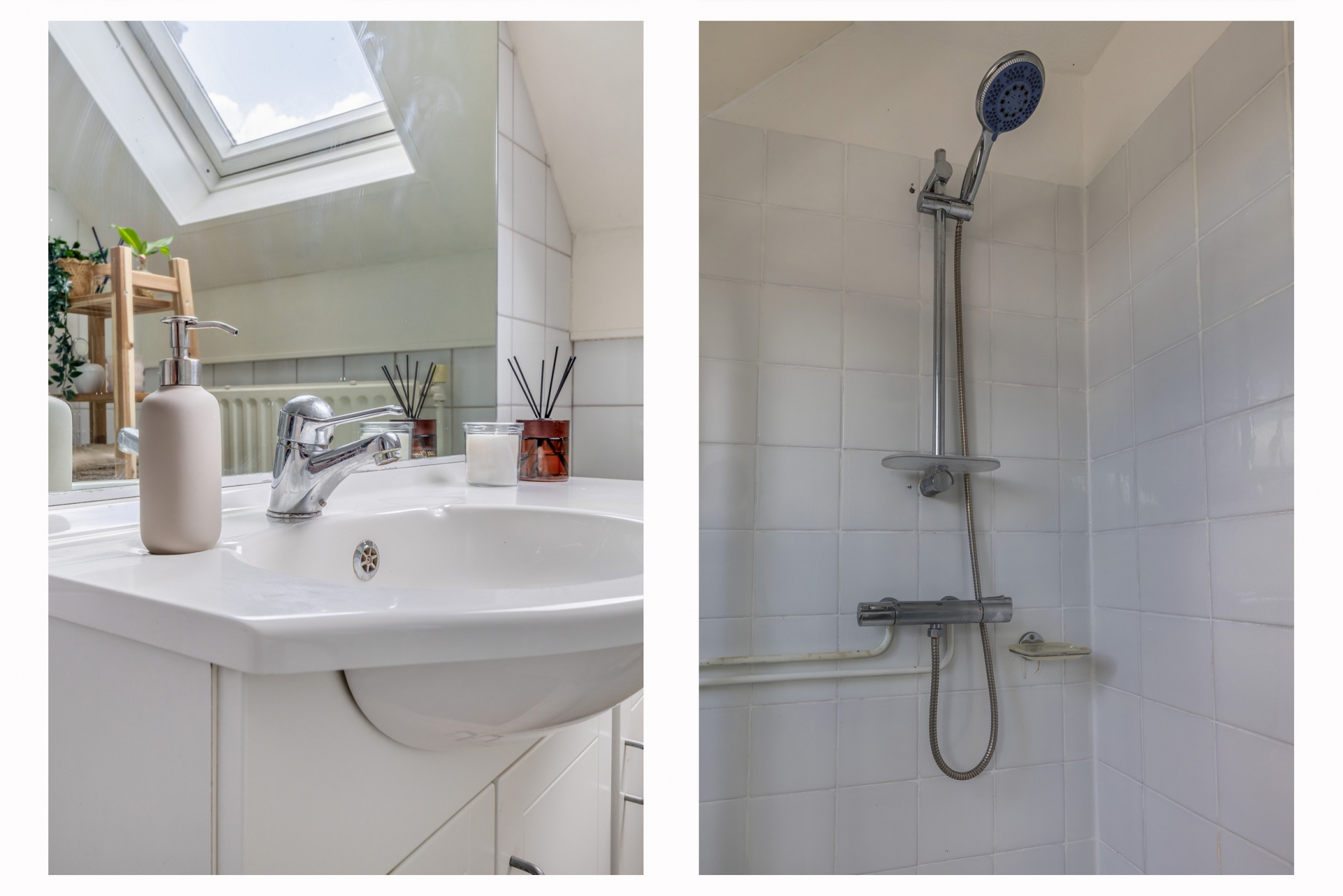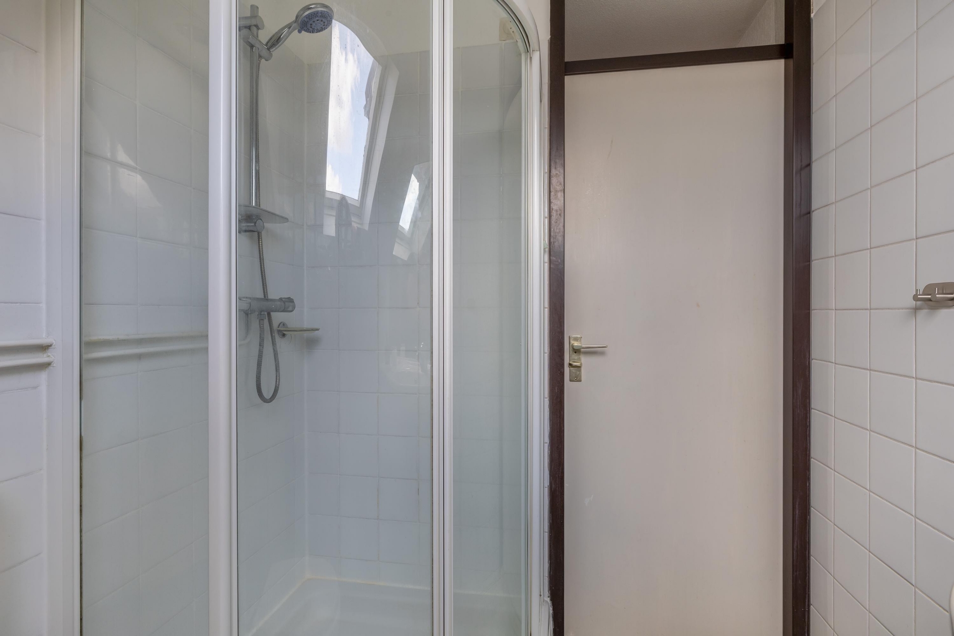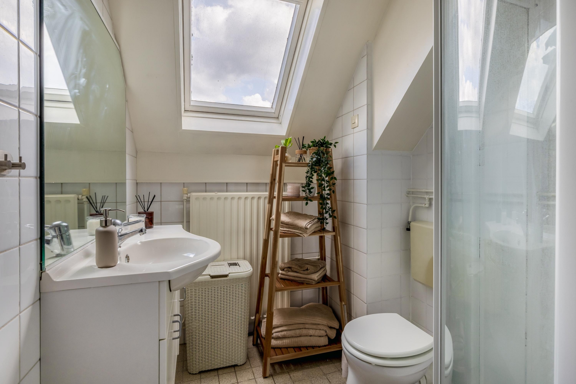 De badkamer is compact maar compleet, voorzien van een douche, toilet en wastafel. Dankzij het dakraam komt er prettig daglicht binnen, wat de ruimte licht en fris maakt.