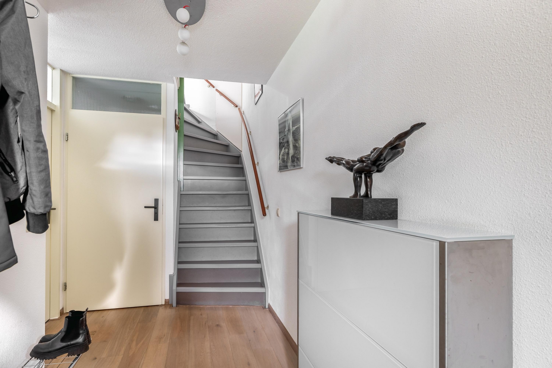 -Entree, hal (8m²) met nieuwe, uitgebreide meterkast, trapopgang en toiletruimte met staand closet en fontein.
