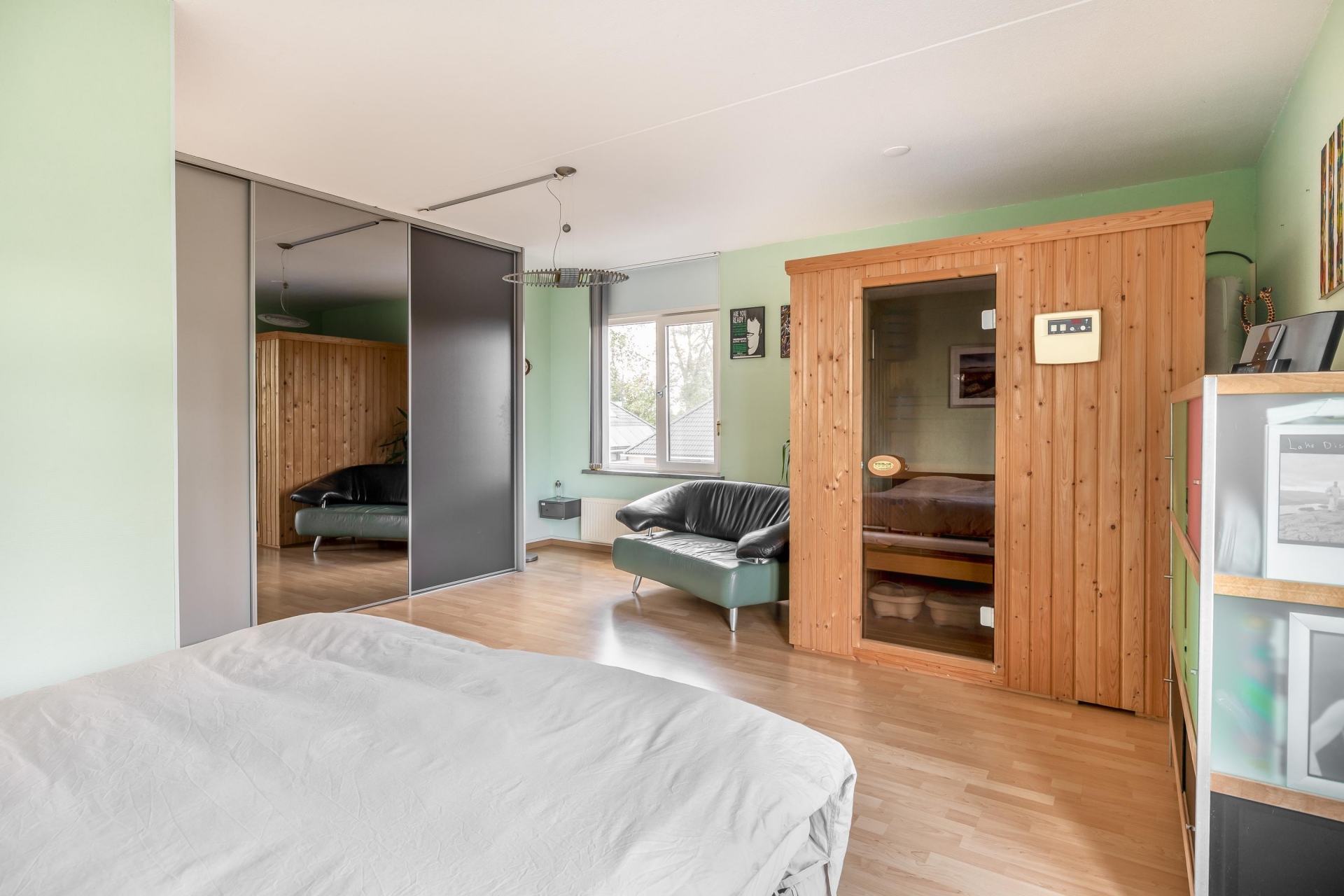 -De masterbedroom (28m²) is voorzien van een sauna en heeft toegang tot een groot dakterras (west, 9m²). Voorheen waren dit twee slaapkamers.