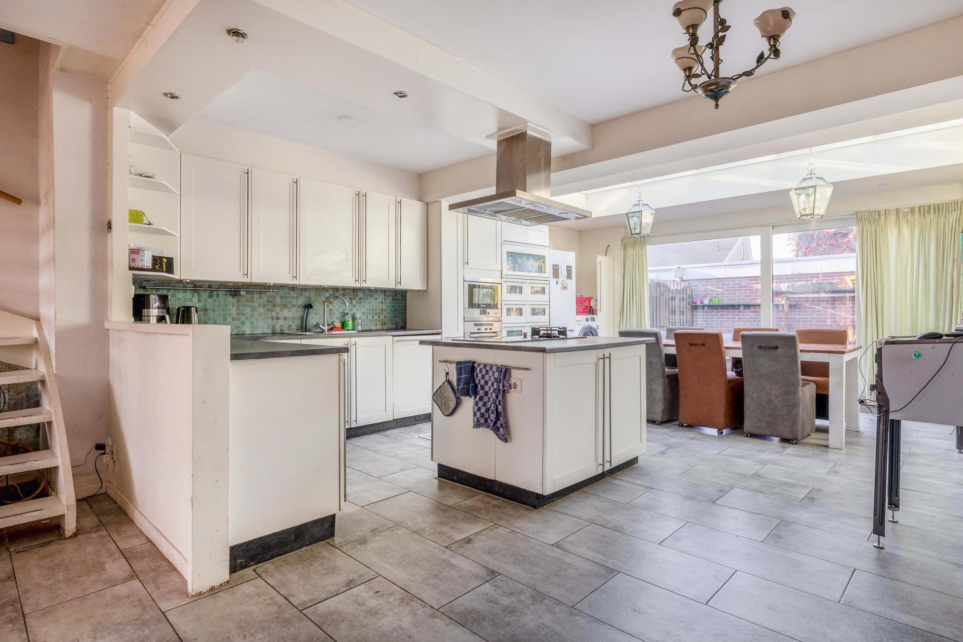 De keuken is van alle gemakken voorzien en heeft veel werk- en opbergruimte. Een echte plek voor wie graag kookt of gezellig lang tafelt. De zichtlijnen vanuit de keuken naar zowel de woonkamer als de tuin zorgen voor een open sfeer waarin je altijd in contact blijft met je gezelschap.