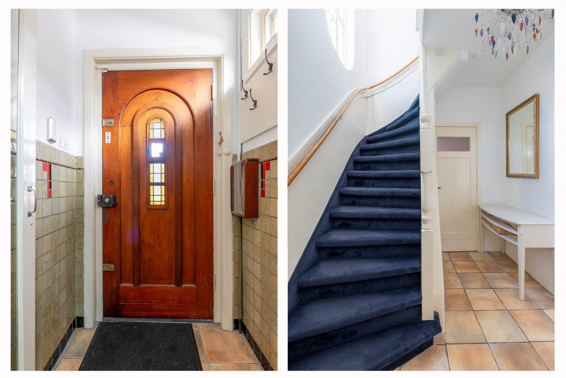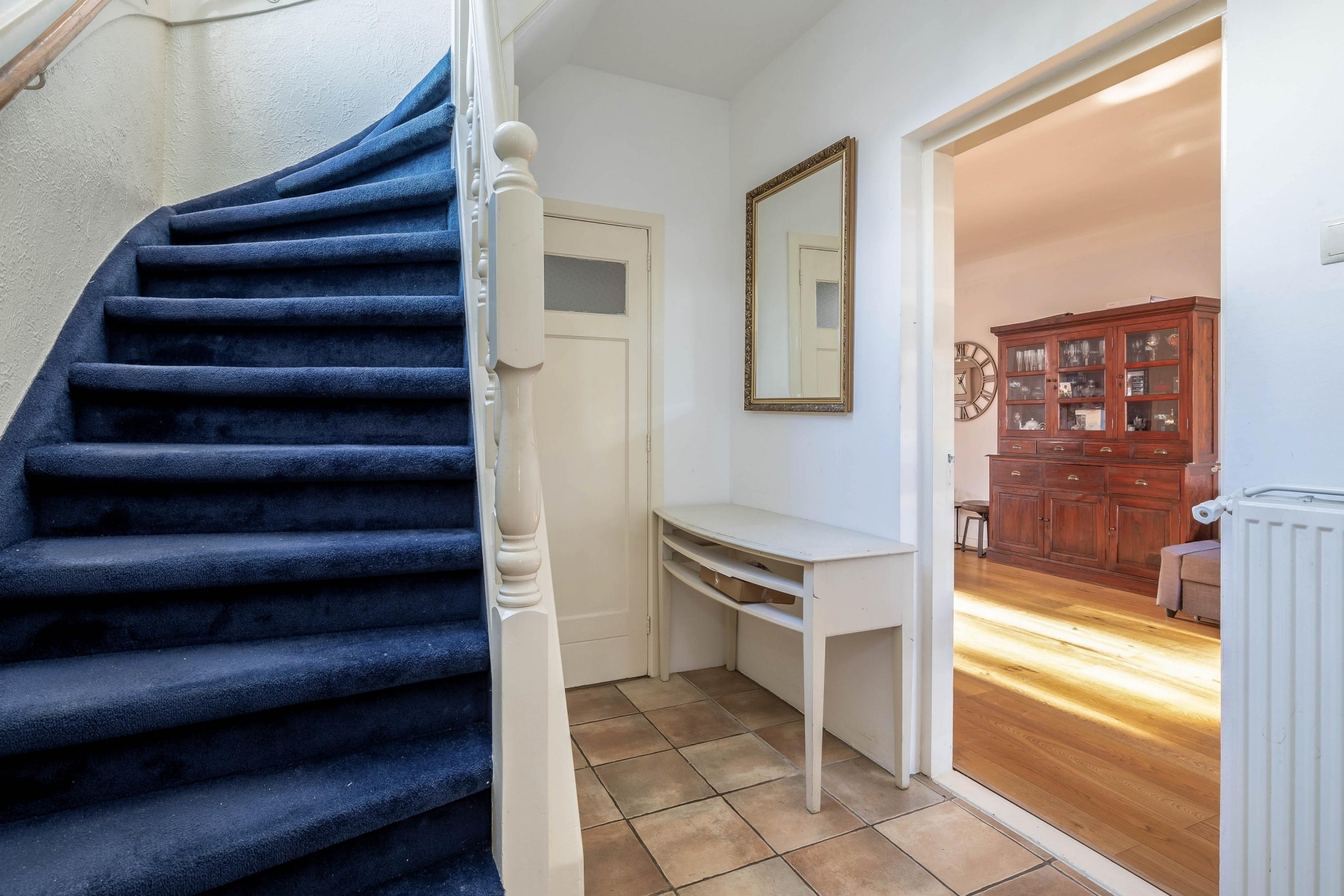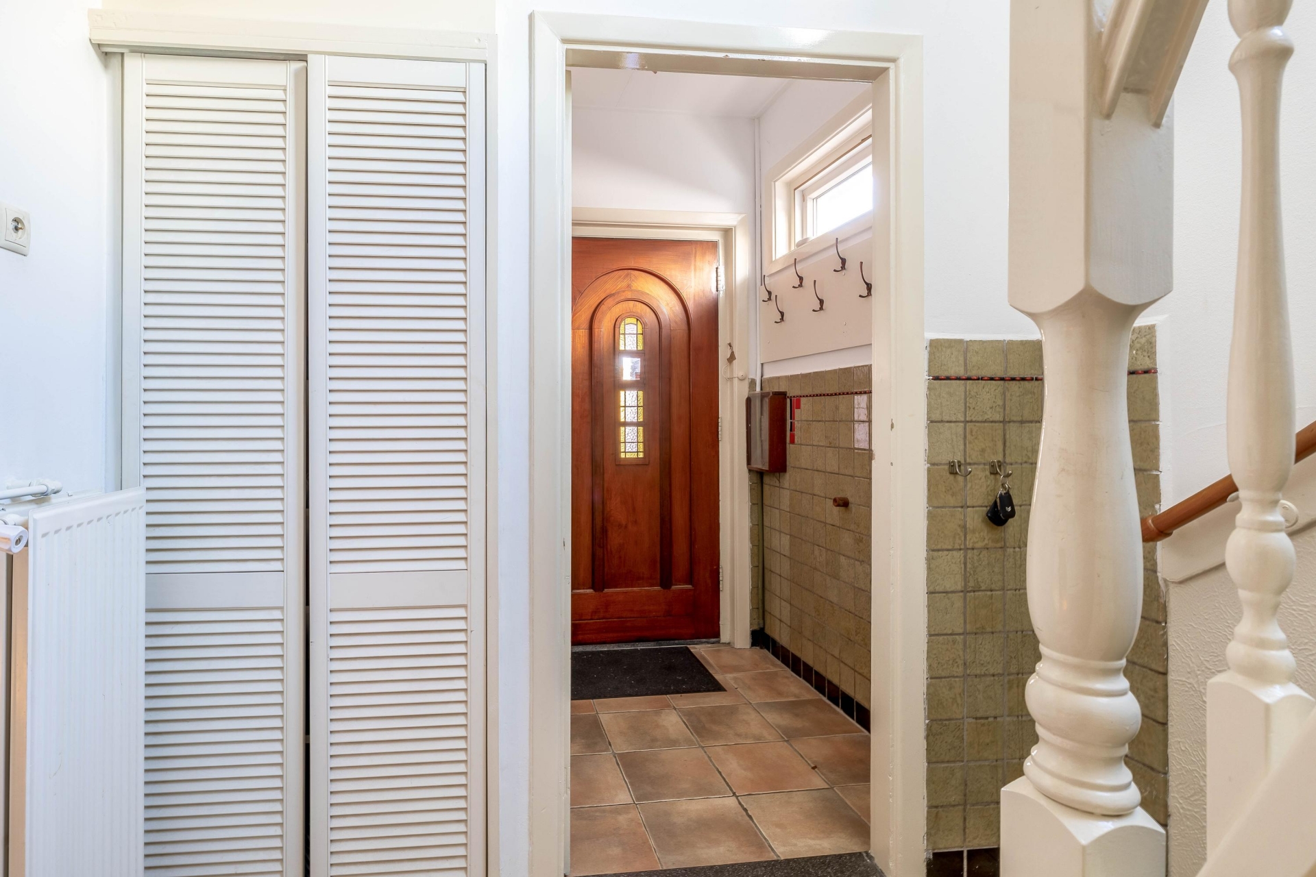 De badkamer is praktisch ingericht met een inloopdouche en wastafel, en er zijn in totaal drie toiletten in de woning. Op de eerste verdieping vind je ook nog een aparte wasruimte, zodat de huishoudelijke taken vlot verlopen. Leuk detail: het prachtige glas-in-loodraam in het trappenhuis geeft het huis extra charme.