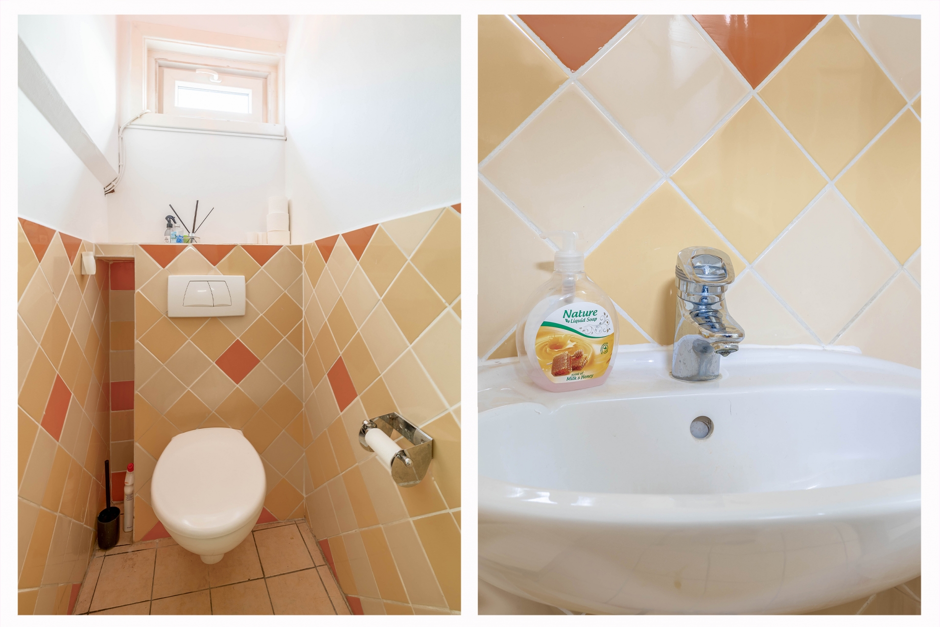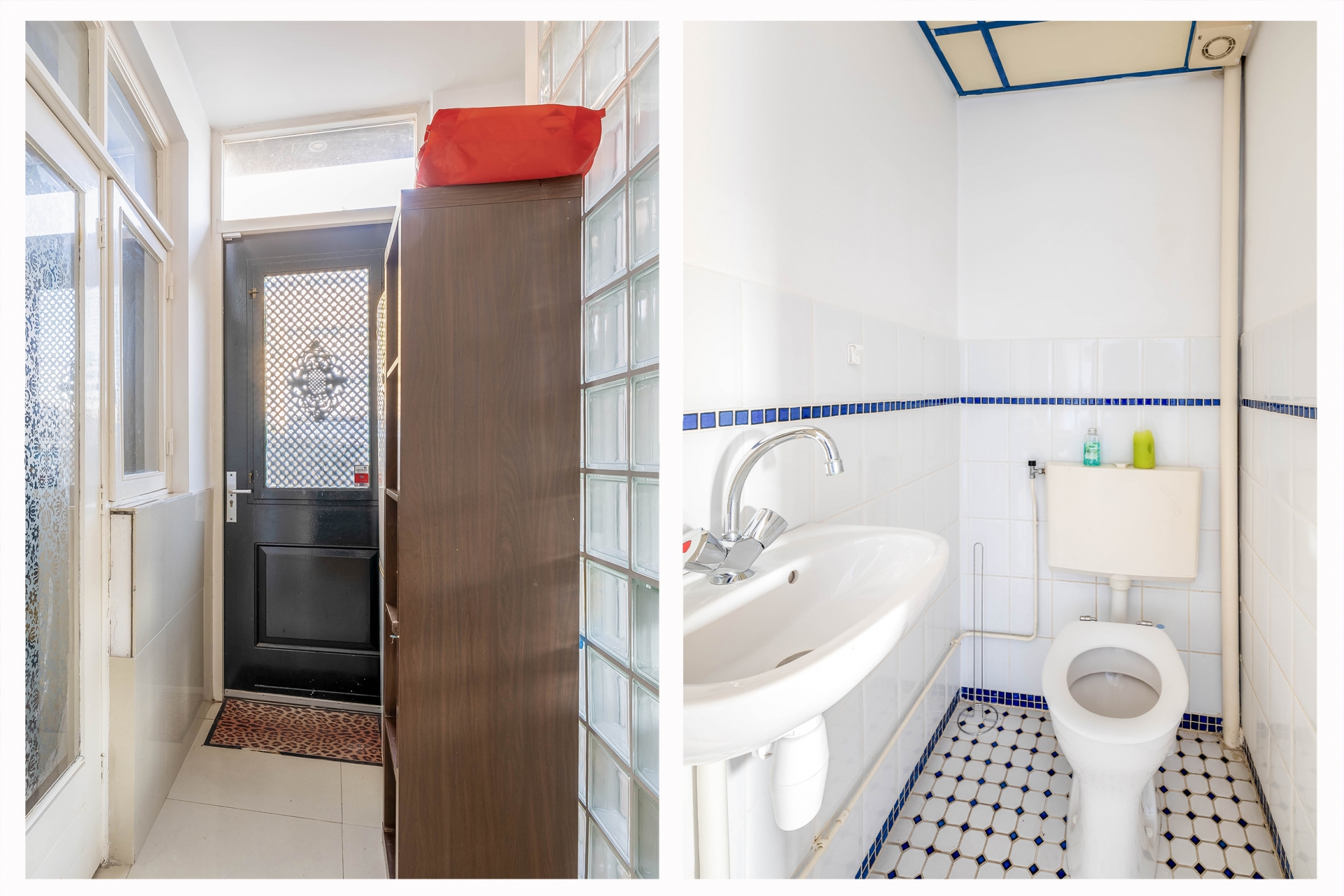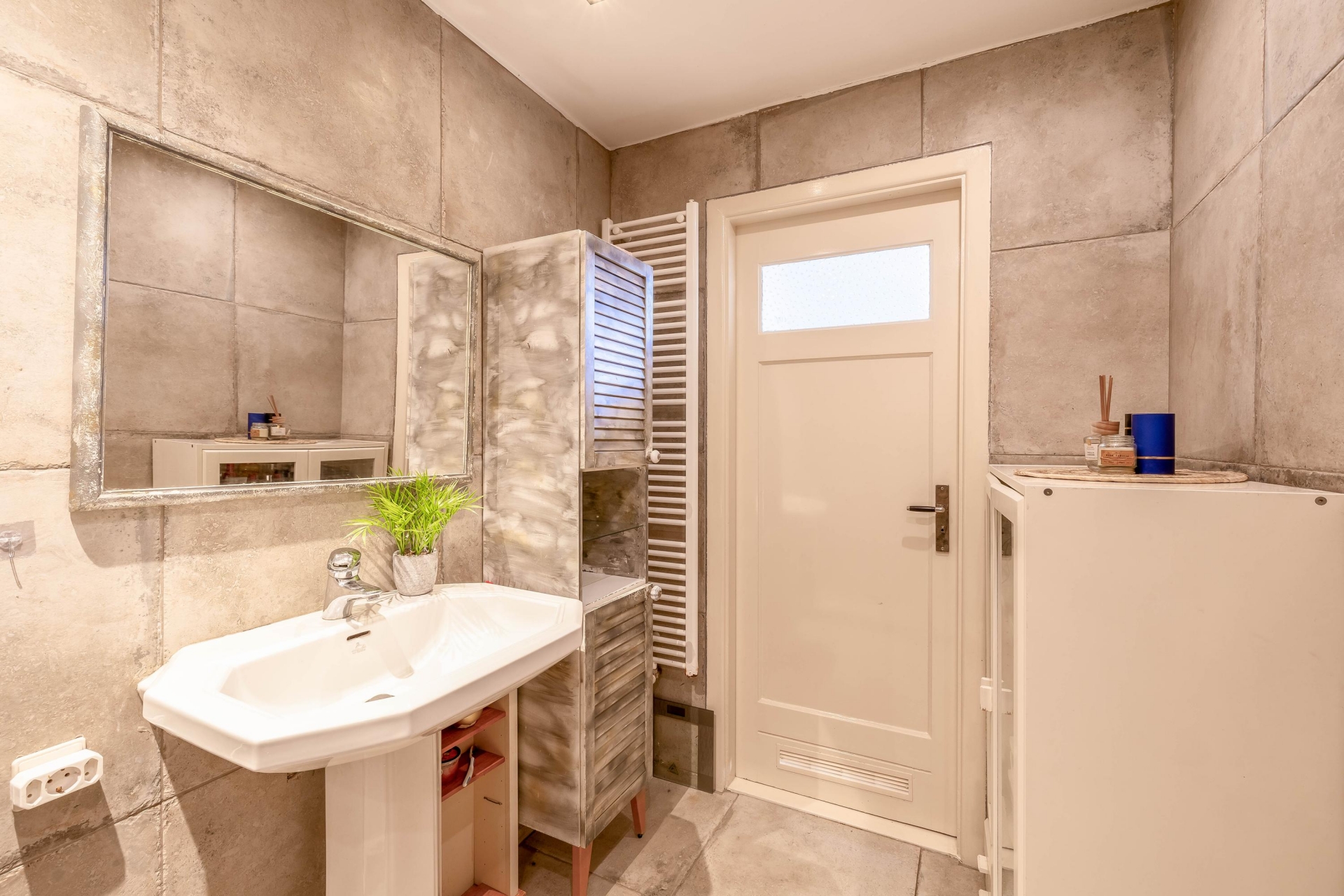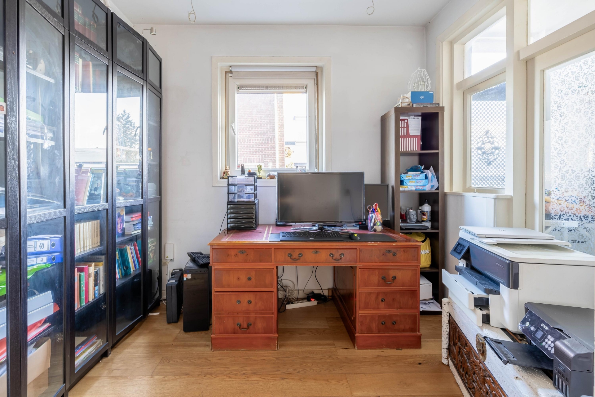 De badkamer is praktisch ingericht met een inloopdouche en wastafel, en er zijn in totaal drie toiletten in de woning. Op de eerste verdieping vind je ook nog een aparte wasruimte, zodat de huishoudelijke taken vlot verlopen. Leuk detail: het prachtige glas-in-loodraam in het trappenhuis geeft het huis extra charme.
