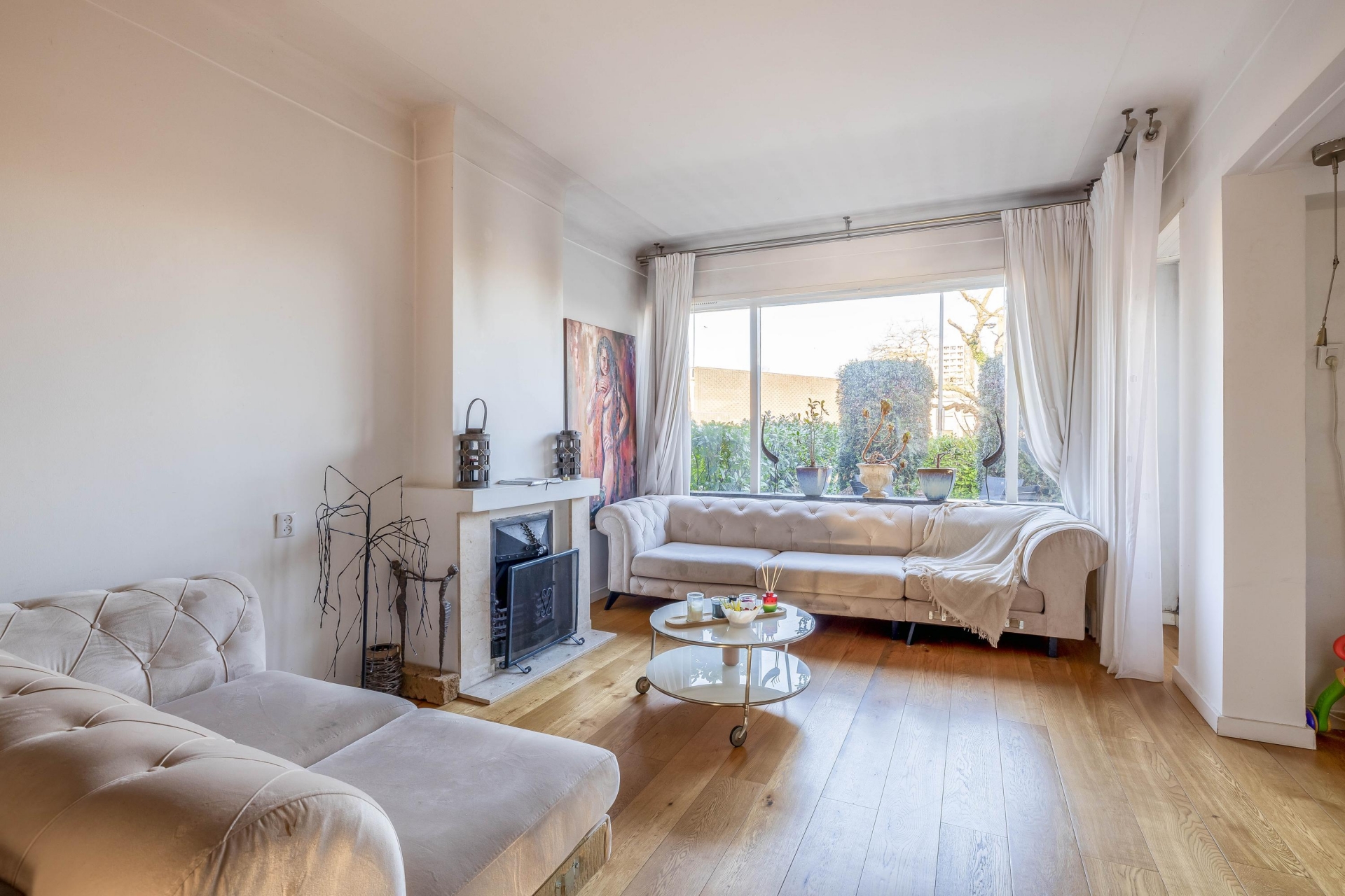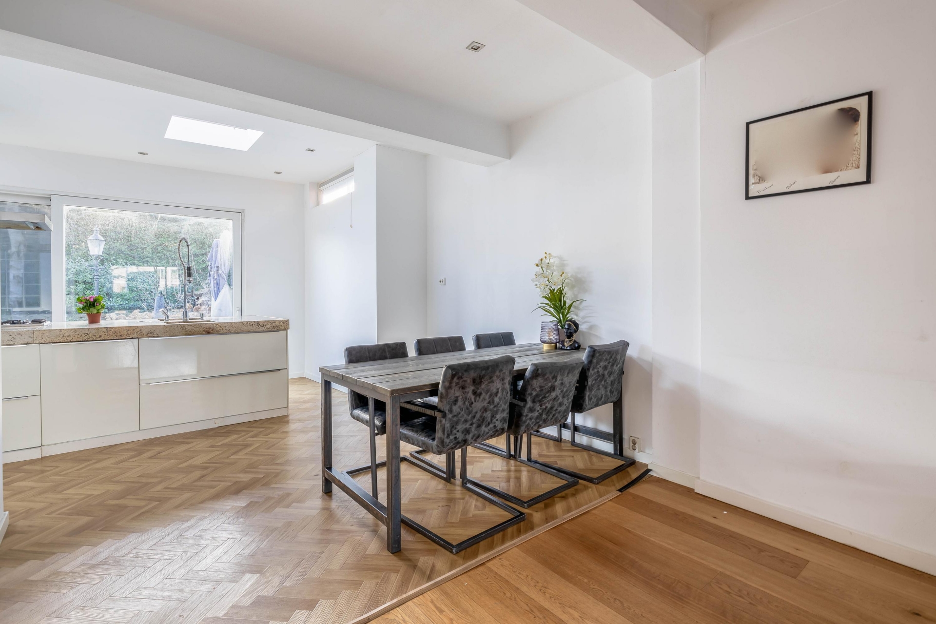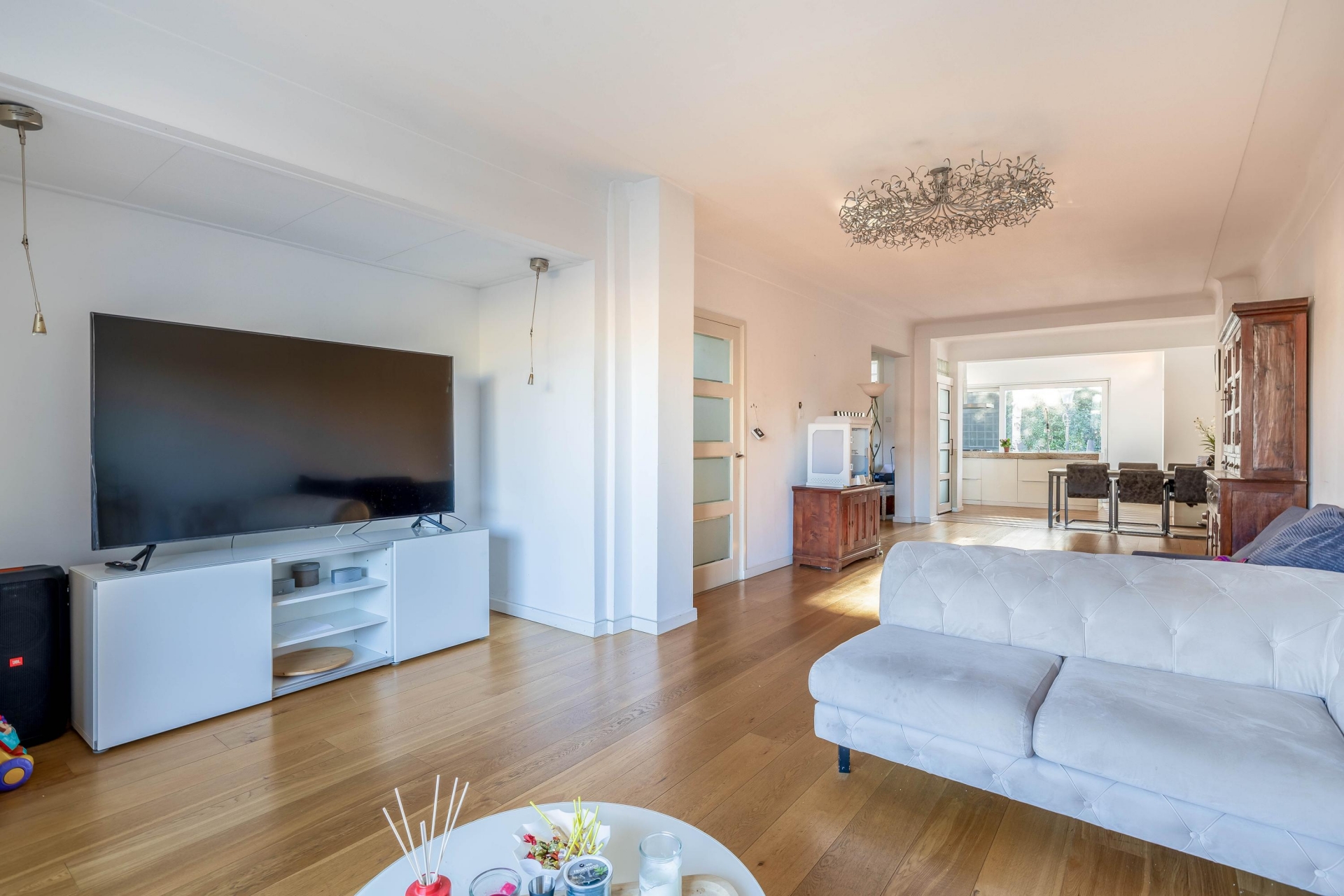 Zodra je binnenstapt, voel je het meteen: licht, ruimte en karakter. De grote raampartijen en openslaande deuren verbinden de leefruimte moeiteloos met de tuin. De woonkamer is lang en breed genoeg om verschillende hoeken te creëren: denk aan een gezellige zithoek, een speelhoek voor de kids of een royale eethoek waar vrienden en familie graag aanschuiven. Vloerverwarming zorgt voor extra comfort in de wintermaanden.