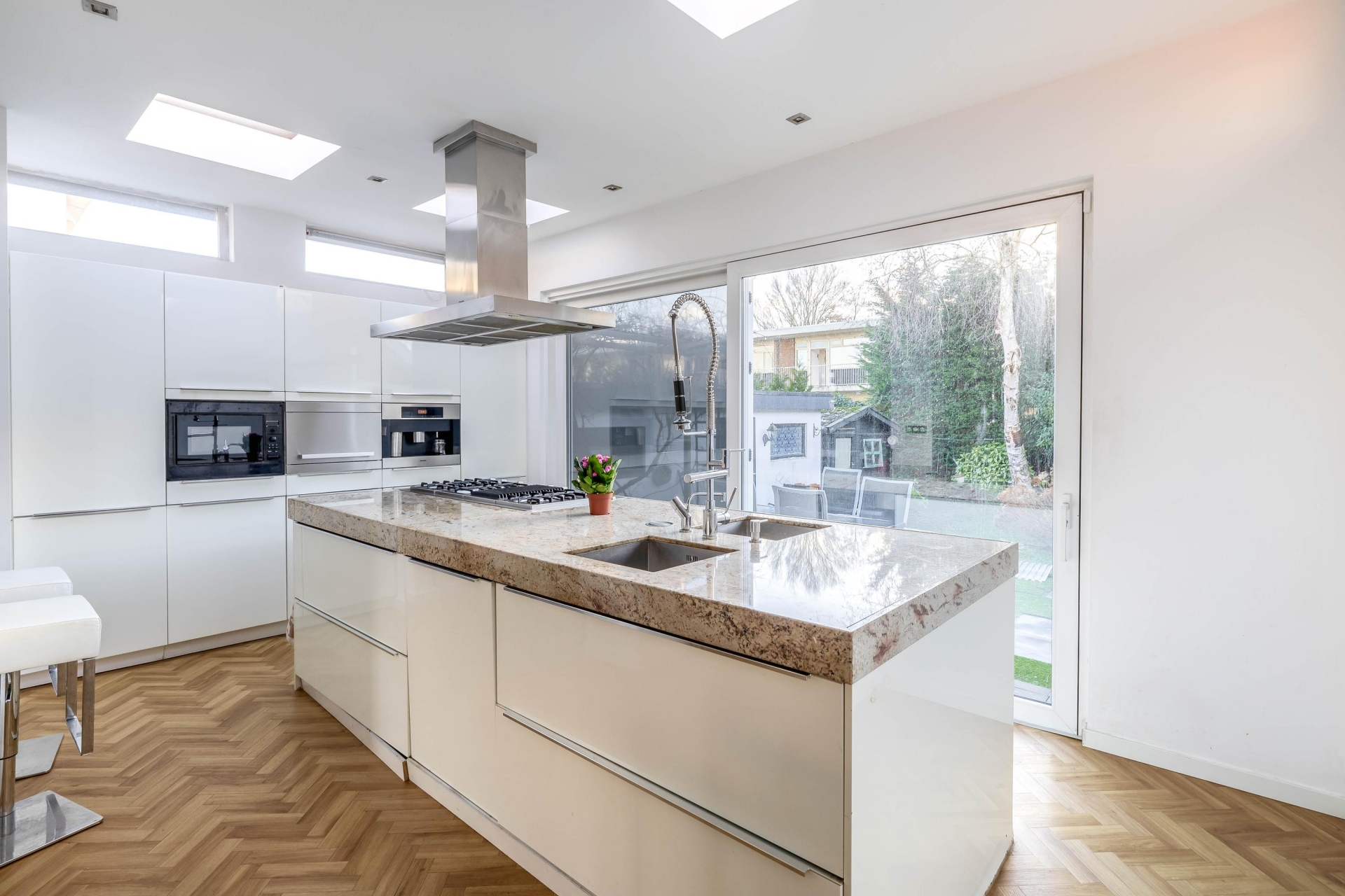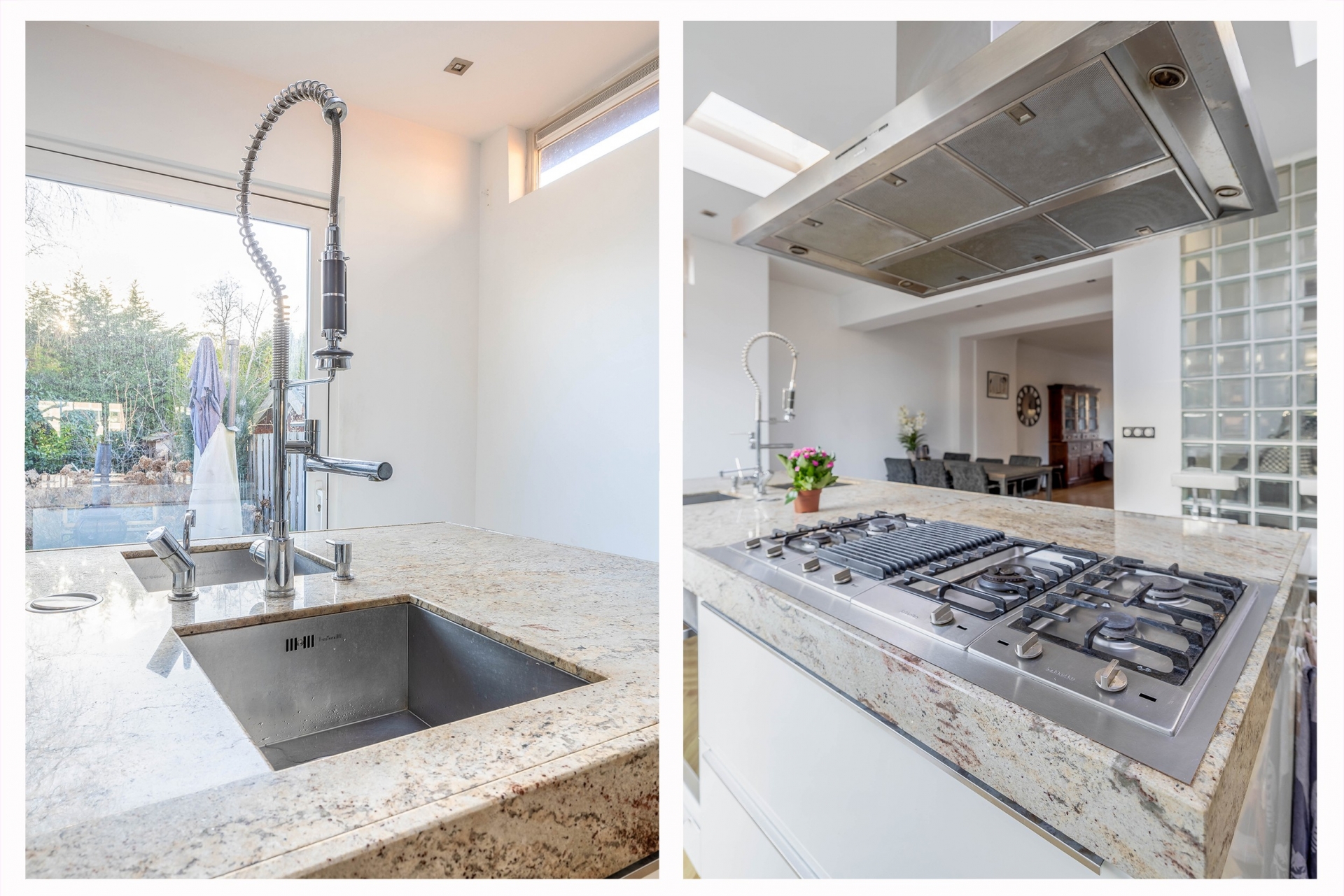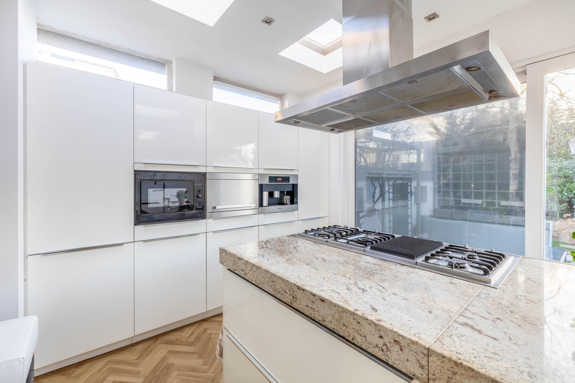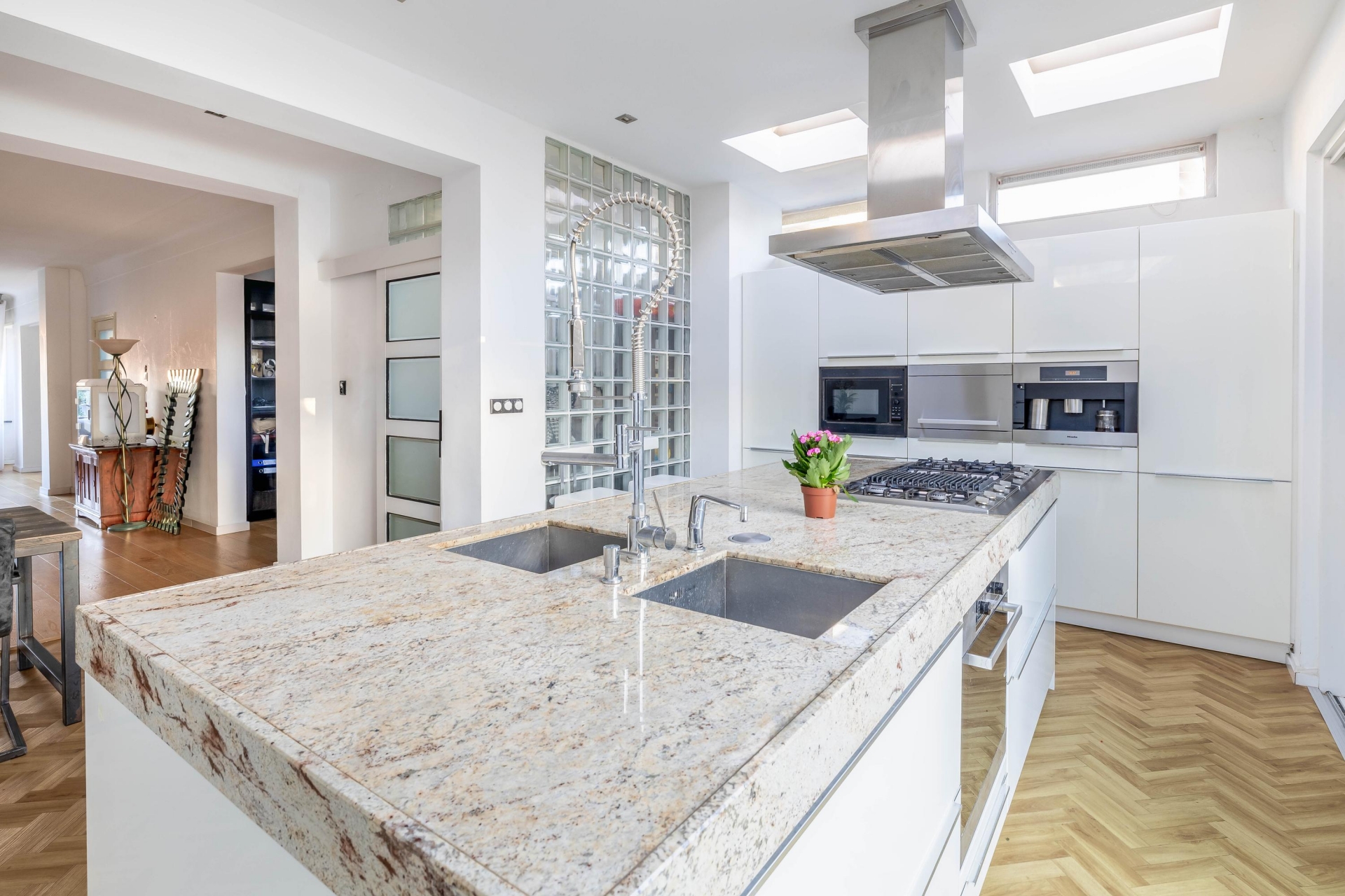 Aansluitend vind je de open woonkeuken, het kloppend hart van het huis. Dankzij twee dakkoepels baadt de keuken in natuurlijk licht. Hier kook je als een chef met een groot kook-/spoeleiland, veel inbouwapparatuur en voldoende bergruimte. Een plek om samen te komen, te koken én te genieten.