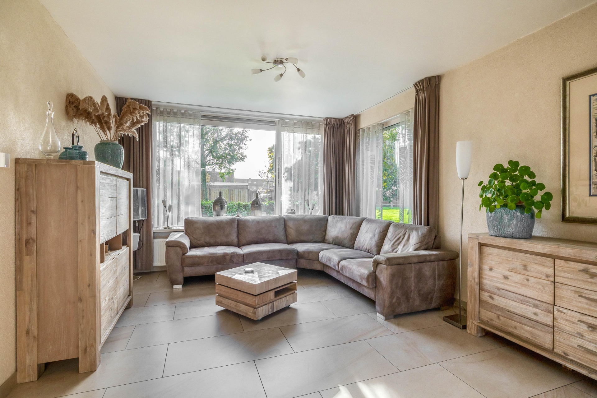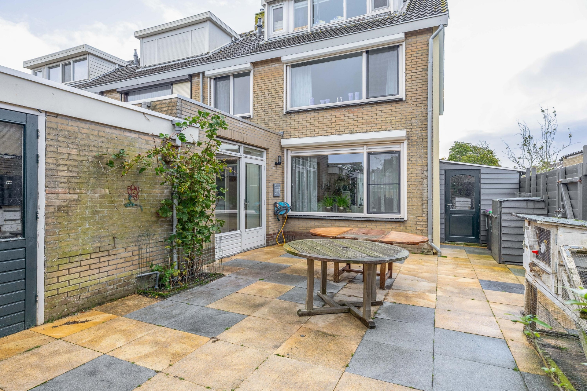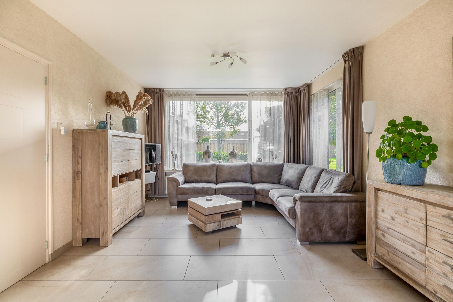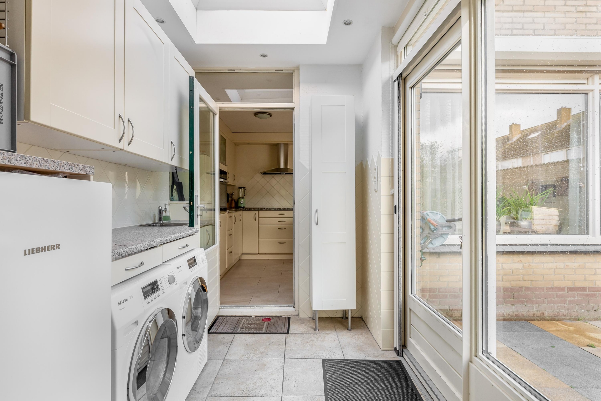 De begane grond voelt meteen prettig aan. De lichte hal met trapopgang geeft toegang tot de woonkamer, die dankzij de grote raampartijen heerlijk licht is. De plavuizen vloer met vloerverwarming zorgt niet alleen voor comfort, maar ook voor een moderne uitstraling. Aan de achterzijde is de woning uitgebouwd en vind je de praktische bijkeuken met extra werk- en bergruimte — ideaal als wasruimte, extra keukenopslag of speelruimte voor de kinderen. Via de bijkeuken stap je zó de zonnige achtertuin in. Ook aan de zijkant van het huis is extra ruimte gecreëerd met een aangebouwde berging én een eigen stenen garage achterin de tuin.