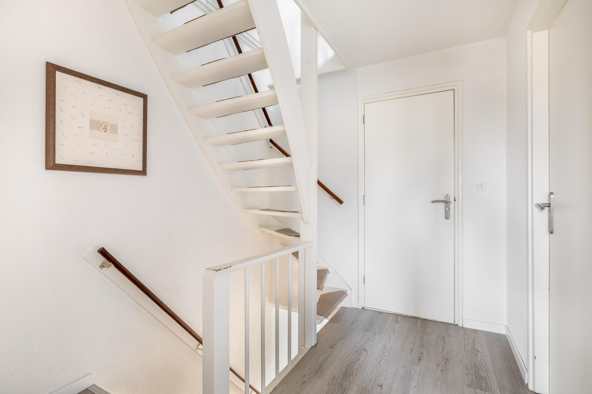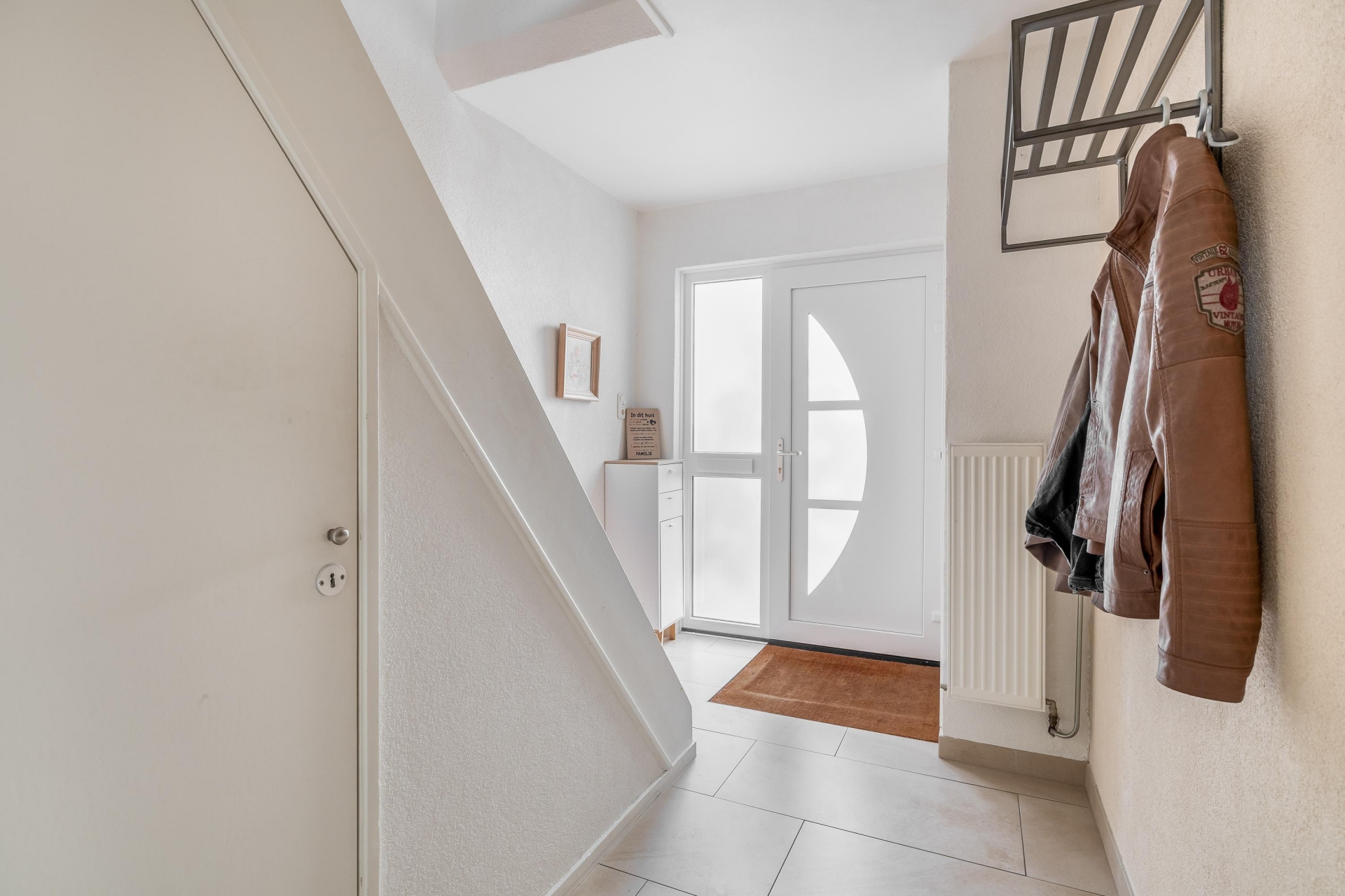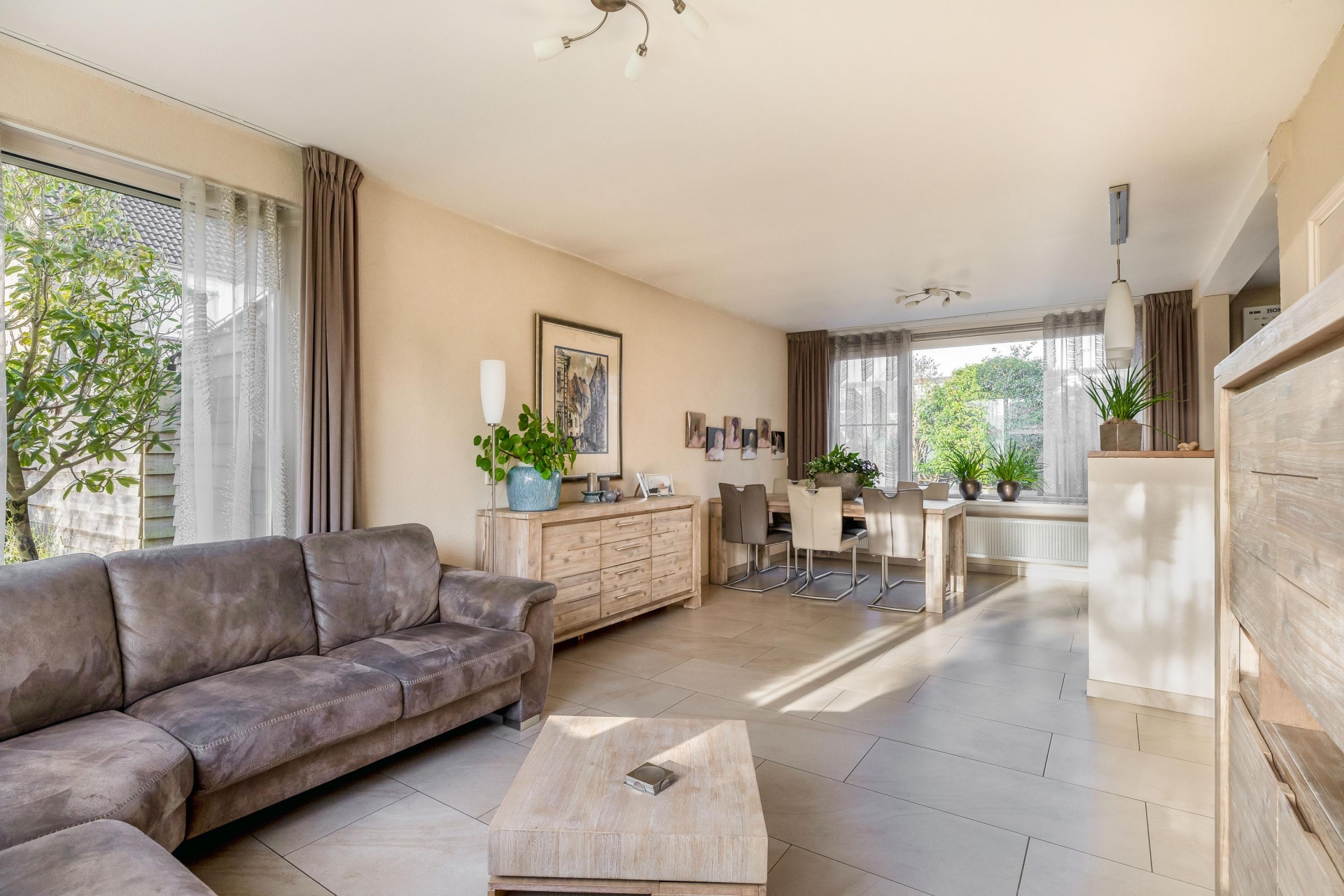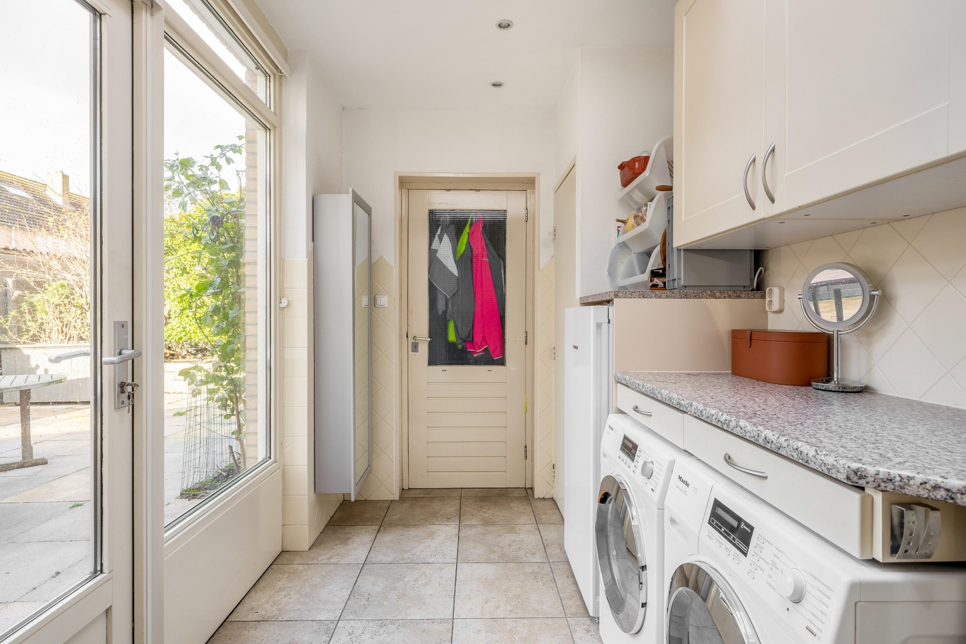 De begane grond voelt meteen prettig aan. De lichte hal met trapopgang geeft toegang tot de woonkamer, die dankzij de grote raampartijen heerlijk licht is. De plavuizen vloer met vloerverwarming zorgt niet alleen voor comfort, maar ook voor een moderne uitstraling. Aan de achterzijde is de woning uitgebouwd en vind je de praktische bijkeuken met extra werk- en bergruimte — ideaal als wasruimte, extra keukenopslag of speelruimte voor de kinderen. Via de bijkeuken stap je zó de zonnige achtertuin in. Ook aan de zijkant van het huis is extra ruimte gecreëerd met een aangebouwde berging én een eigen stenen garage achterin de tuin.