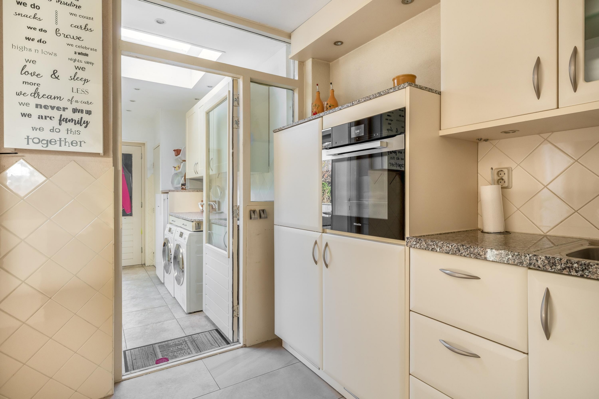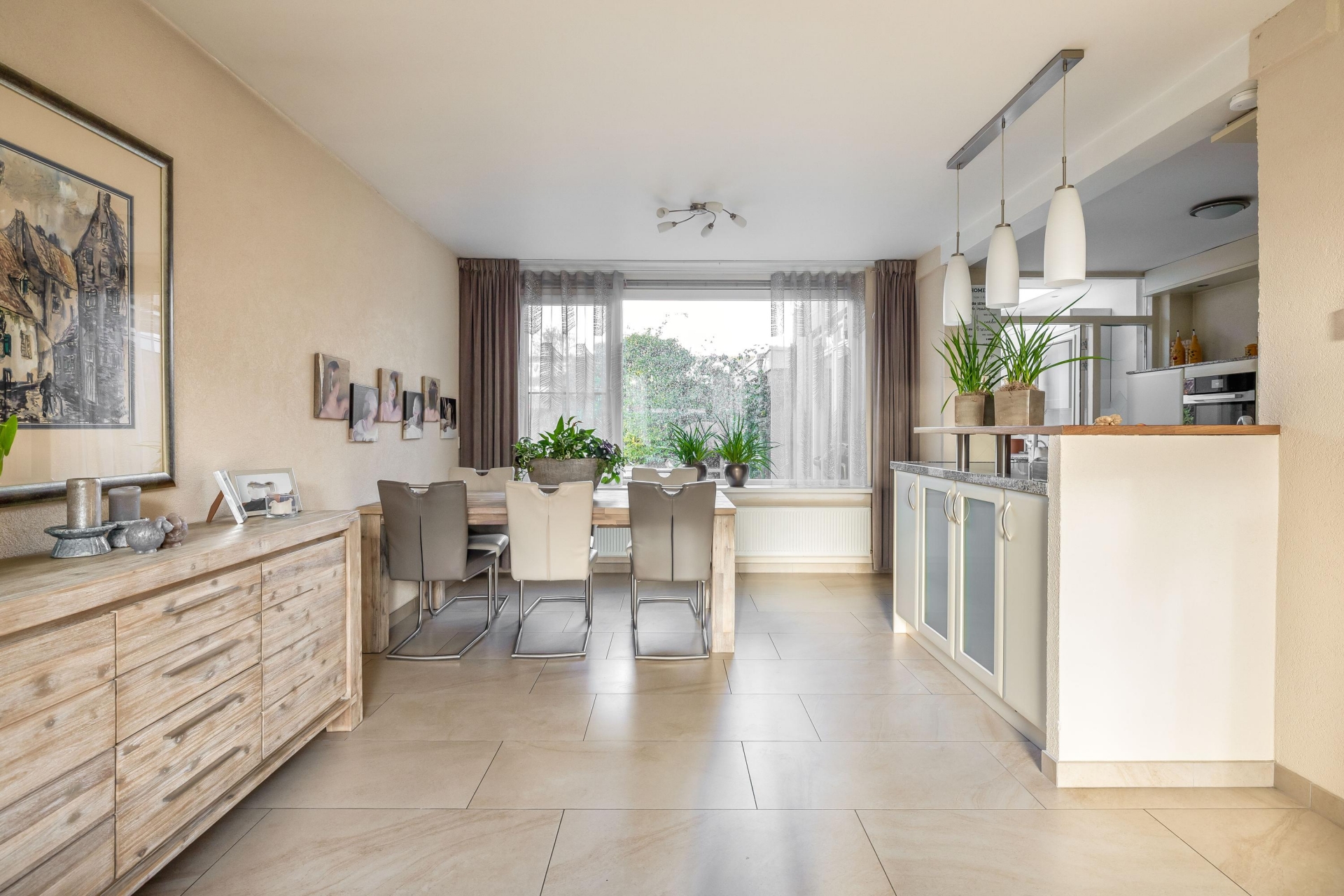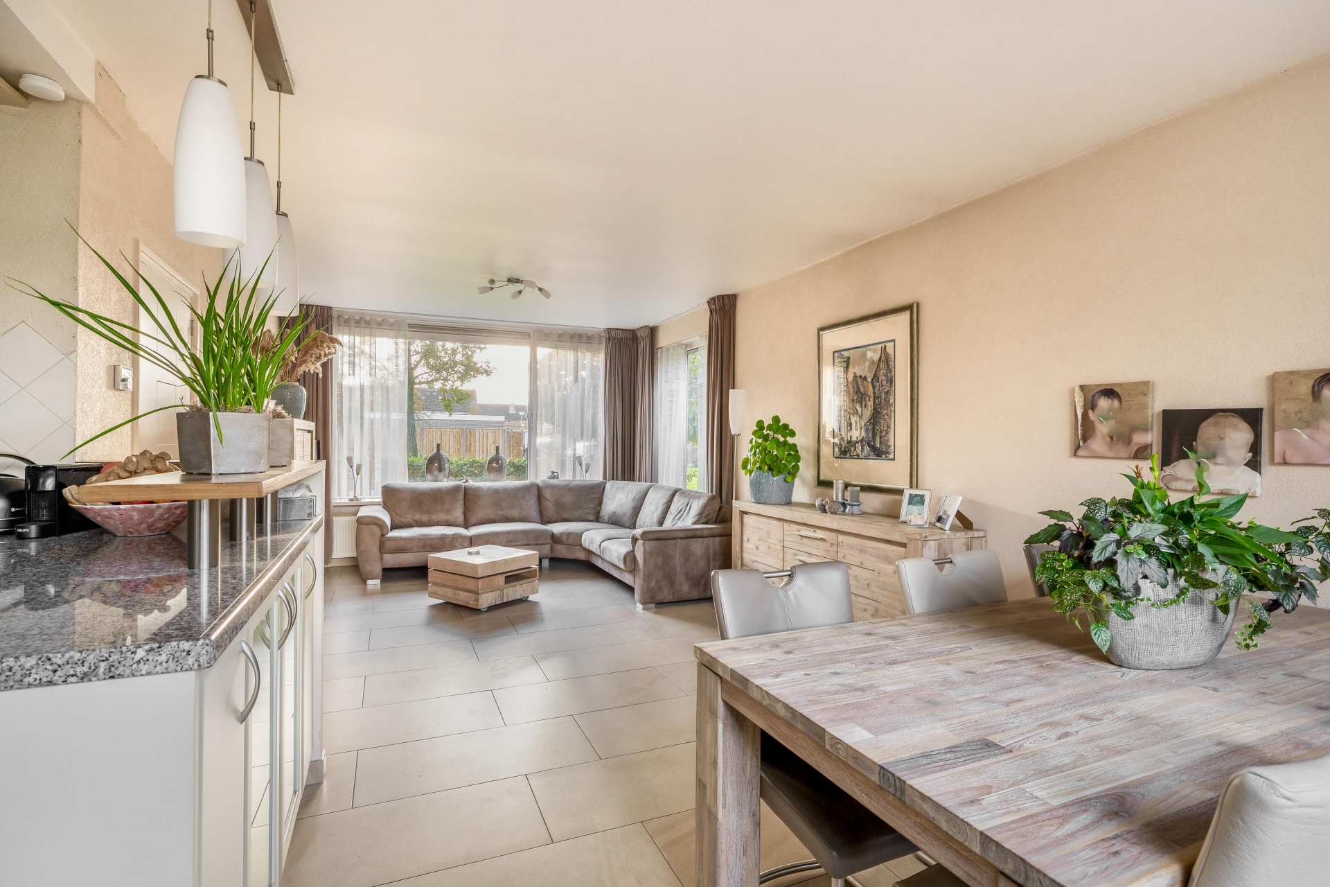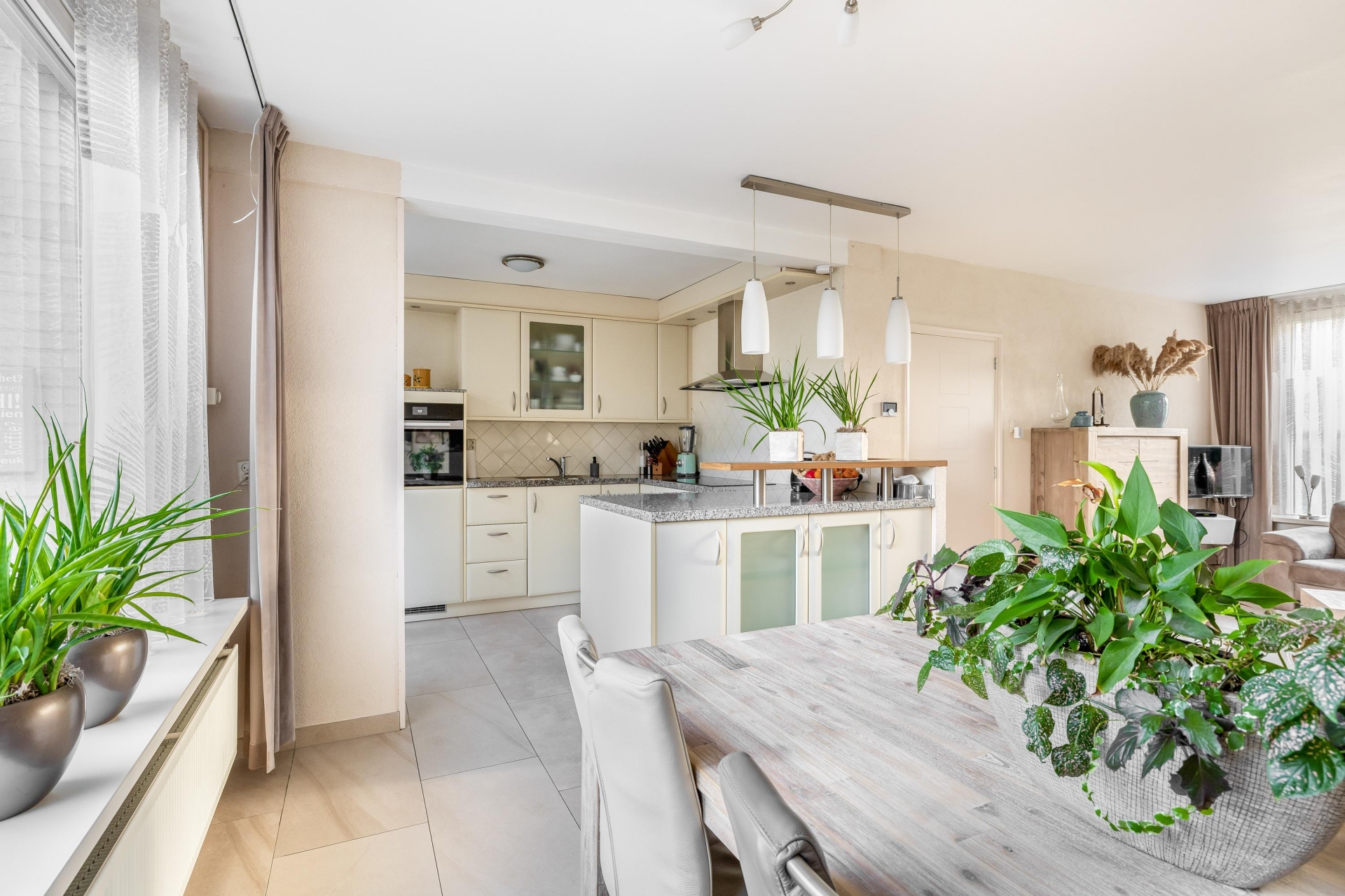 HALF OPEN KEUKEN MET ZICHT OP TUIN EN WOONKAMER