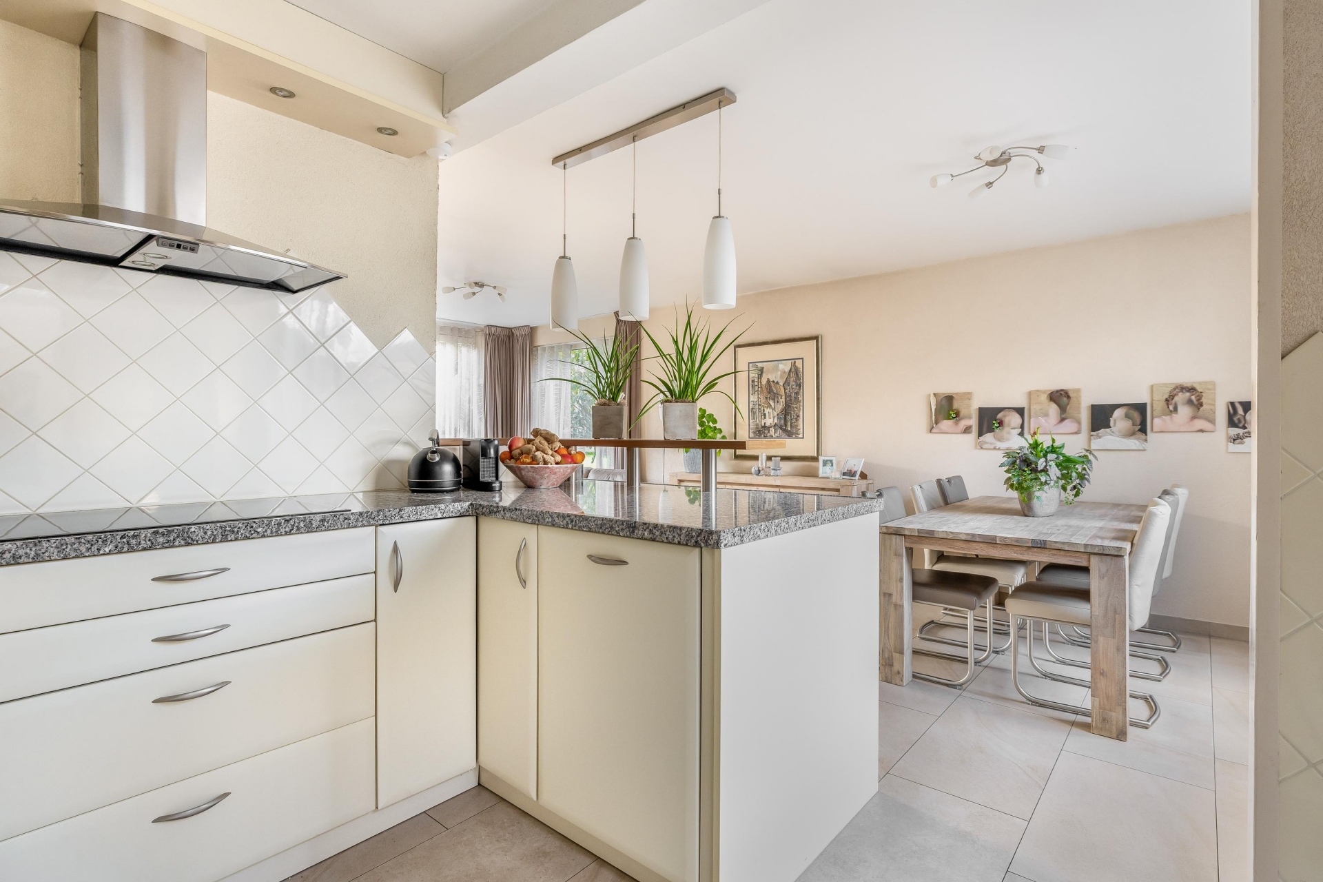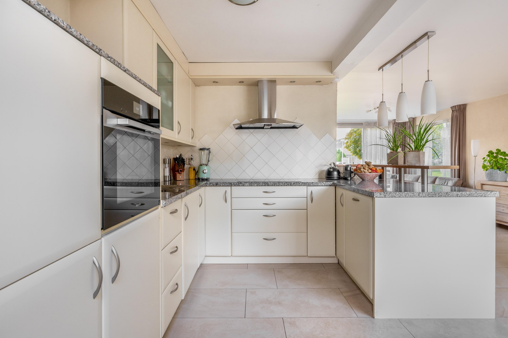 De keuken is geplaatst in een praktische opstelling en bevindt zich aan de achterzijde van de woning, met een prettig uitzicht op de tuin. Hier beschik je over alle benodigde inbouwapparatuur, waaronder een inductiekookplaat, een afzuigkap, een vaatwasser, een koelkast, een vriezer en voldoende kastruimte. Dankzij de open verbinding met de woonkamer blijf je altijd betrokken bij wat er in huis gebeurt — ideaal tijdens het koken of borrelen met vrienden of familie.