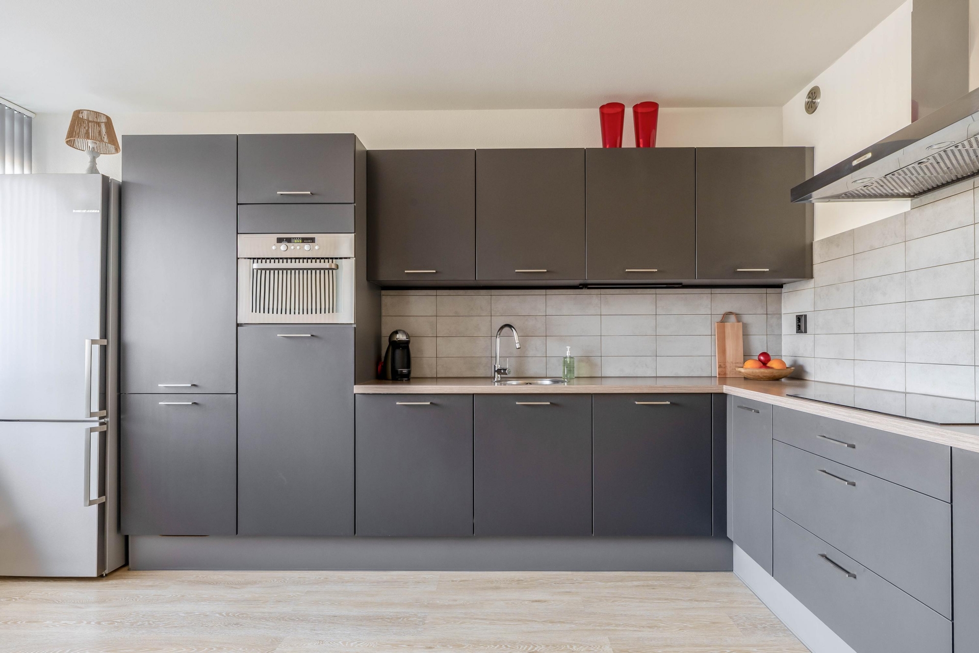 Aan de voorzijde van het huis ligt de keuken. Deze is modern uitgevoerd met strakke fronten en een praktisch werkblad. Je hebt hier alle ruimte om te koken en voldoende kastruimte voor al je spullen. Door de opstelling blijft de verbinding met de rest van het huis prettig en open.