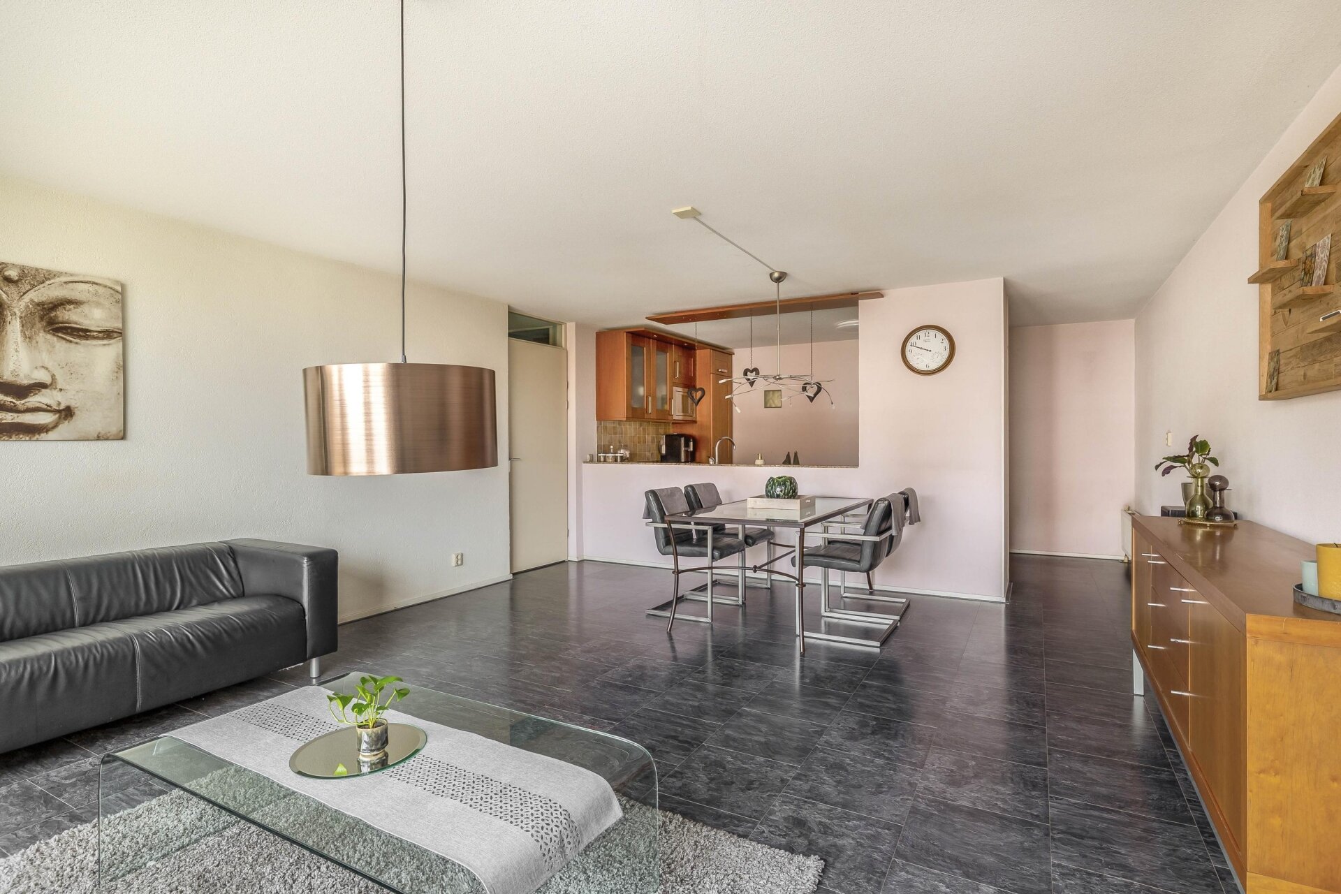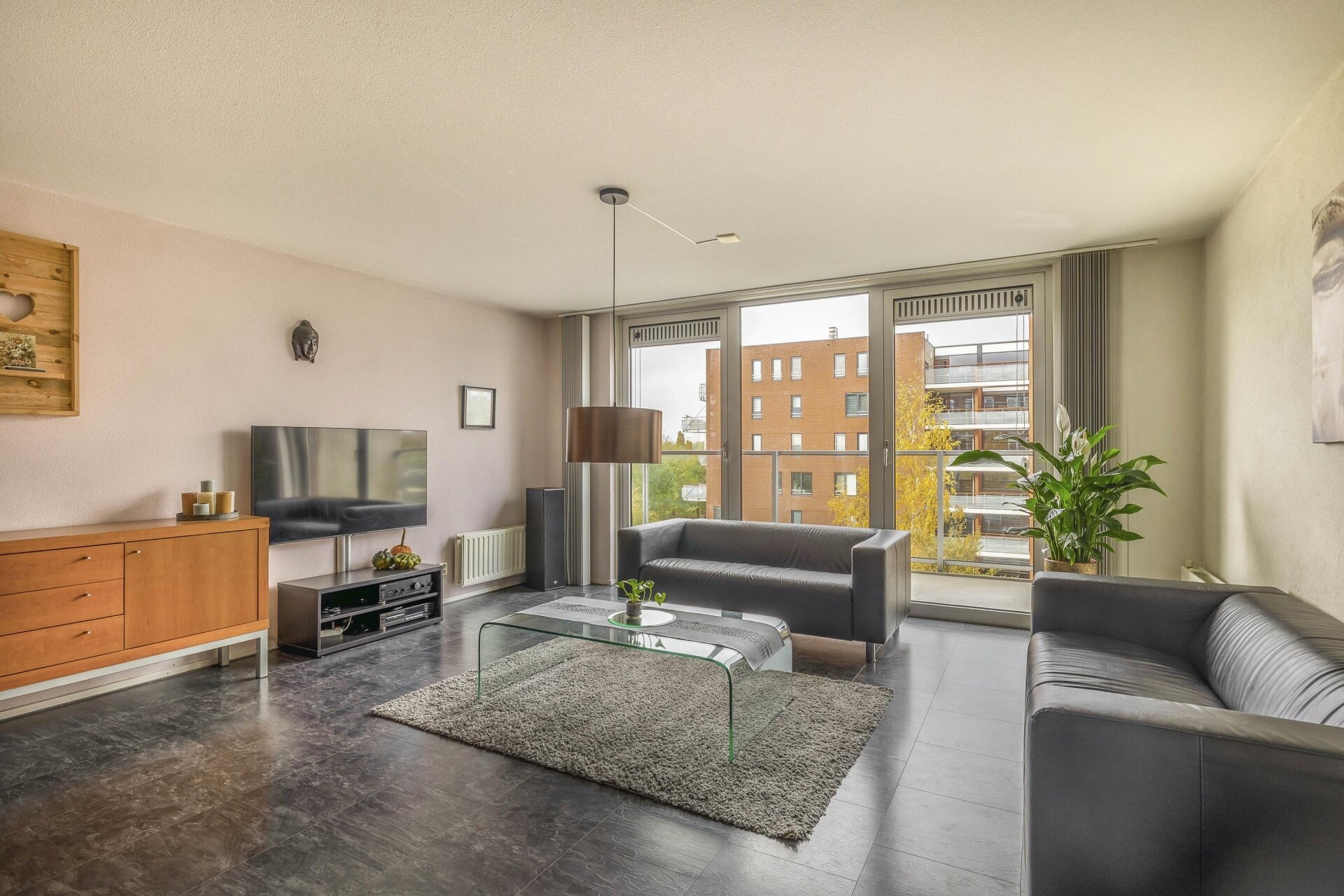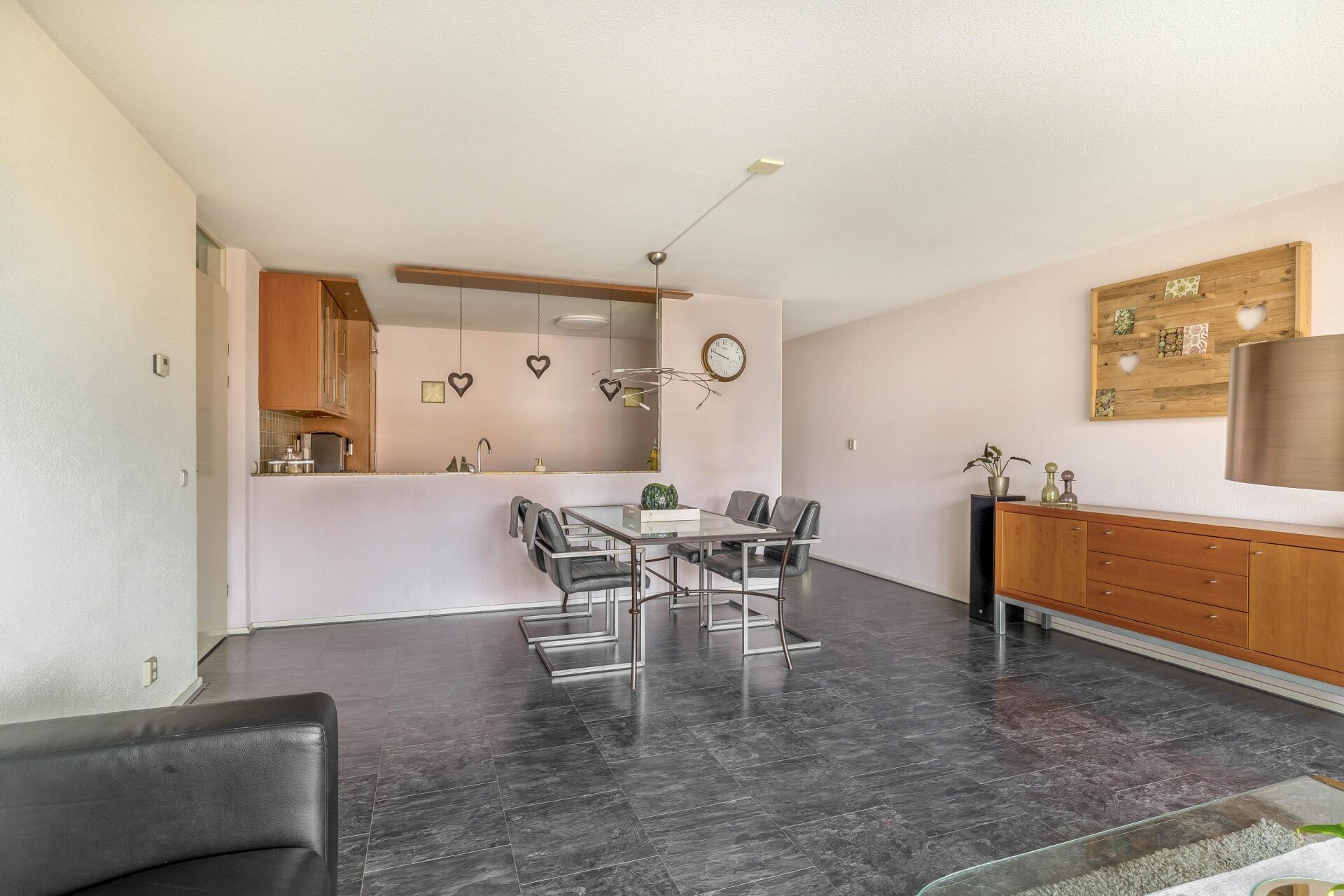 De woonkamer is opvallend ruim en lekker licht, dankzij de brede raampartijen over de volle breedte van het appartement. Hier kijk je vrij uit over de groene omgeving en loop je via de openslaande deuren zo het balkon op. Dankzij de westelijke ligging geniet je in de middag en avond van de zon, een perfecte plek om buiten te zitten met een boek of drankje. Aan de achtergevel hangt een zeer praktisch zonnescherm met grand volant tegen de laaghangende zon.