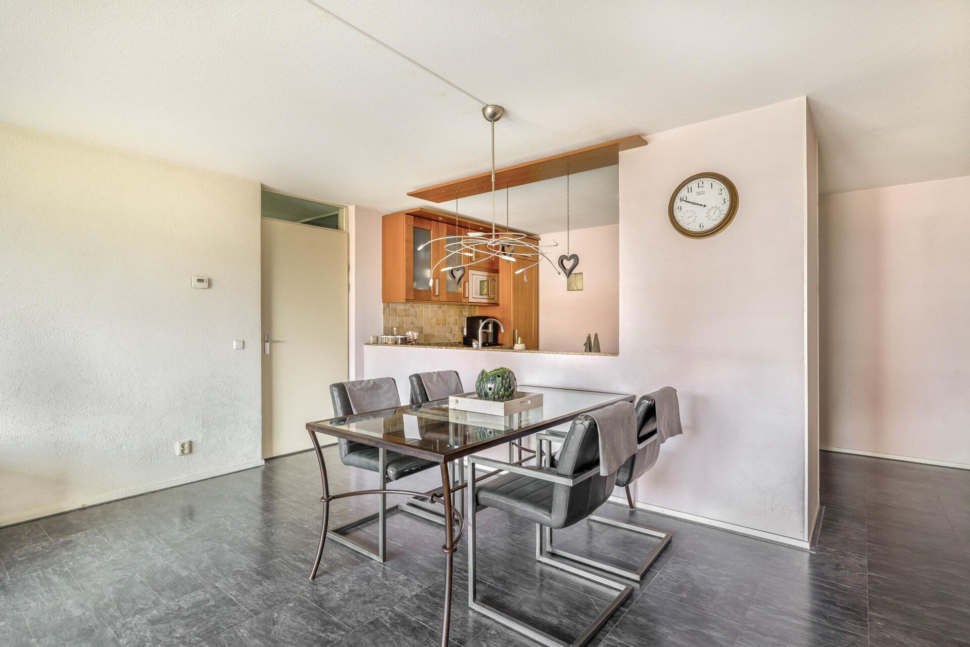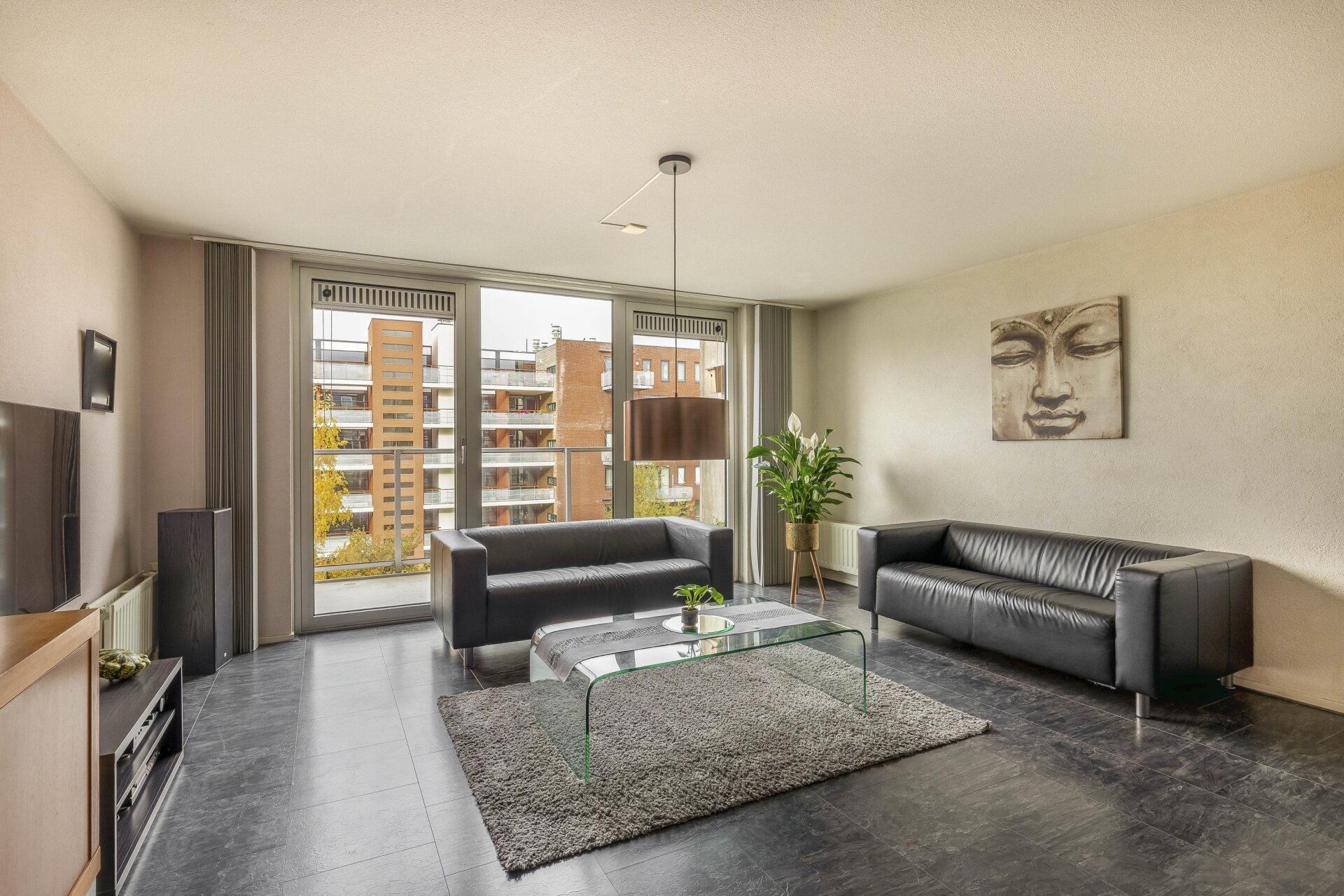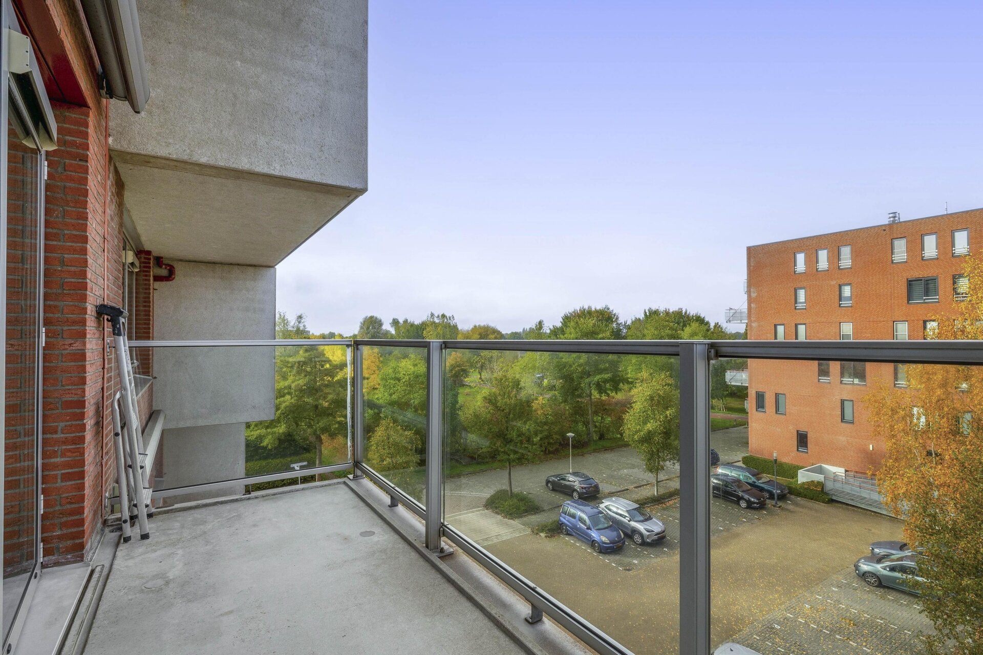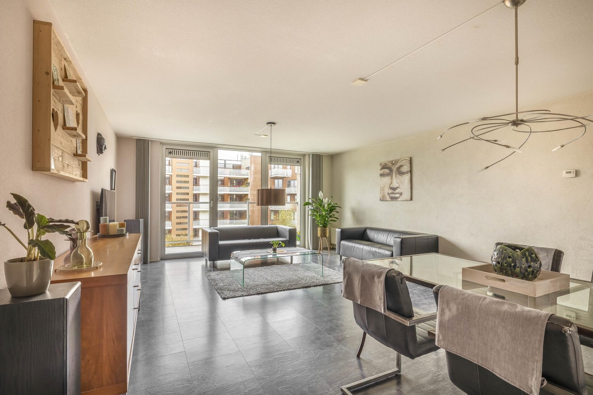 De woonkamer is opvallend ruim en lekker licht, dankzij de brede raampartijen over de volle breedte van het appartement. Hier kijk je vrij uit over de groene omgeving en loop je via de openslaande deuren zo het balkon op. Dankzij de westelijke ligging geniet je in de middag en avond van de zon, een perfecte plek om buiten te zitten met een boek of drankje. Aan de achtergevel hangt een zeer praktisch zonnescherm met grand volant tegen de laaghangende zon.