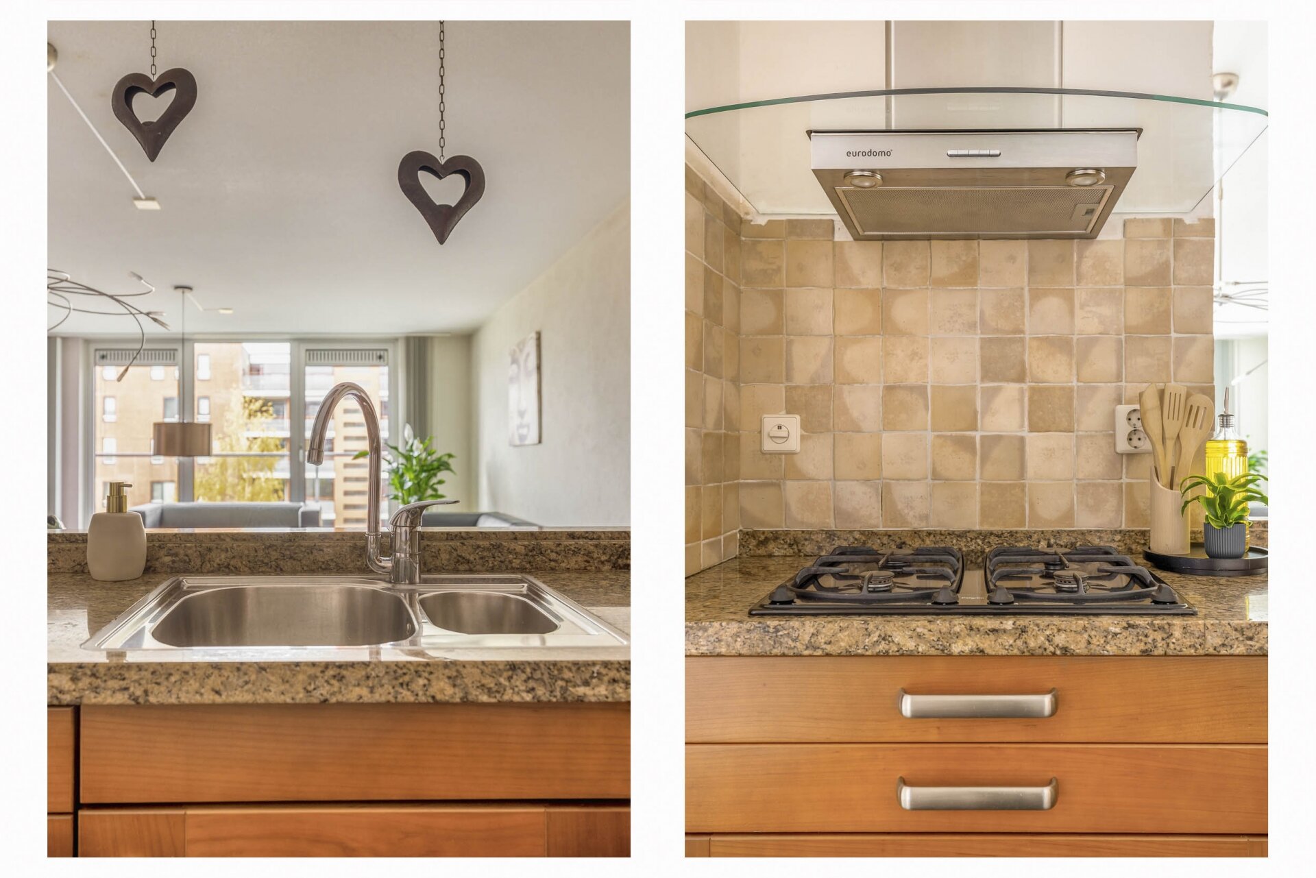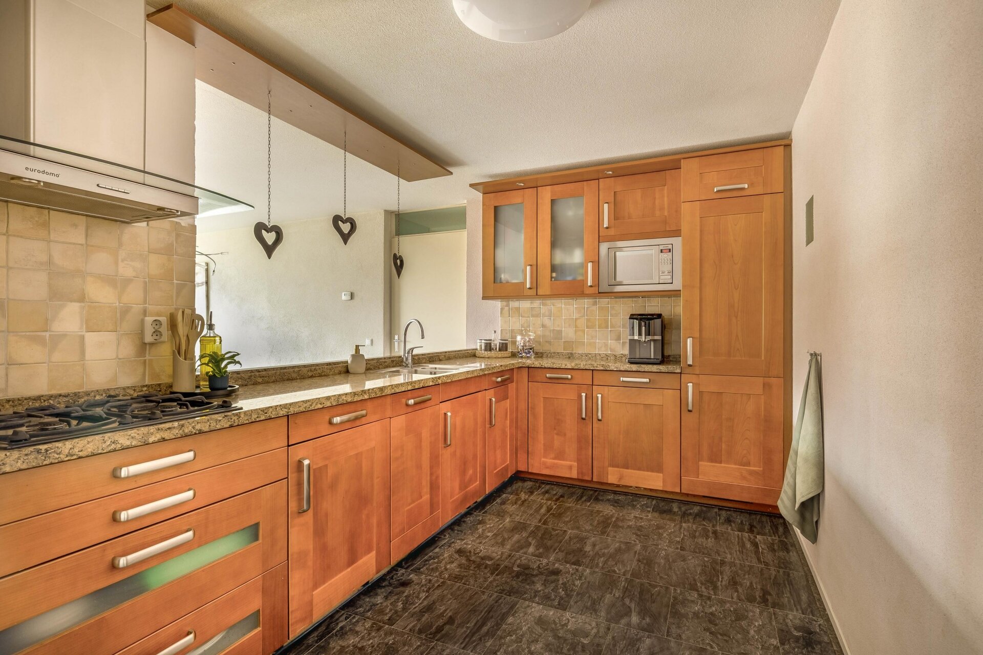 De woonkamer sluit aan op de halfopen keuken in een praktische L-opstelling. De warme kleurstelling van de fronten in combinatie met het natuurstenen werkblad geeft de keuken een tijdloze uitstraling. Uiteraard is deze voorzien van inbouwapparatuur, waaronder een gaskookplaat, magnetron, vaatwasser en koel-/vriescombinatie.