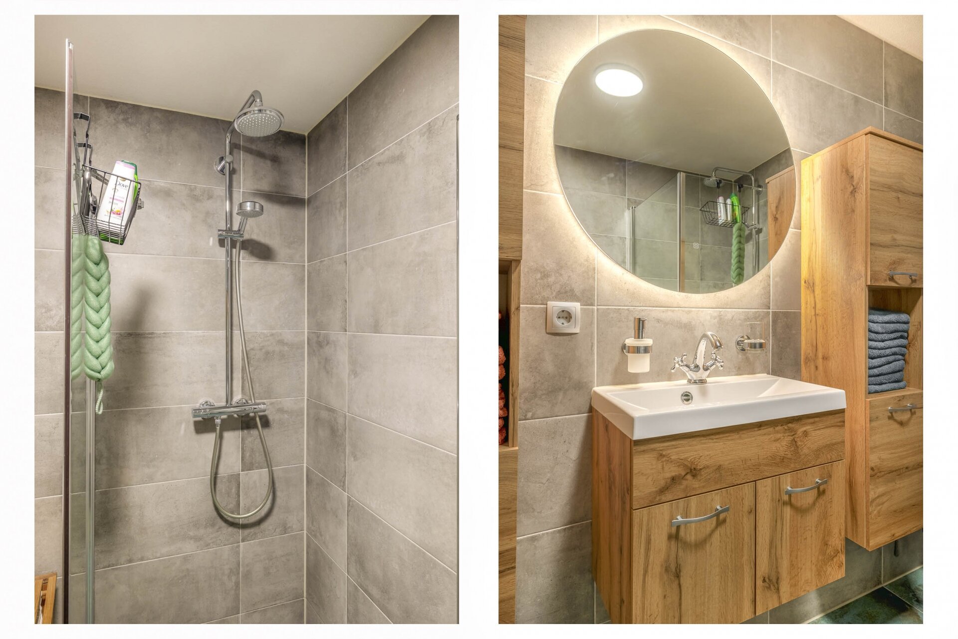 De badkamer is zo’n drie jaar geleden vernieuwd en straalt rust en comfort uit. Grote grijze wandtegels, houtlook meubel met wastafel, ruime inloopdouche en slimme bergruimte zorgen voor een fijne balans tussen praktisch en sfeervol. Het separate toilet is bereikbaar vanuit de hal.