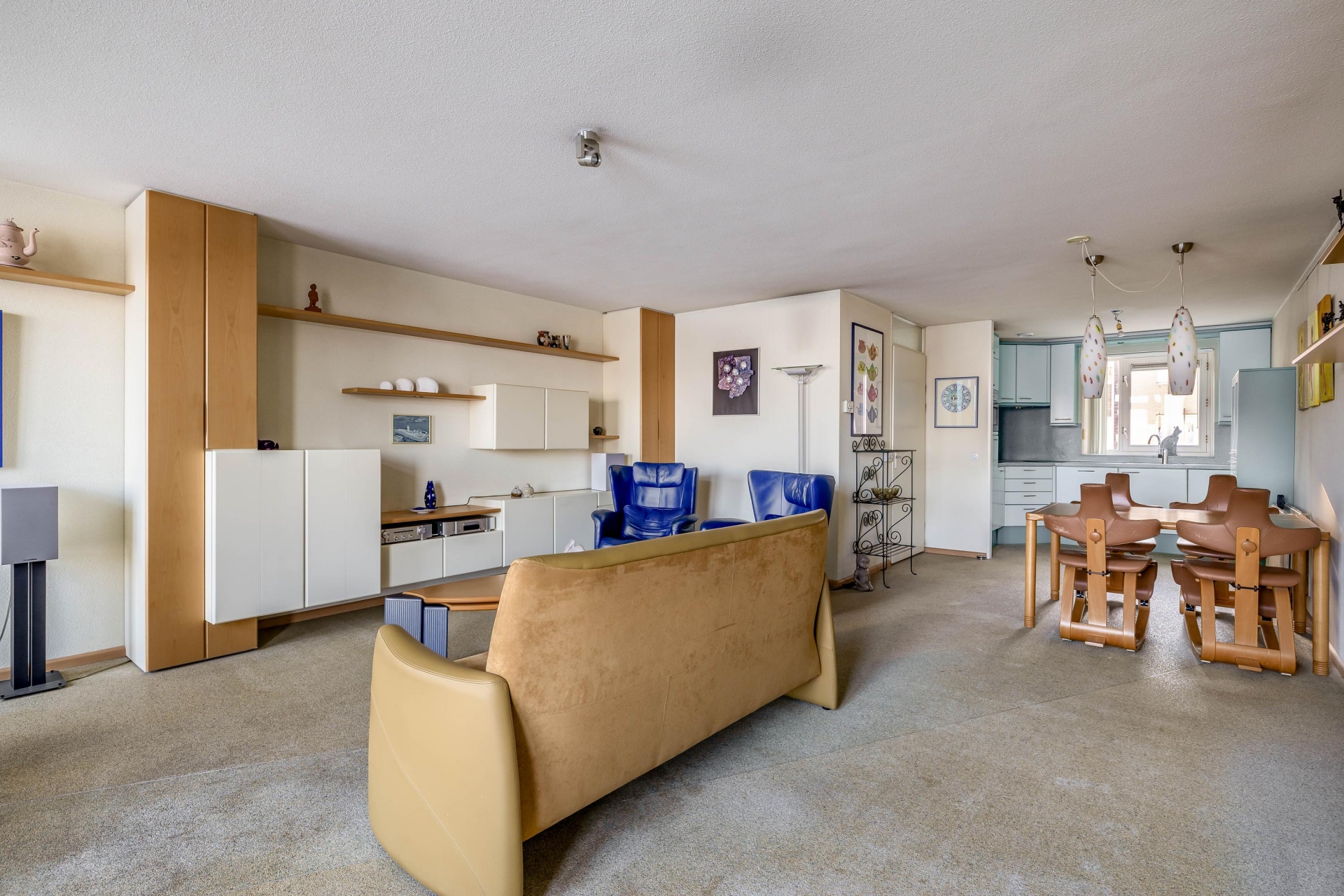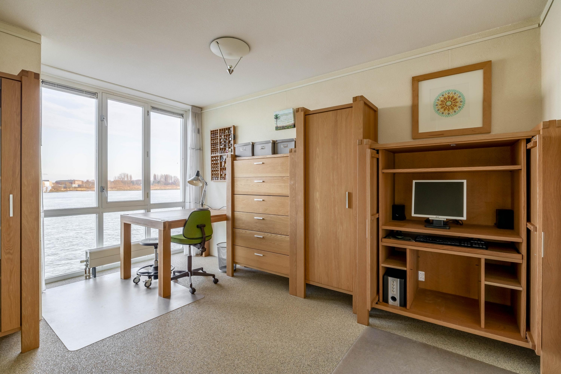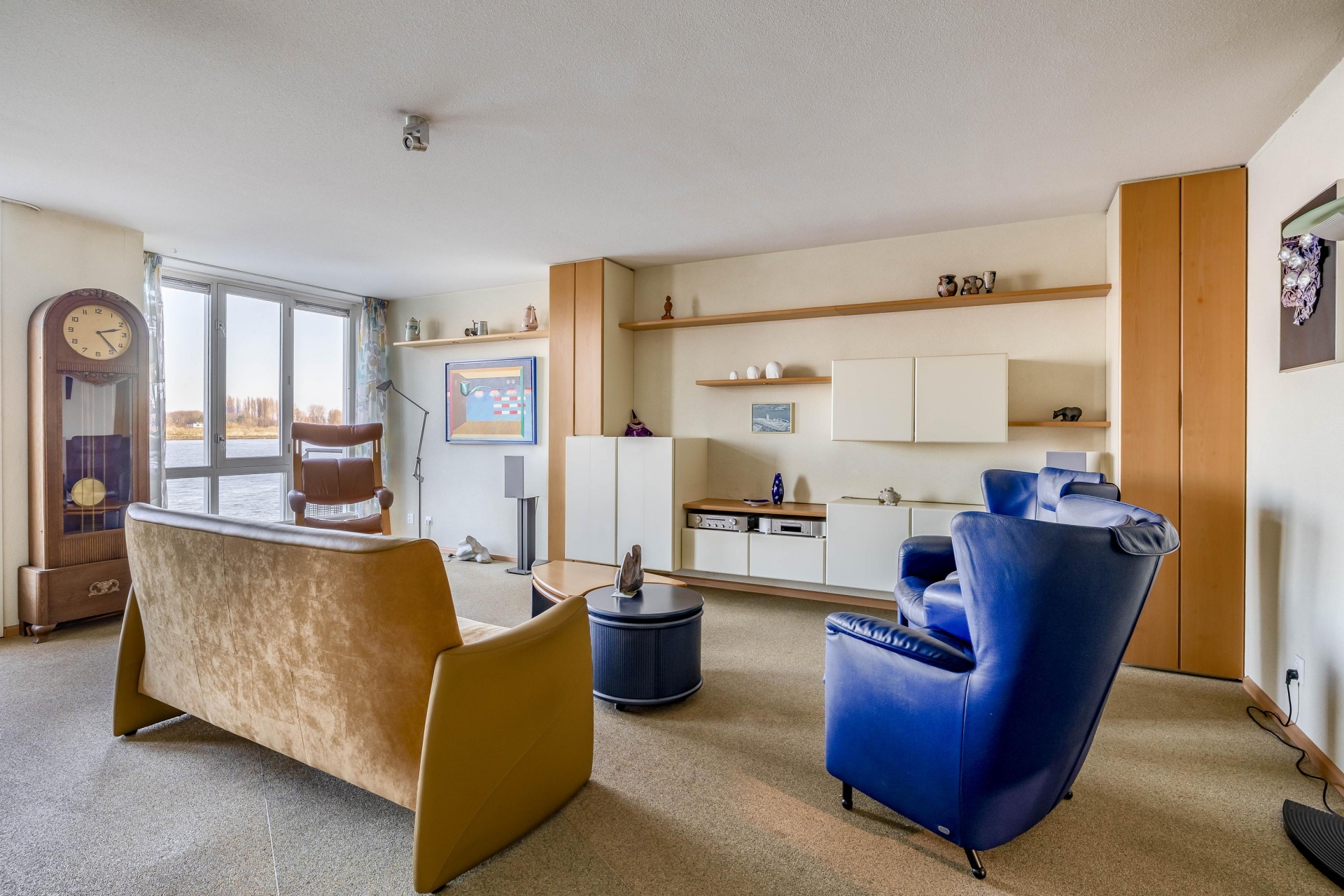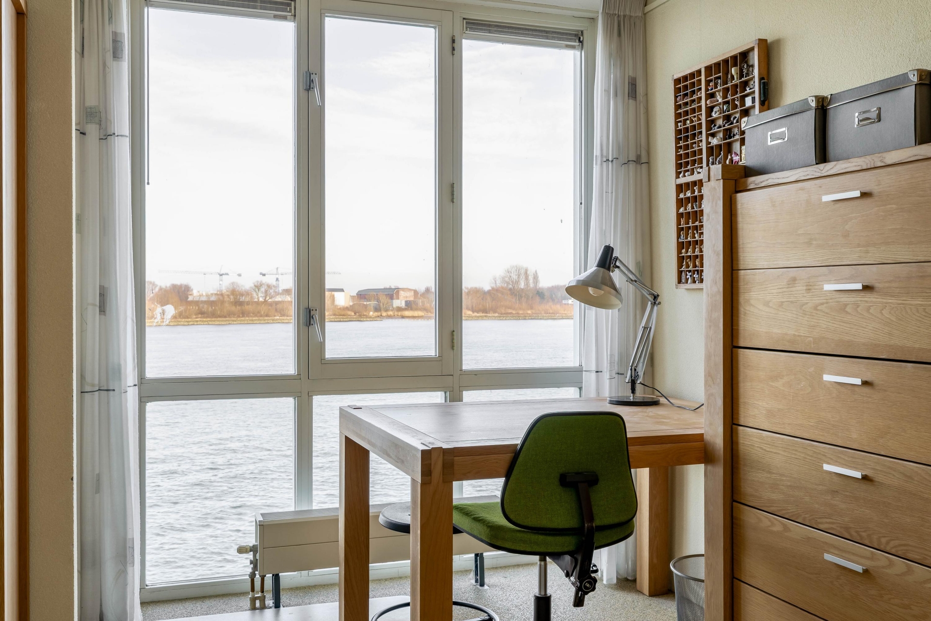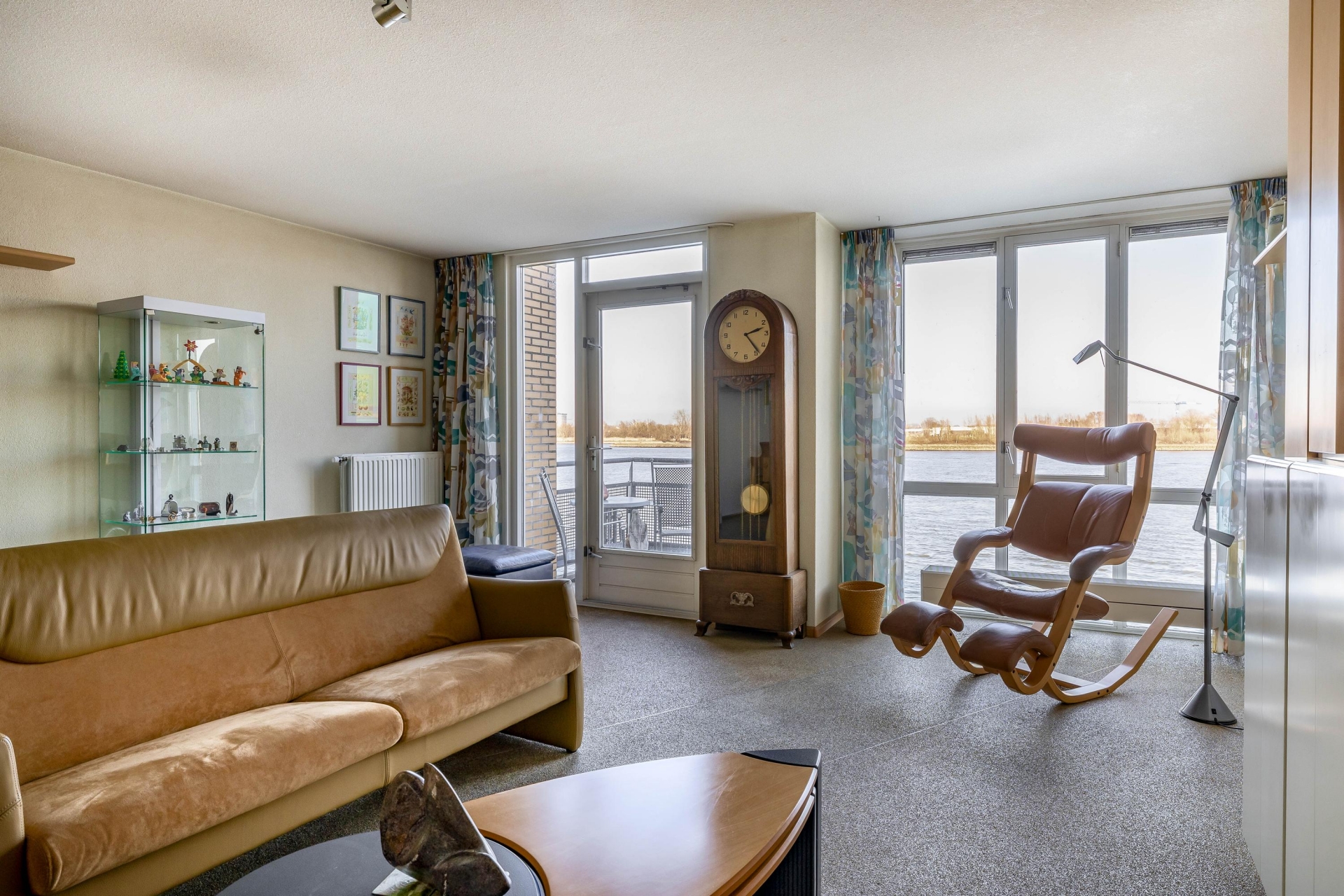 De woonkamer bevindt zich aan de achterzijde en biedt een fantastisch vrij uitzicht over de Nieuwe Maas. Dankzij de grote raampartijen geniet je hier van veel lichtinval. De woonkamer is voorzien van ITHO mechanische ventilatie en geeft toegang tot het balkon op het noordoosten.