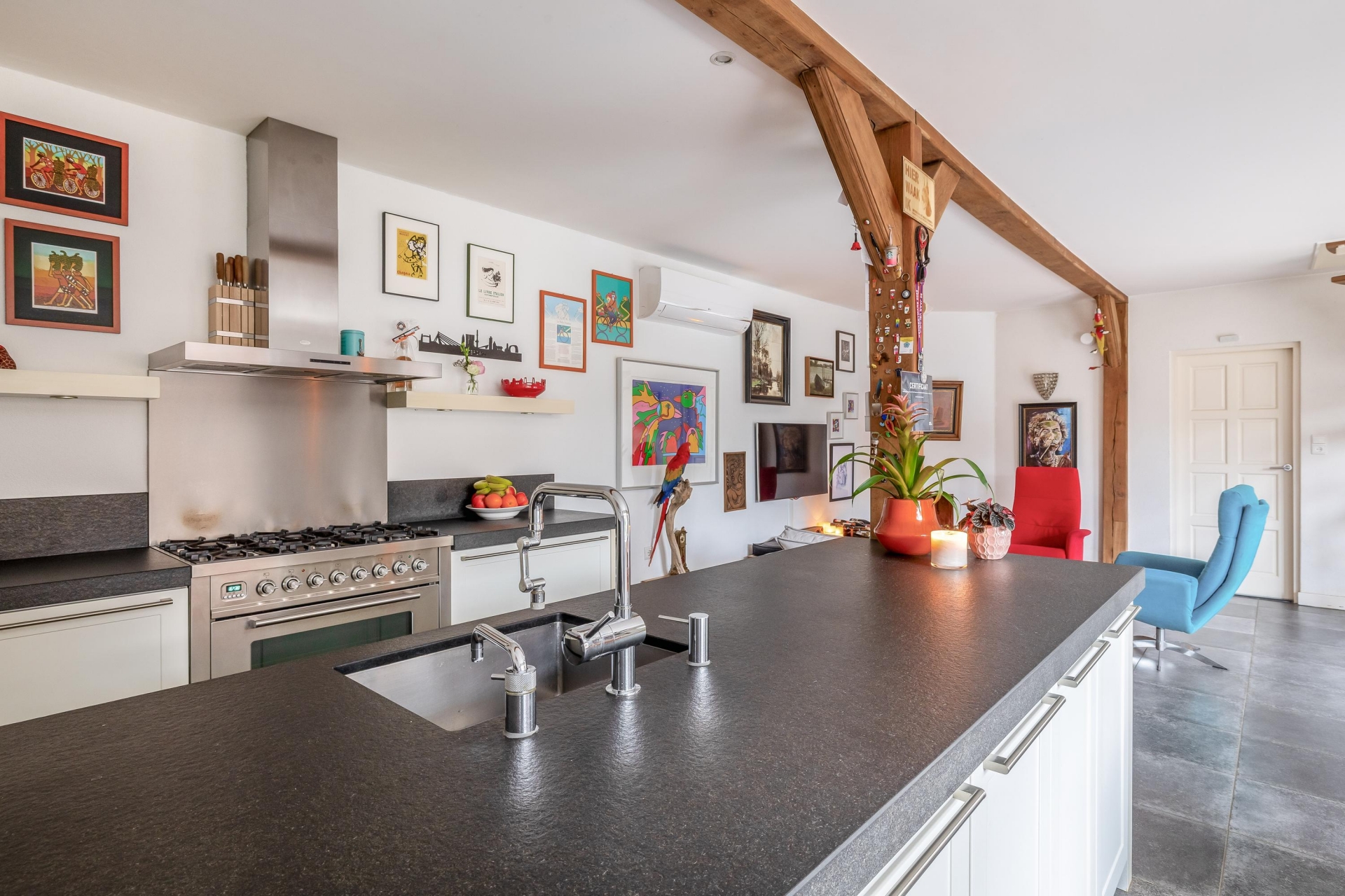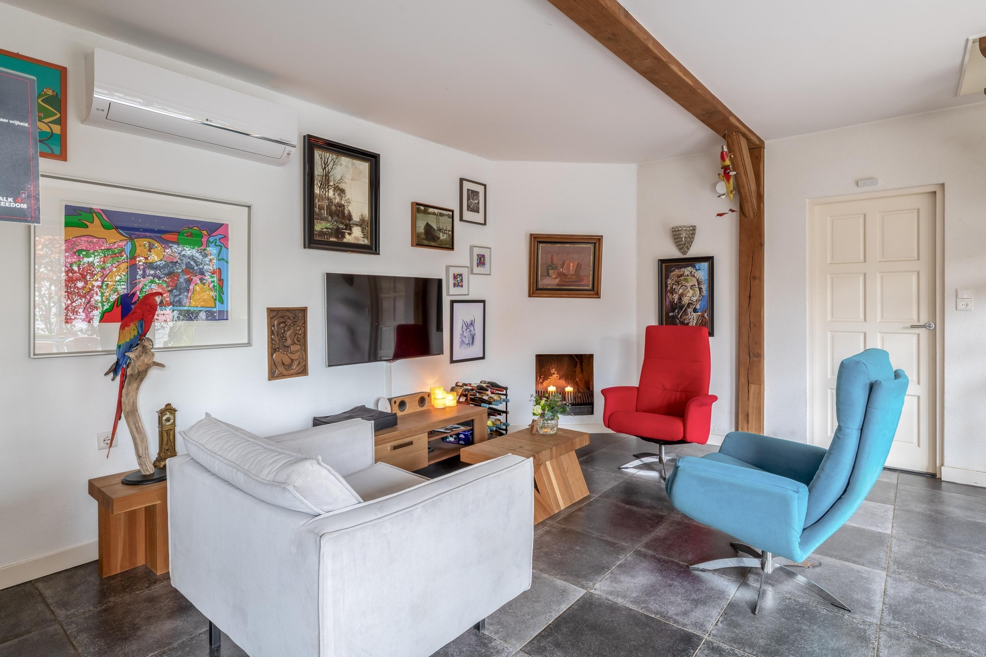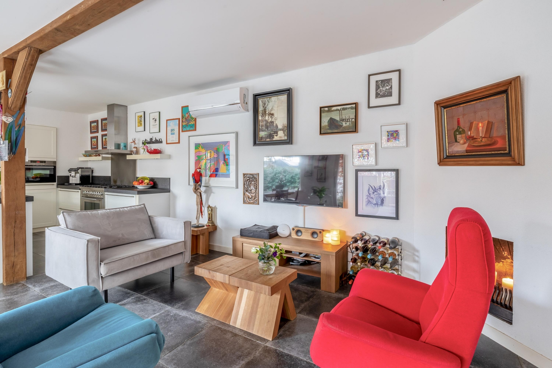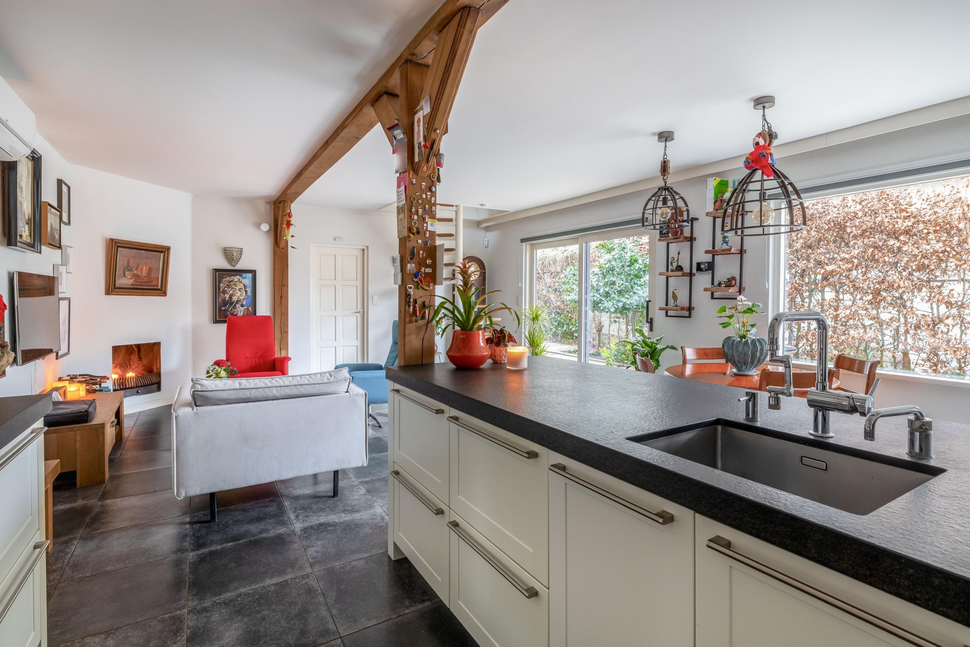 De begane grond vormt het hart van het huis. Woonkamer en leefkeuken lopen naadloos in elkaar over en creëren samen een royale leefruimte. De zichtbare houten balken zorgen voor karakter en warmte, terwijl de afwerking strak en verzorgd is. De zithoek is comfortabel ingericht met een haard als sfeervol middelpunt. Dankzij de airconditioning uit 2024 is het hier ook tijdens warme dagen aangenaam verblijven.