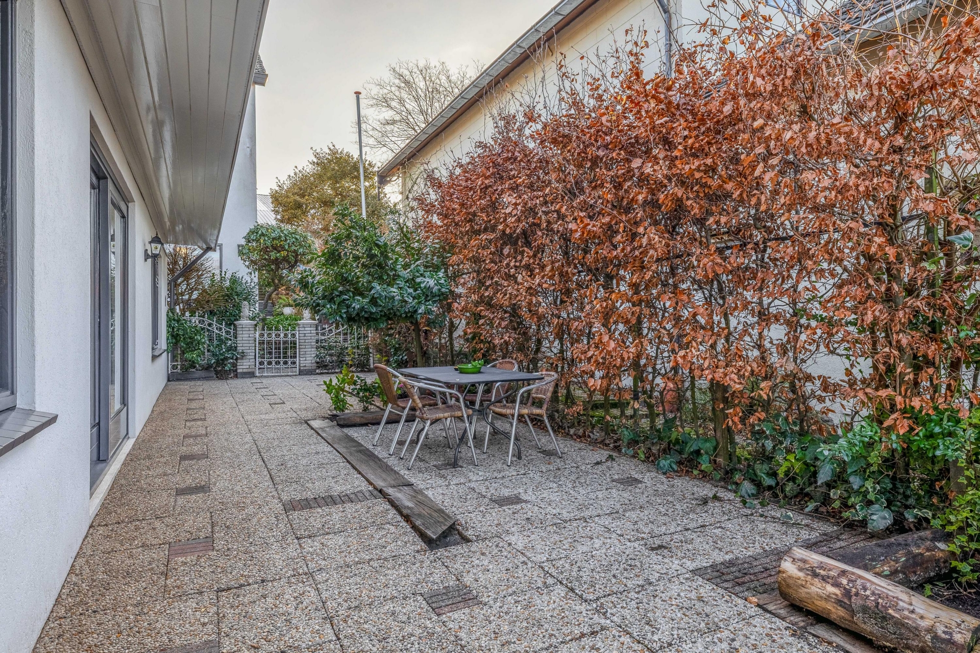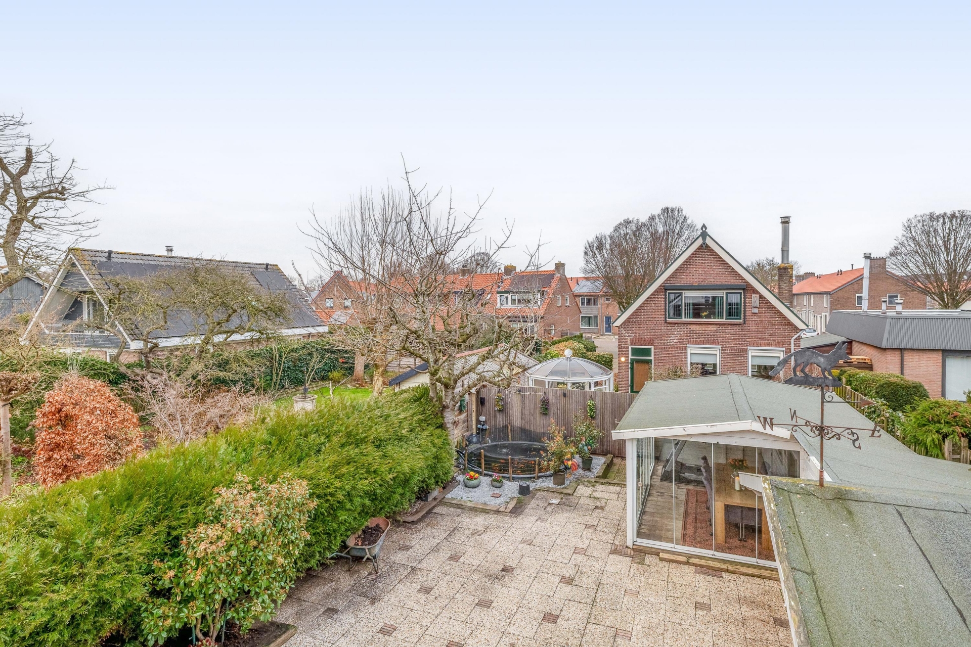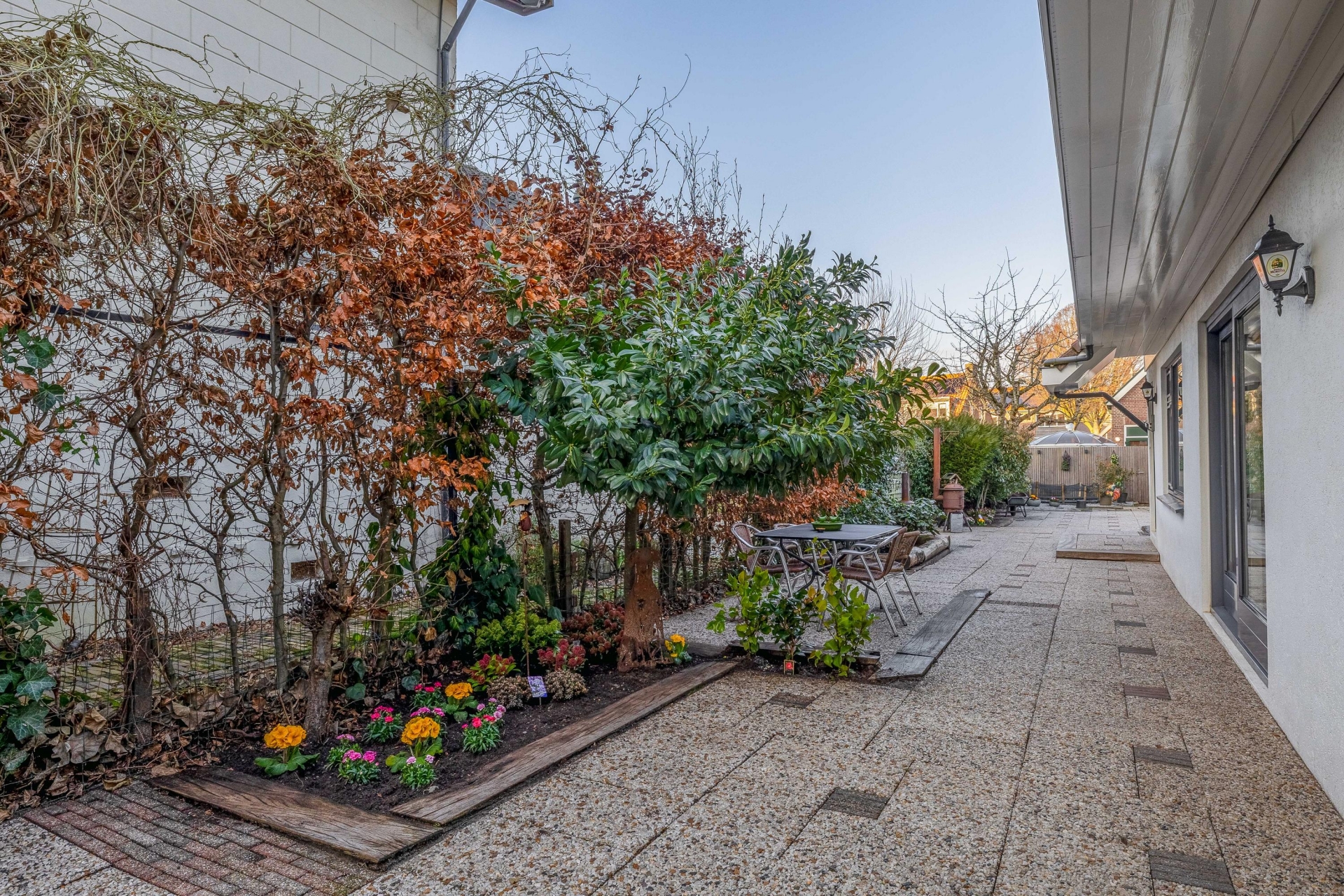 Het huis ligt op een royaal perceel van 332 m² en beschikt over een beschut gelegen tuin. De tuin is ruim van opzet, biedt veel privacy en is onderhoudsvriendelijk ingericht. Er zijn meerdere fijne zitplekken, waardoor je op elk moment van de dag een prettig plekje vindt.
