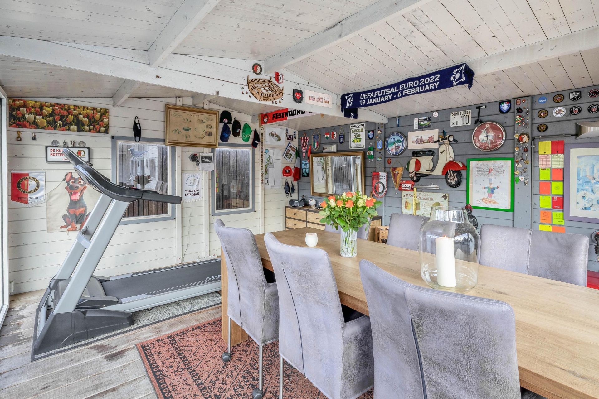Achter in de tuin staat een sfeervol tuinhuis dat is ingericht als gezellige buitenkamer. Een plek waar je lange avonden doorbrengt, het hele jaar door. Ook een andere invulling, zoals bijvoorbeeld een praktijkruimte kan hier overigens uitstekend!