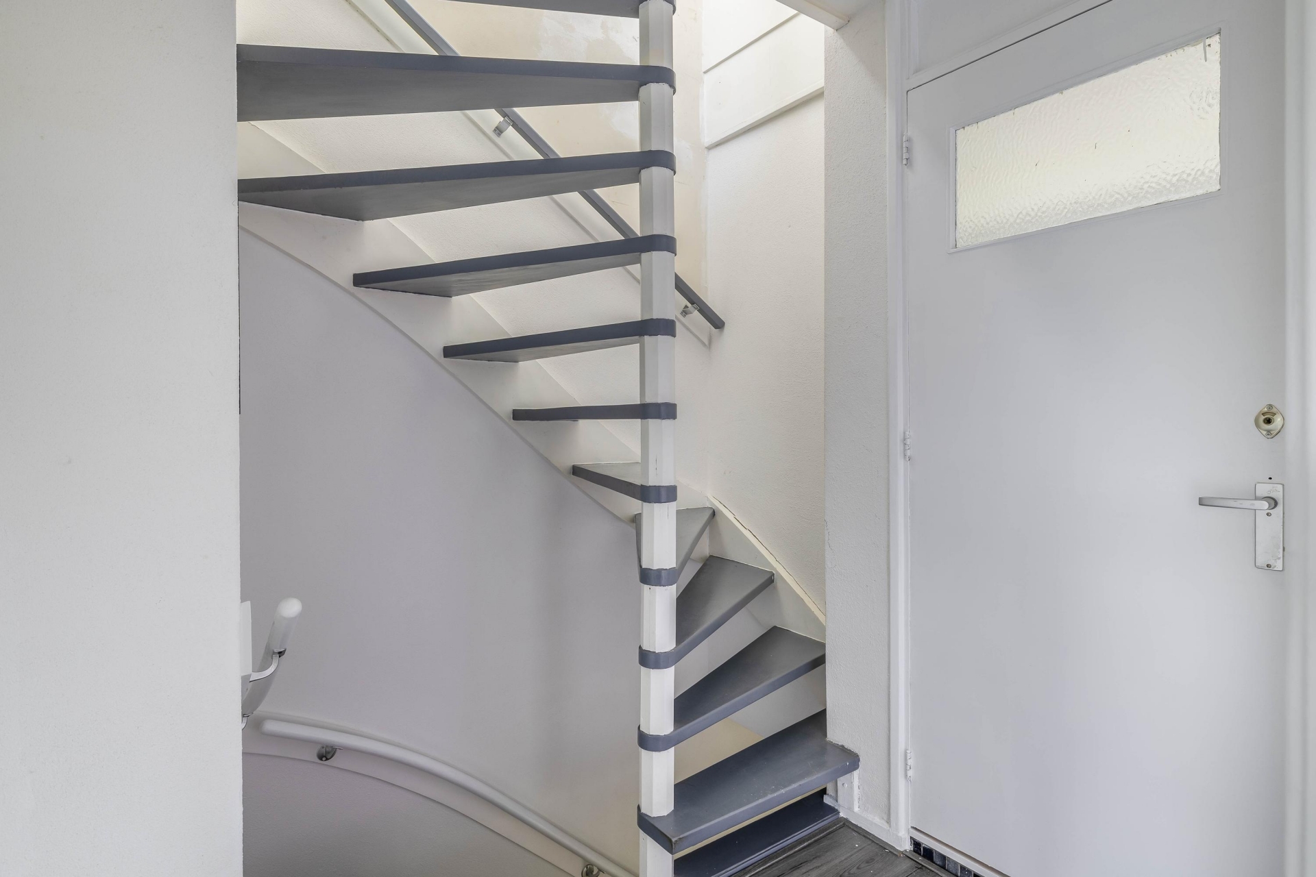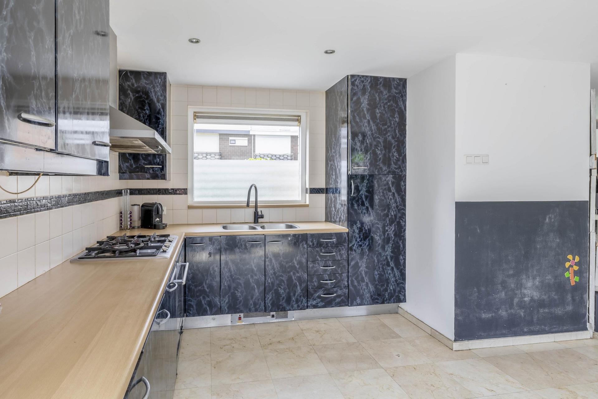 De keuken is praktisch geplaatst en biedt voldoende opbergruimte en werkblad. Ook op de begane grond bevindt zich een hal met trapopgang en een toiletruimte.