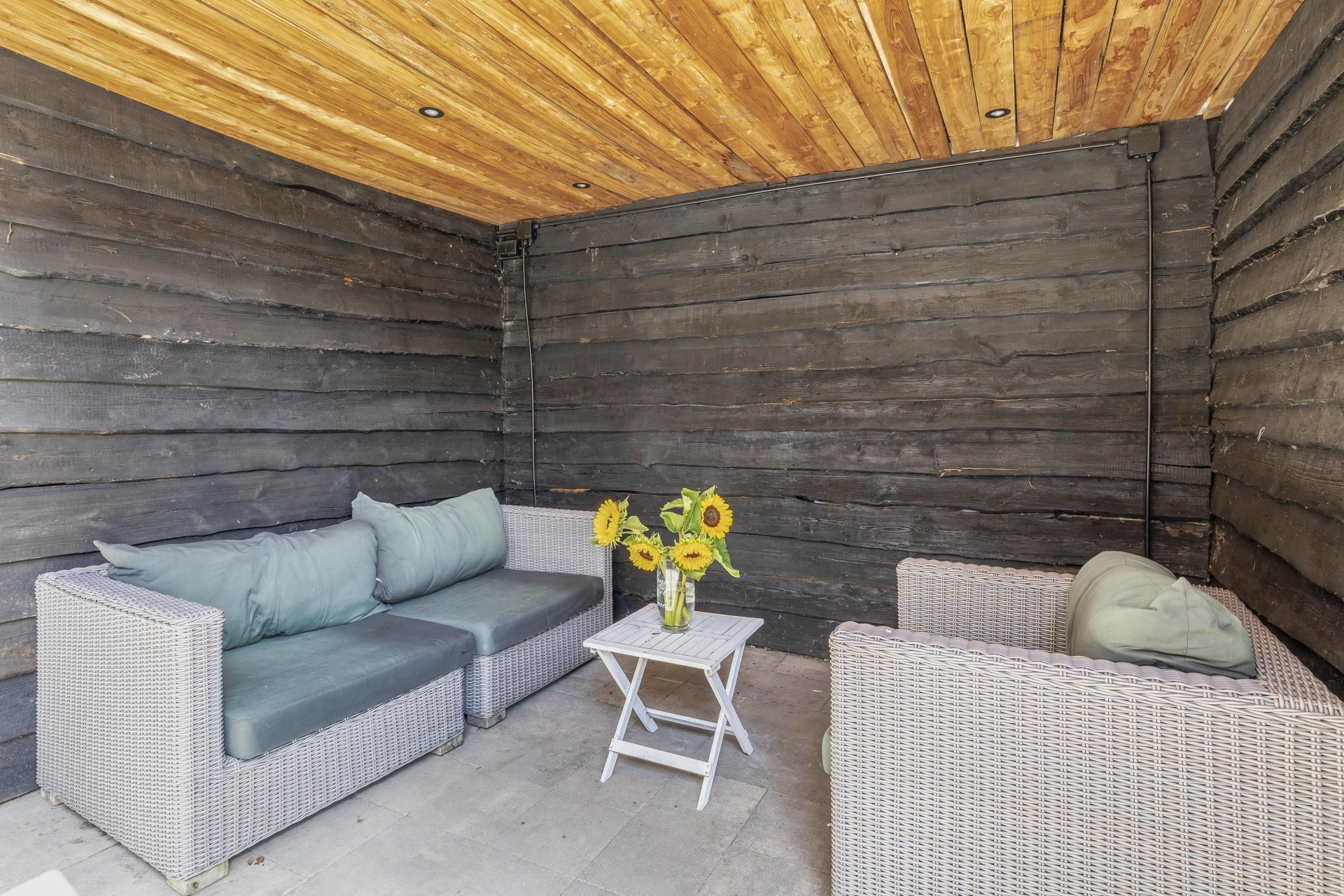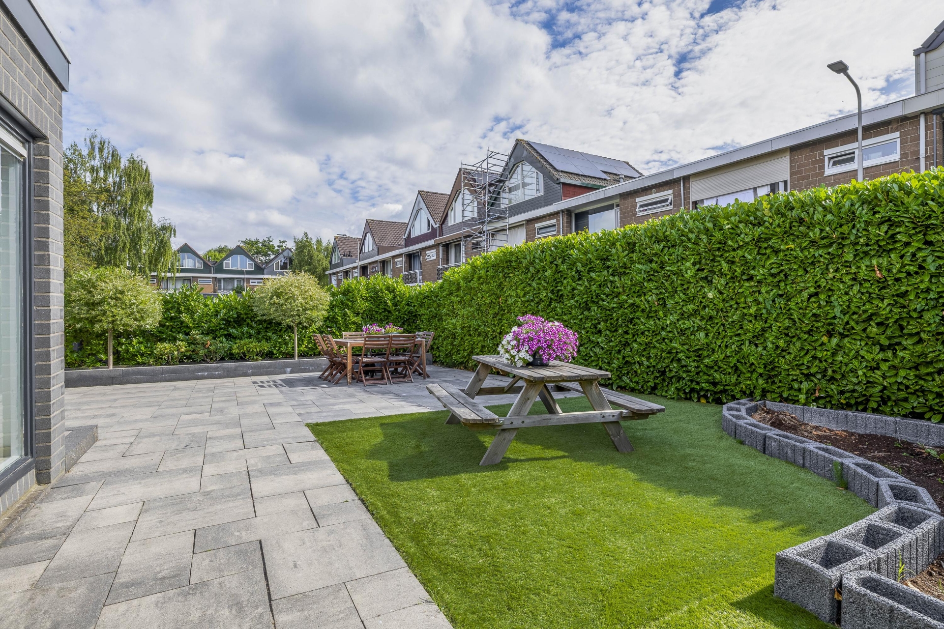 Wat dit huis écht onderscheidt is de buitenruimte. Zelden zie je zulke royale tuinen rondom een woning in deze prijsklasse. De achtertuin is gelegen op het noorden, maar dankzij de vrije ligging en grootte vang je hier de hele dag zon – van ochtendzon in de voortuin tot avondzon op het terras achterin. De tuin is netjes aangelegd met sierbestrating, kunstgras, borders én een fijne zithoek onder een houten overkapping.