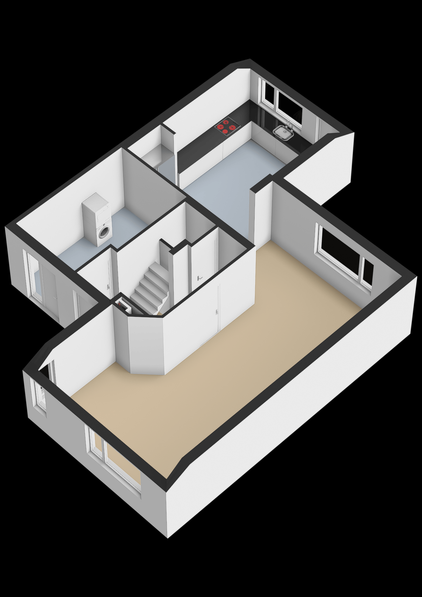 De woonkamer ligt centraal in het huis, heeft een oppervlakte van ca. 36 m² en biedt voldoende ruimte voor een ruime zithoek en eettafel. Grote ramen zorgen voor prettig daglicht en een open sfeer.