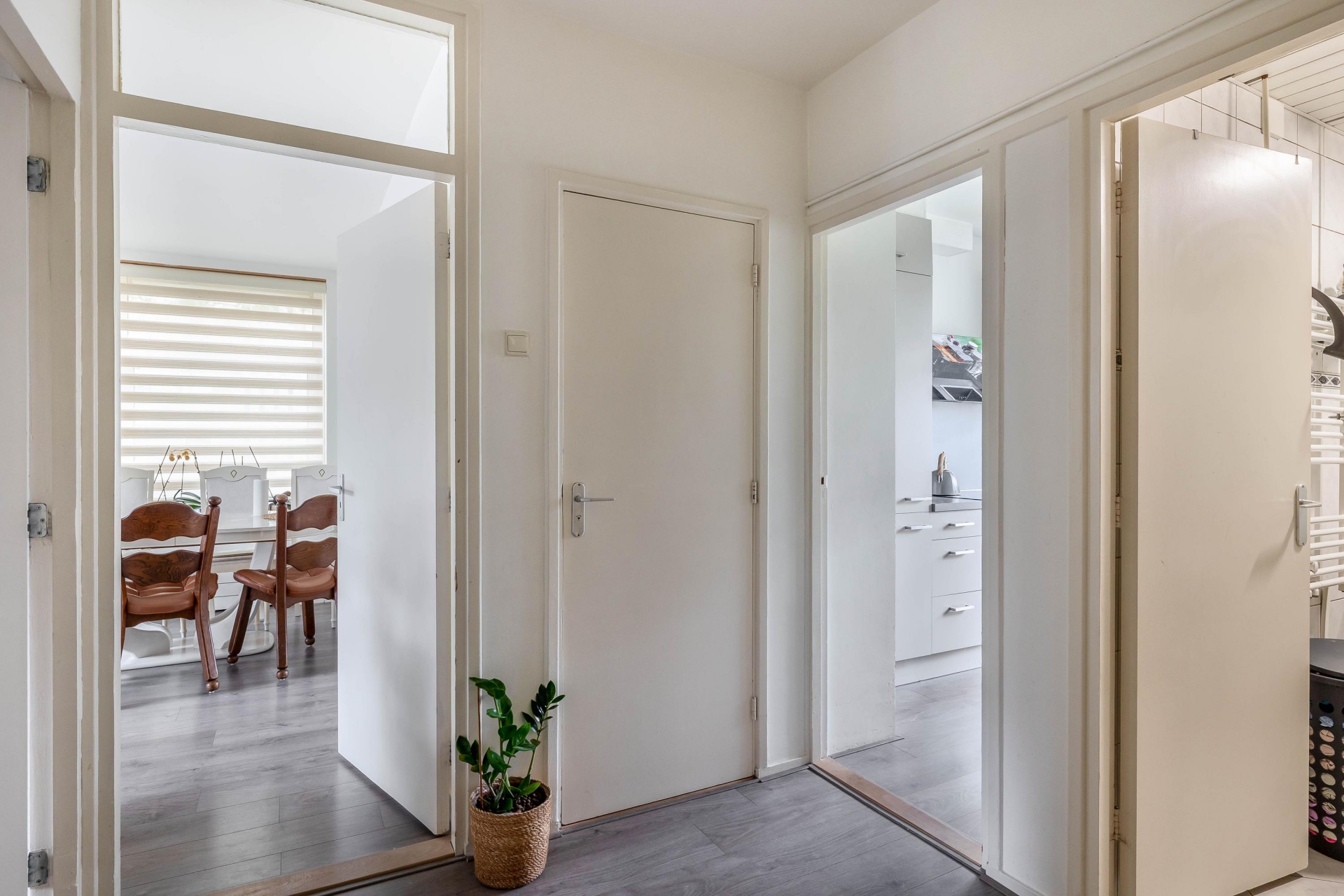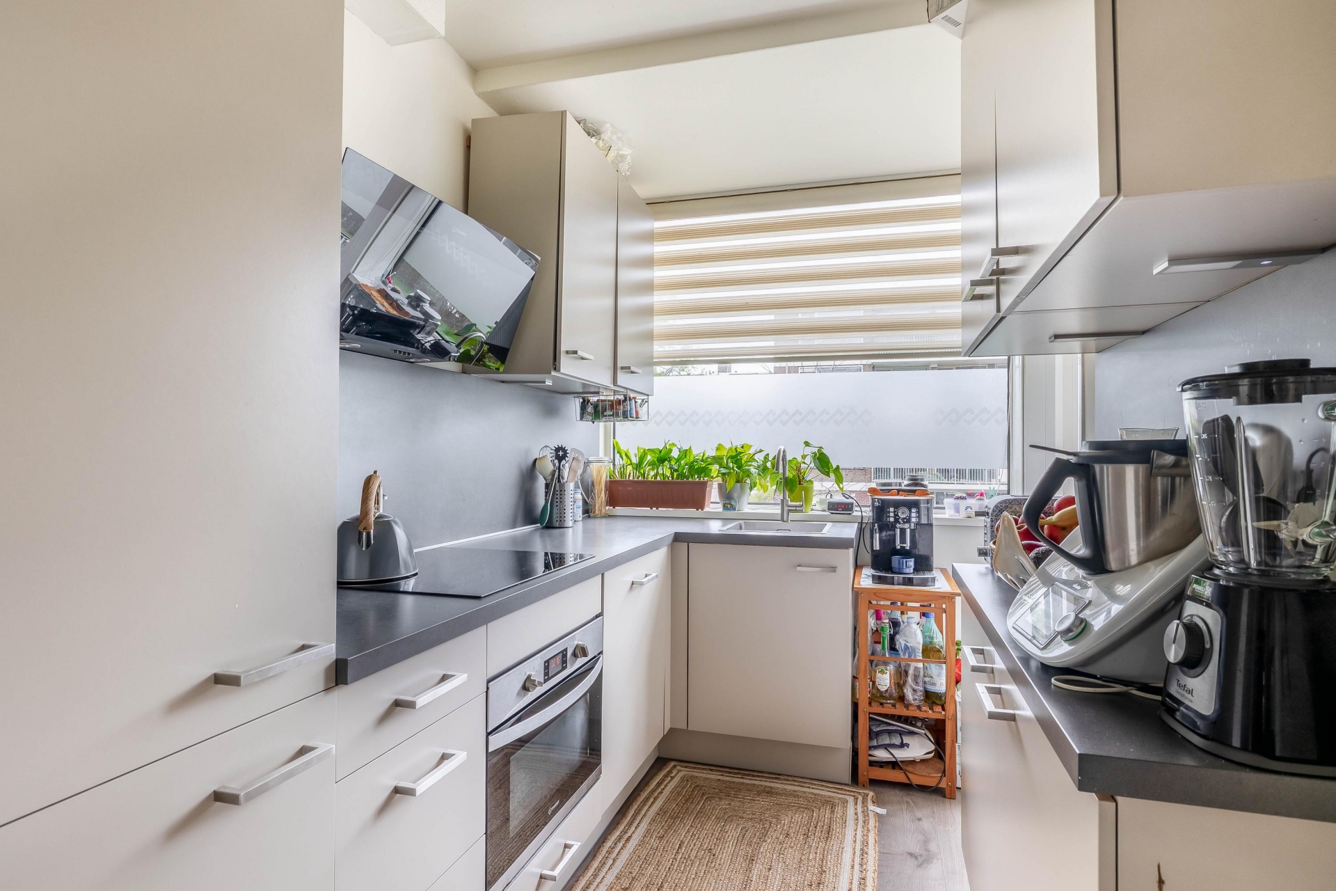 De keuken is functioneel ingericht en biedt voldoende kastruimte en aansluitingen voor apparatuur. In de badkamer vind je een douchecabine, wastafelmeubel en de aansluiting voor wasmachine en droger. Het separate toilet bevindt zich in de hal.